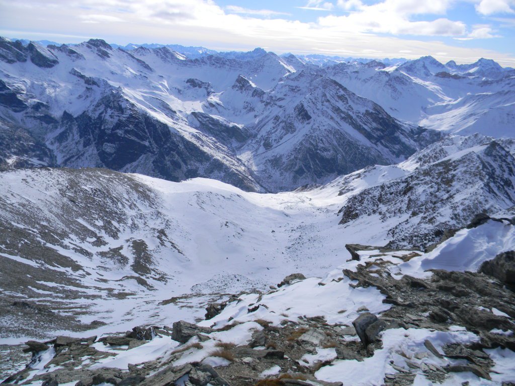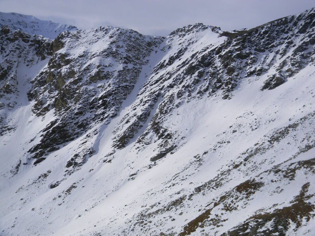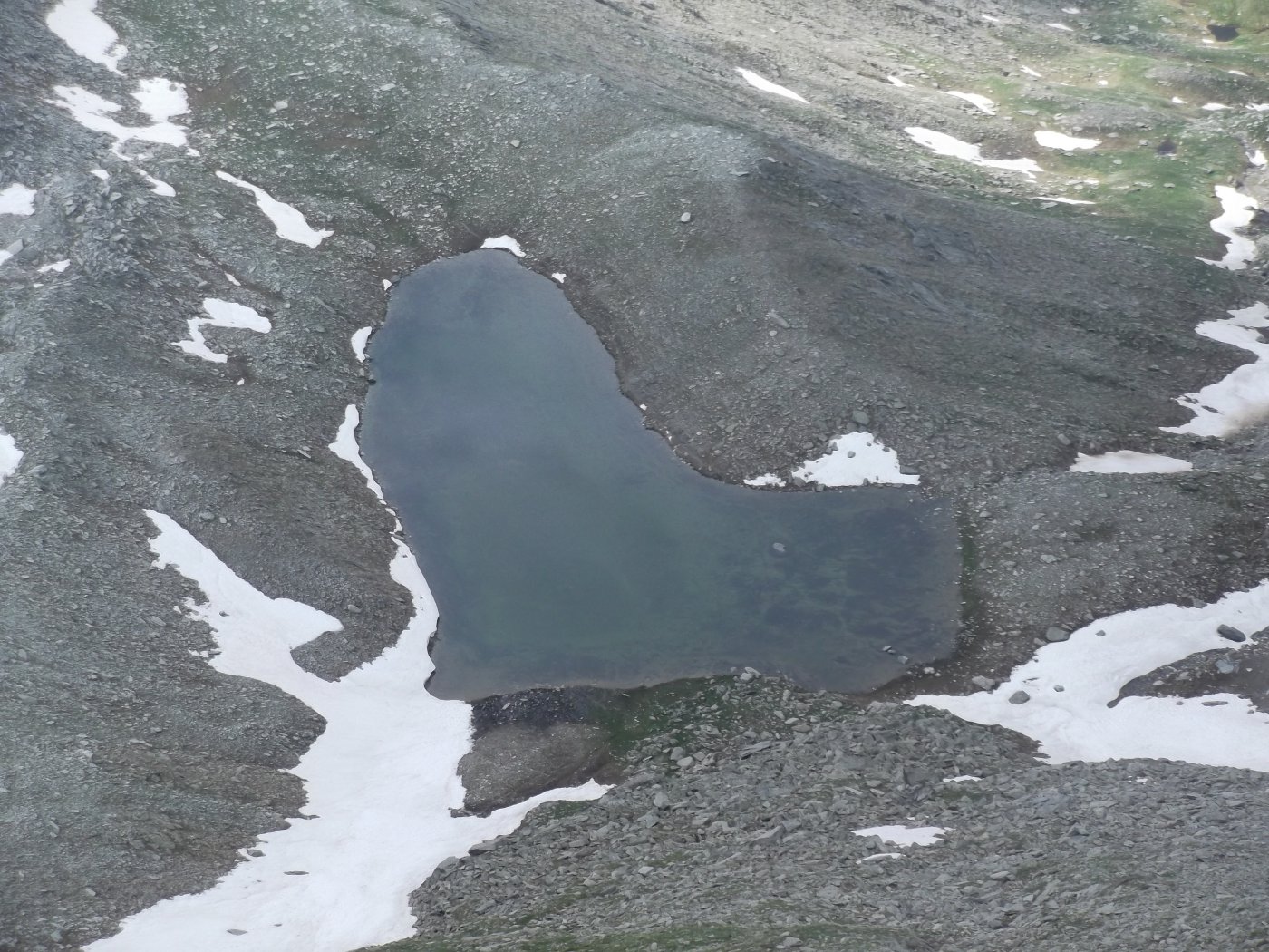 A differenza della via escursionistica che andrebbe a destra, si passa a sinistra del lago, in maniera libera anche perché non ci sono riferimenti, percorrendo i pendii non troppo ripidi, a sinistra della Cima. Per arrivare in cresta ci sono diversi canalini. Con neve uno è nettamente più evidente e parte proprio sulla verticale del lato, si può salire fino all’uscita (200 m 40° max 45°) o, più comodamente, seguirlo per un tratto quindi prendere un ramo di dx che porta comunque in cresta poco più a monte (piccozza e ramponi indispensabili).