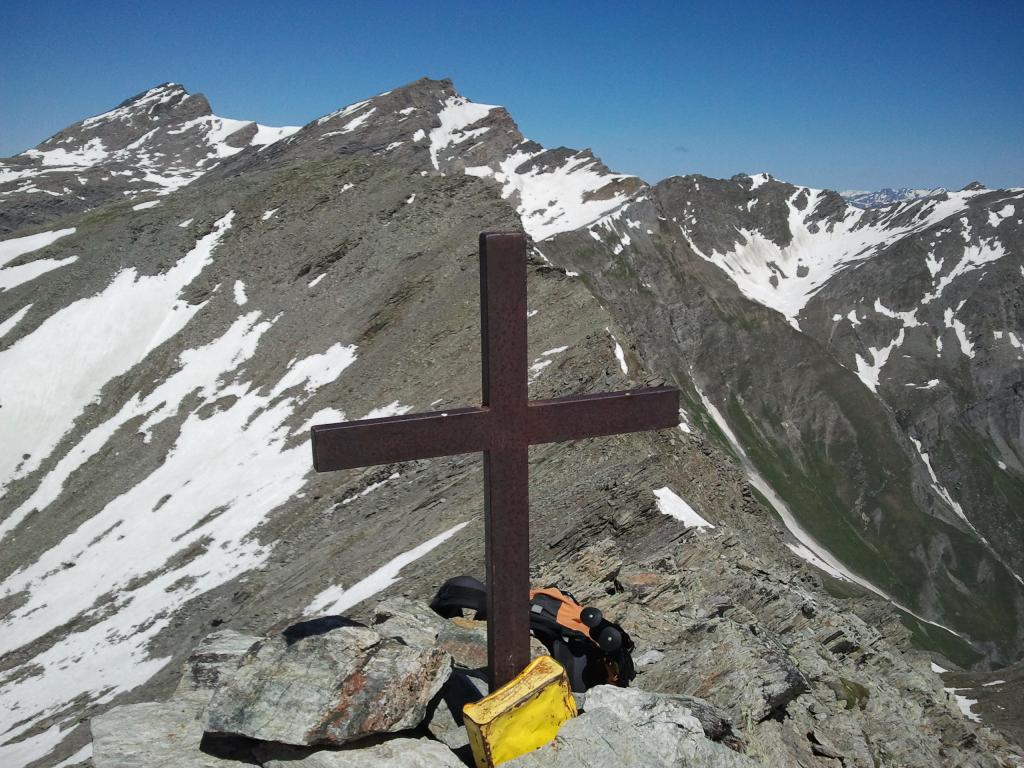 Come dicevo prendiamo a sinistra, la salita era comoda, anche se ovviamente fuori traccia, nessun riferimento; proseguiamo dove più ci piaceva e sfruttando un piccolo canale arriviamo in cresta, e capiamo che avremmo dovuto voltare a destra per raggiungere la vetta; poco dopo la croce del Ferra conferma il nostro pensiero.