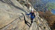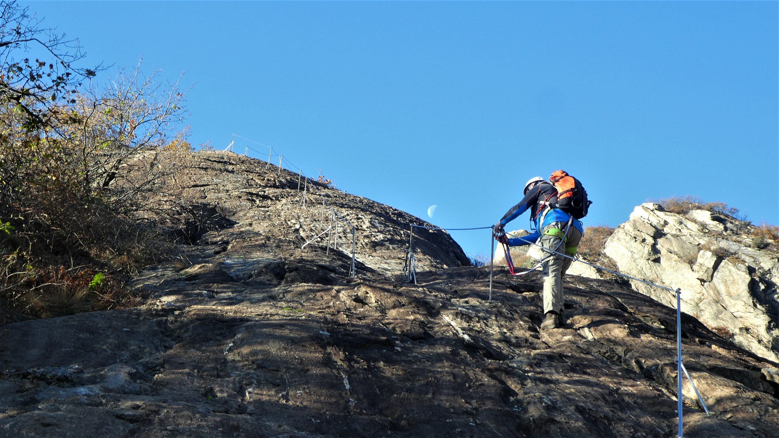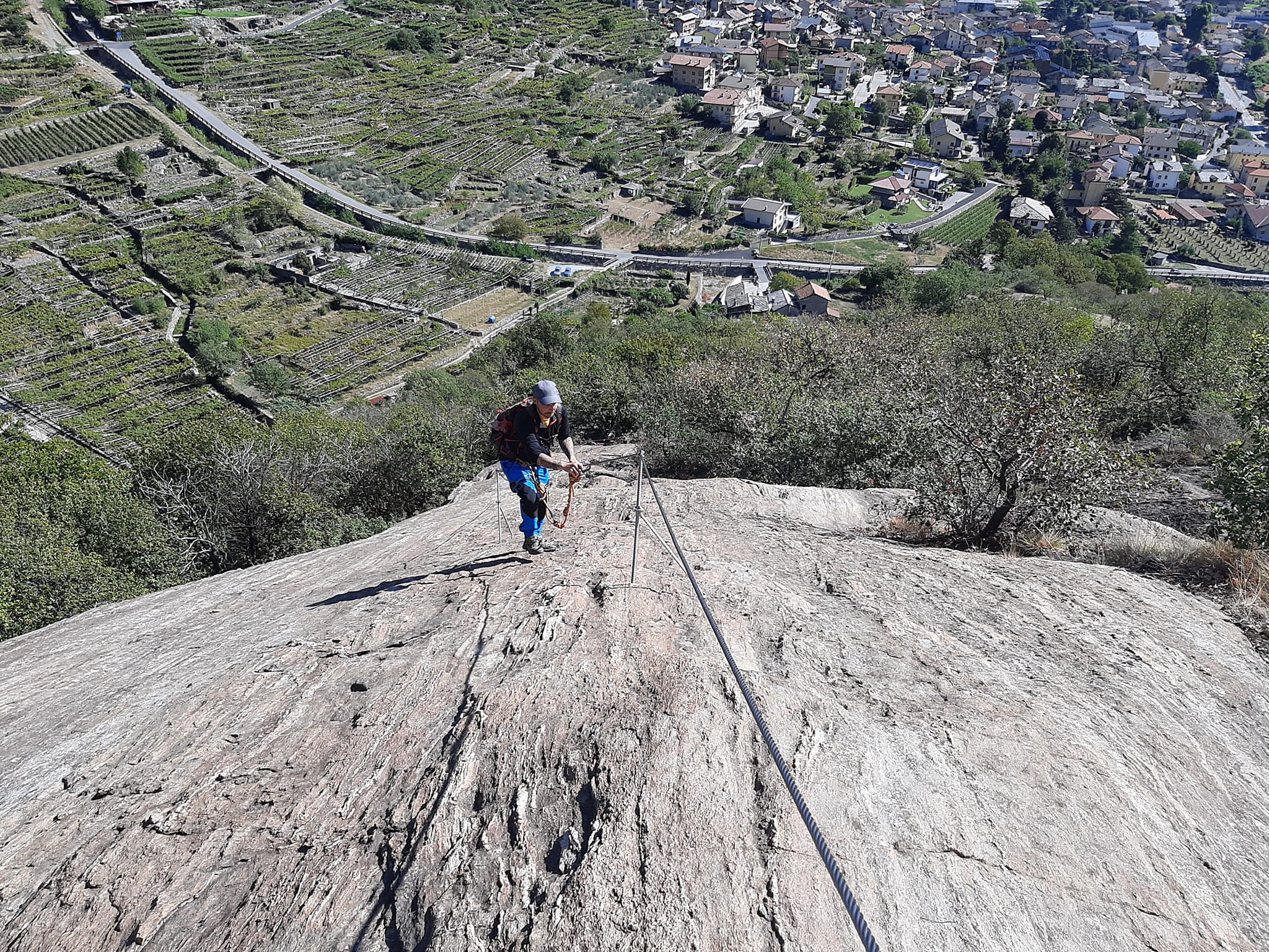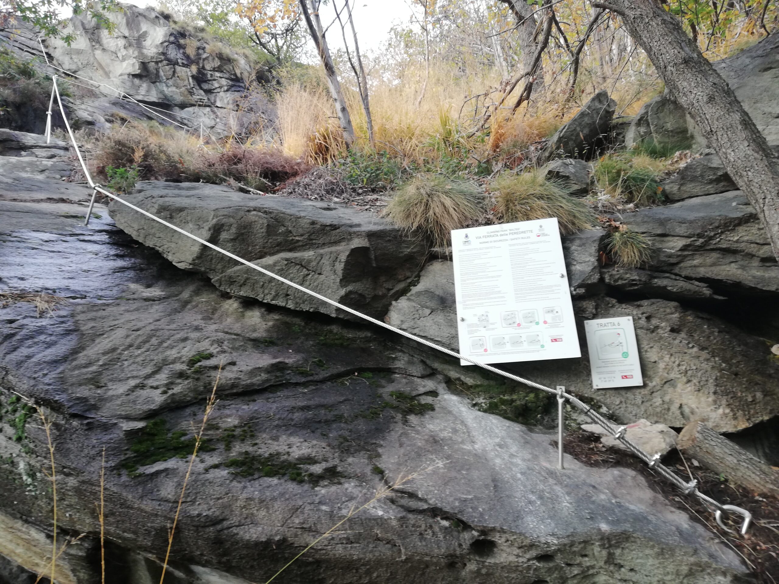 Seguendo i cartelli gialli si percorre una breve sterrata in mezzo ai vigneti ed un breve tratto in mezzo ai castagni, sentiero sempre evidente. Ferrata molto semplice adatta anche come prima esperienza.