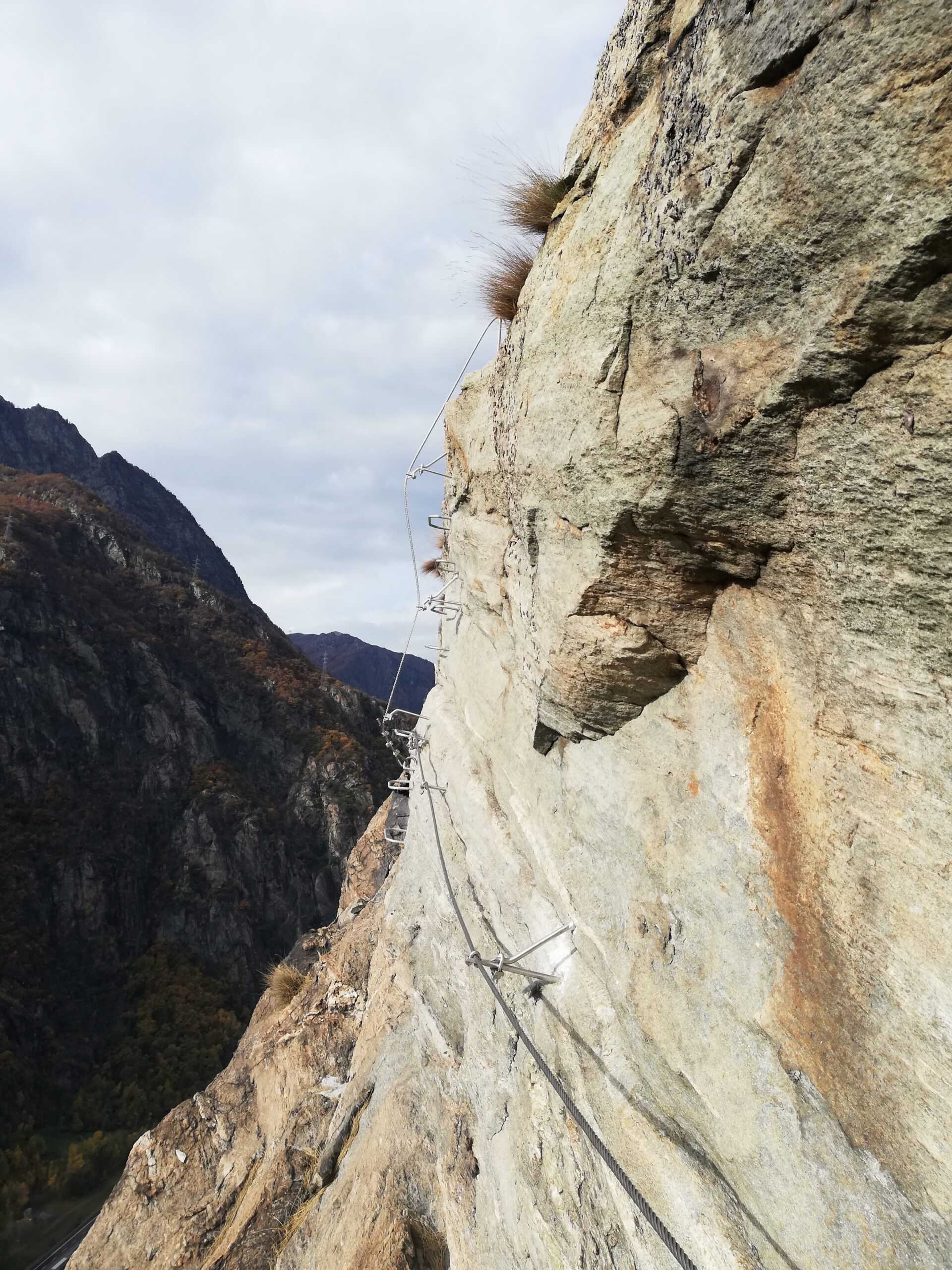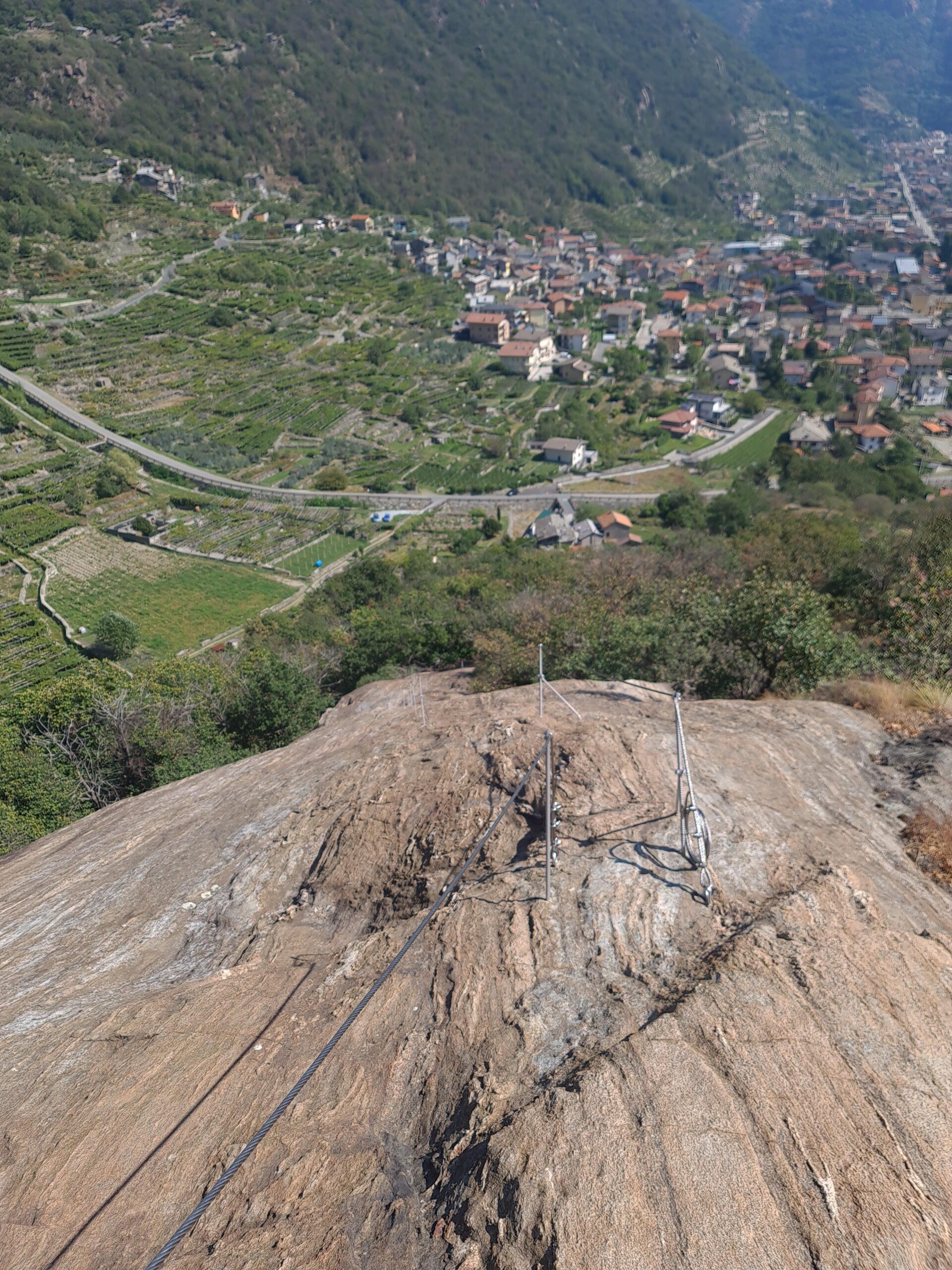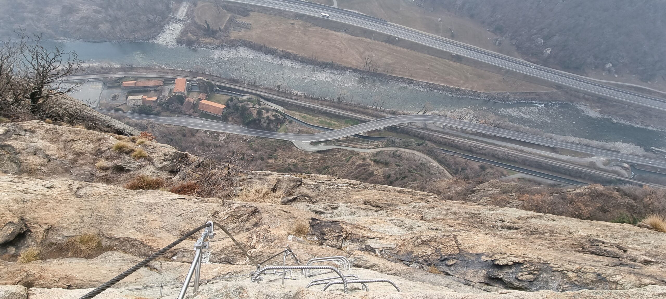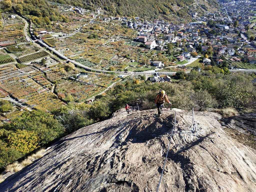 Attrezzata con gradini e cavo d’acciaio, suddivisa in 2 settori principali. Verso la fine è presente una breve variante esposta con alcuni gradini a picco sulla sottostante Statale 26. Si giunge infine su comodo terrazzo adiacente le palestre di roccia da cui si seguono le indicazioni e le frecce gialle per la discesa a Donnas passando dal Vallone di Prele dove presente un masso attrezzato con vie impegnative.