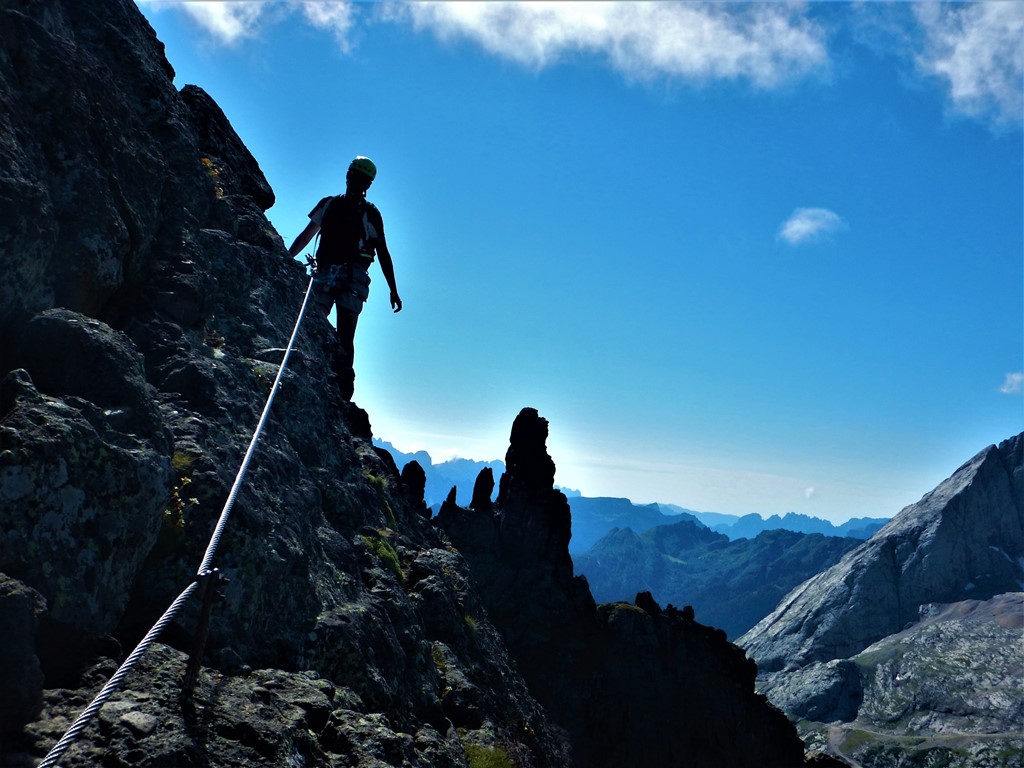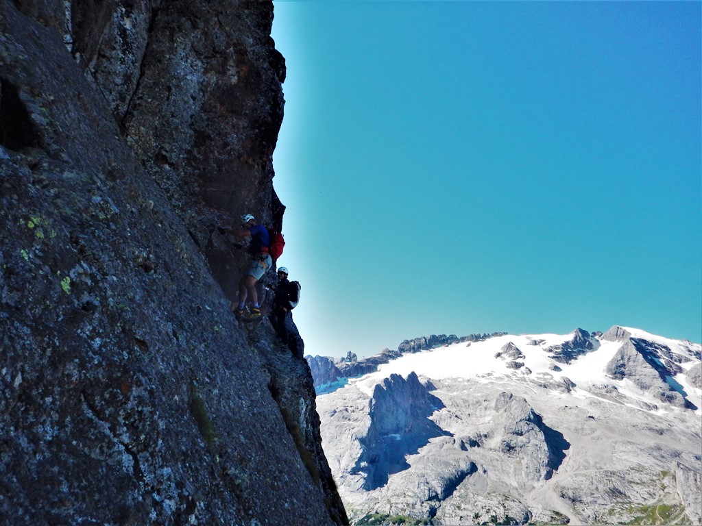Saliti a Porta Vescovo dalla diga del Fedaia, primo tratto della ferrata abbastanza duro, complice anche l’expo ovest e la roccia umida, poi in cresta il percorso diviene decisamente meno impegnativo e di grande bellezza. Salito il bel torrione (facoltativo) a metà itinerario, che, a dispetto dei numerosi scalini, dice la sua…