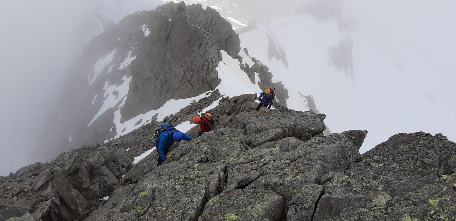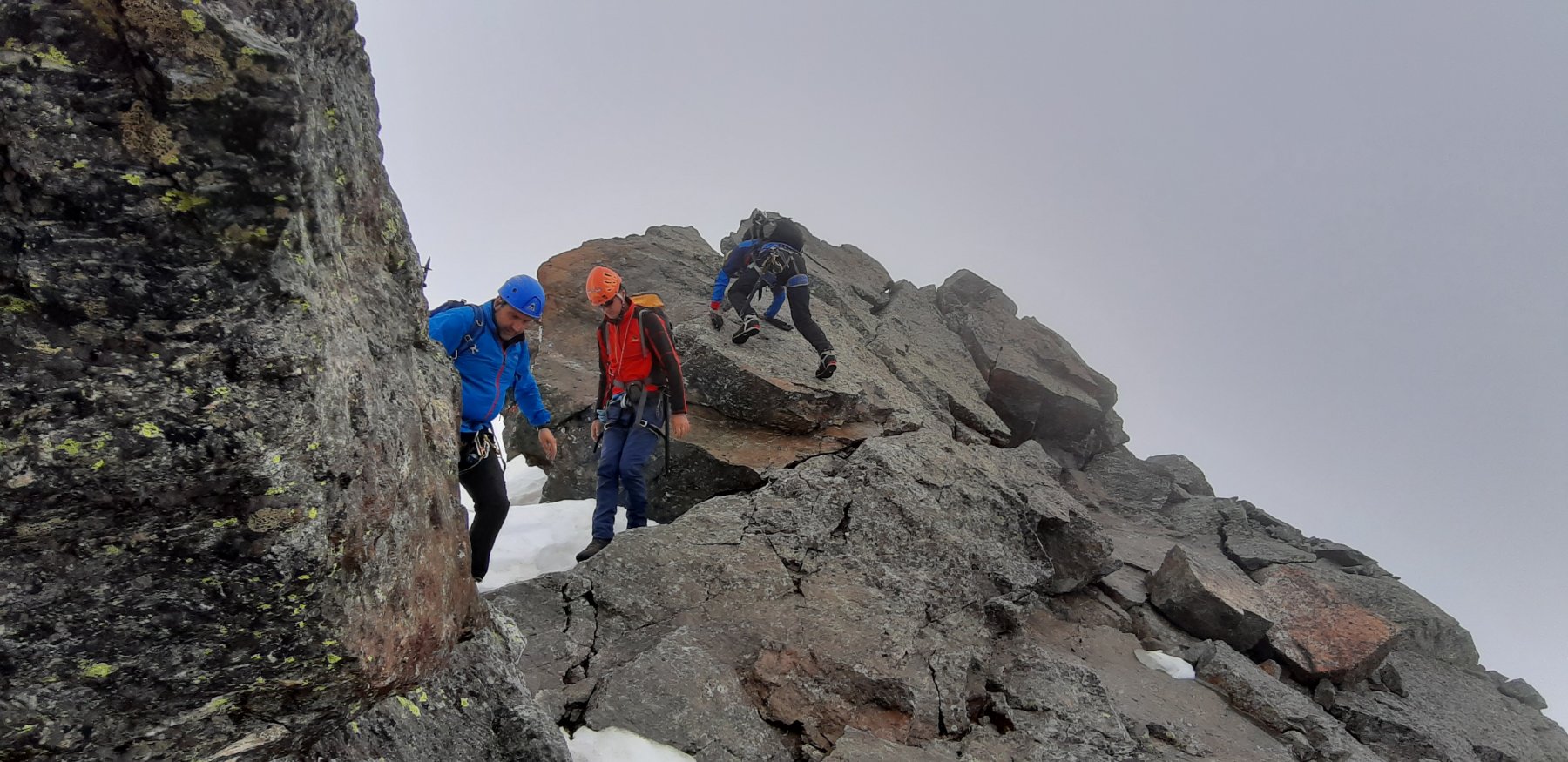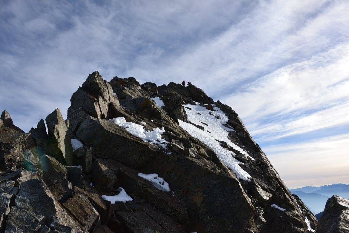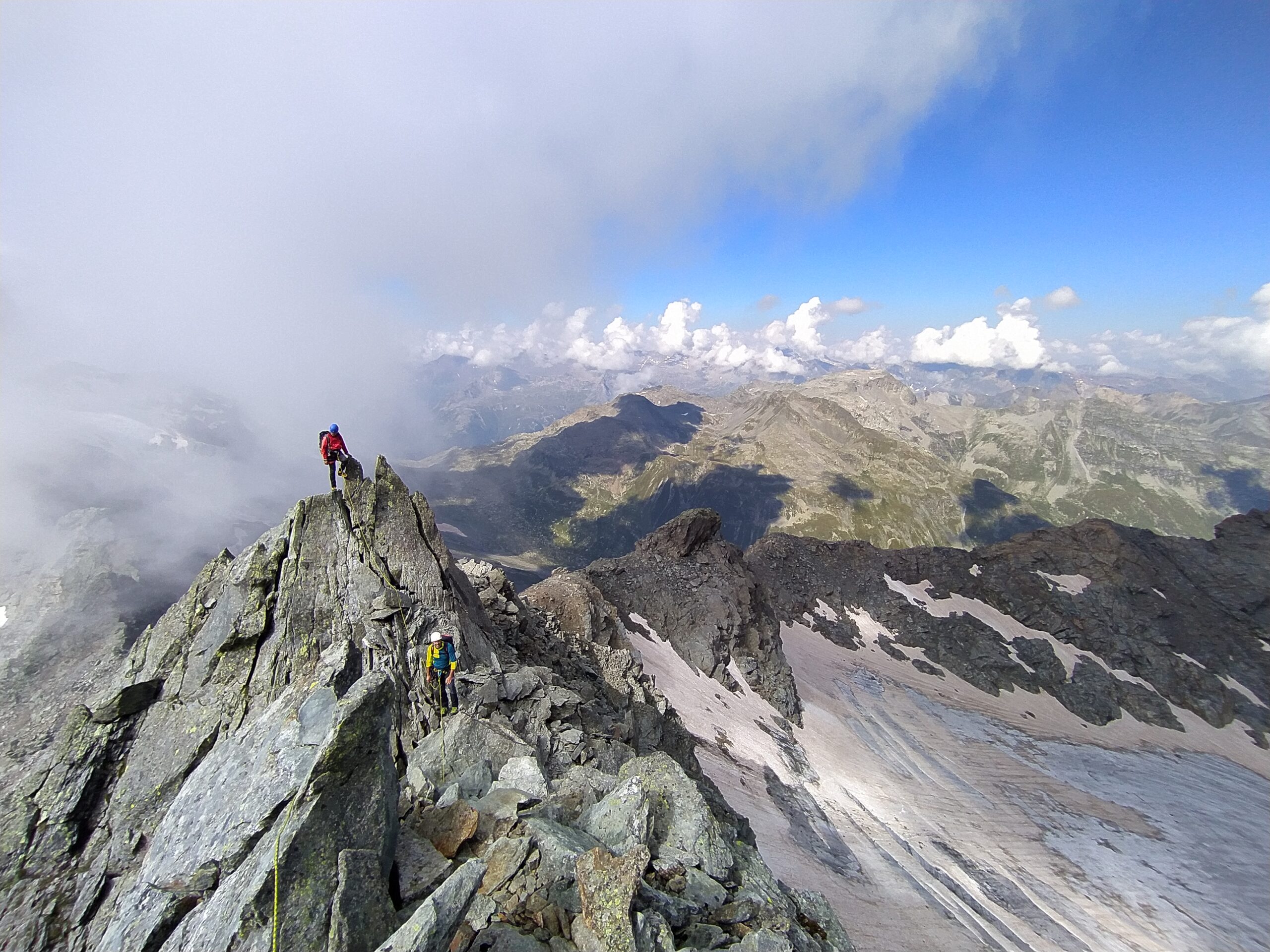Seguono altri tratti esposti ma facili (utili cordini e fettucce), fino al tratto chiave quando ormai si è in vista della vetta: un traverso di circa 4m su placca inclinata facile (2° grado) ma espostissima. Un chiodo presente in loco. Usciti dal traverso si salgono le ultime facili roccette e si è in vetta, 3103m. Attenzione che questa cresta se molto innevata o ghiacciata può diventare tutt’altro che banale.