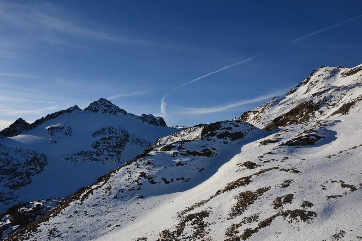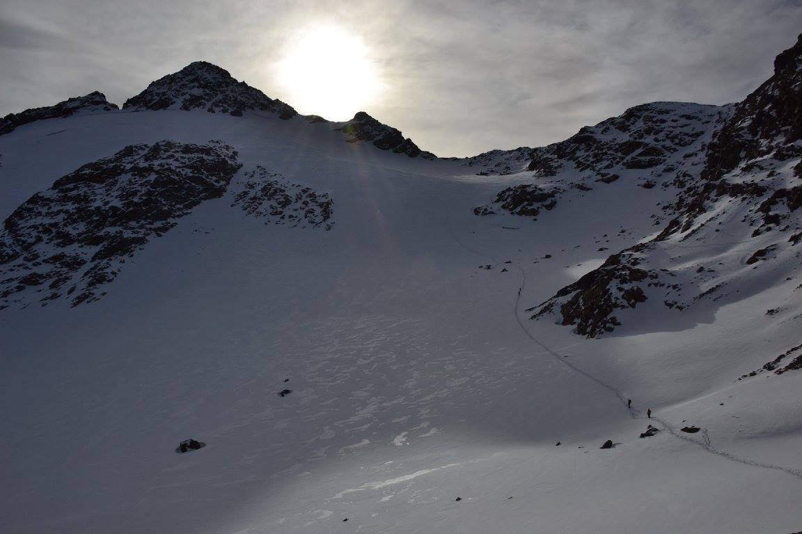 Dal bivacco si procede in direzione S e con un lungo traverso ascendente (attenzione ai pendii estremamente valanghivi sulla destra) e ci si porta ad una sorta di colletto con grandiosa vista sulla nostra meta.