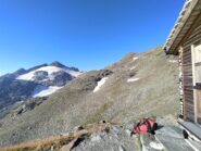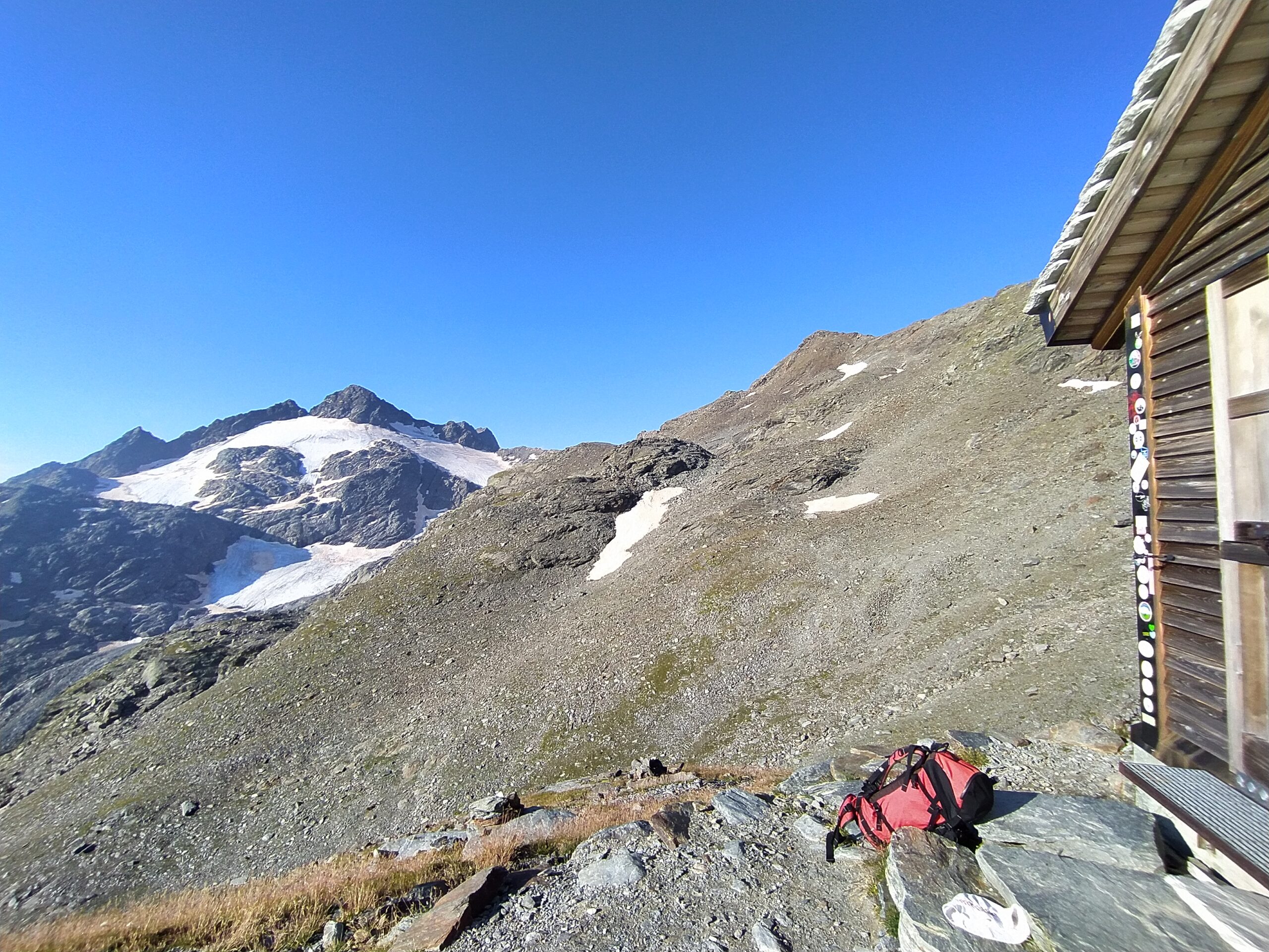 Superiamo altri lastroni a fianco di cascata e raggiungiamo un pianoro 2305m. In alto cominciamo a vedere il bivacco. La traccia molto ripidamente ci fa prendere quota con alche alcuni punti a mezza costa, poi dopo un’altra scritta su un masso erratico siamo a quota 2500m. Spesso in questo tratto è presente neve fino a stagione inoltrata vista l’esposizione a NW. Sempre seguendo i bolli e la traccia che sale su sfasciumi pietrisco ed erba arriviamo al bivacco Cecchini 2750m, 9 posti letto.