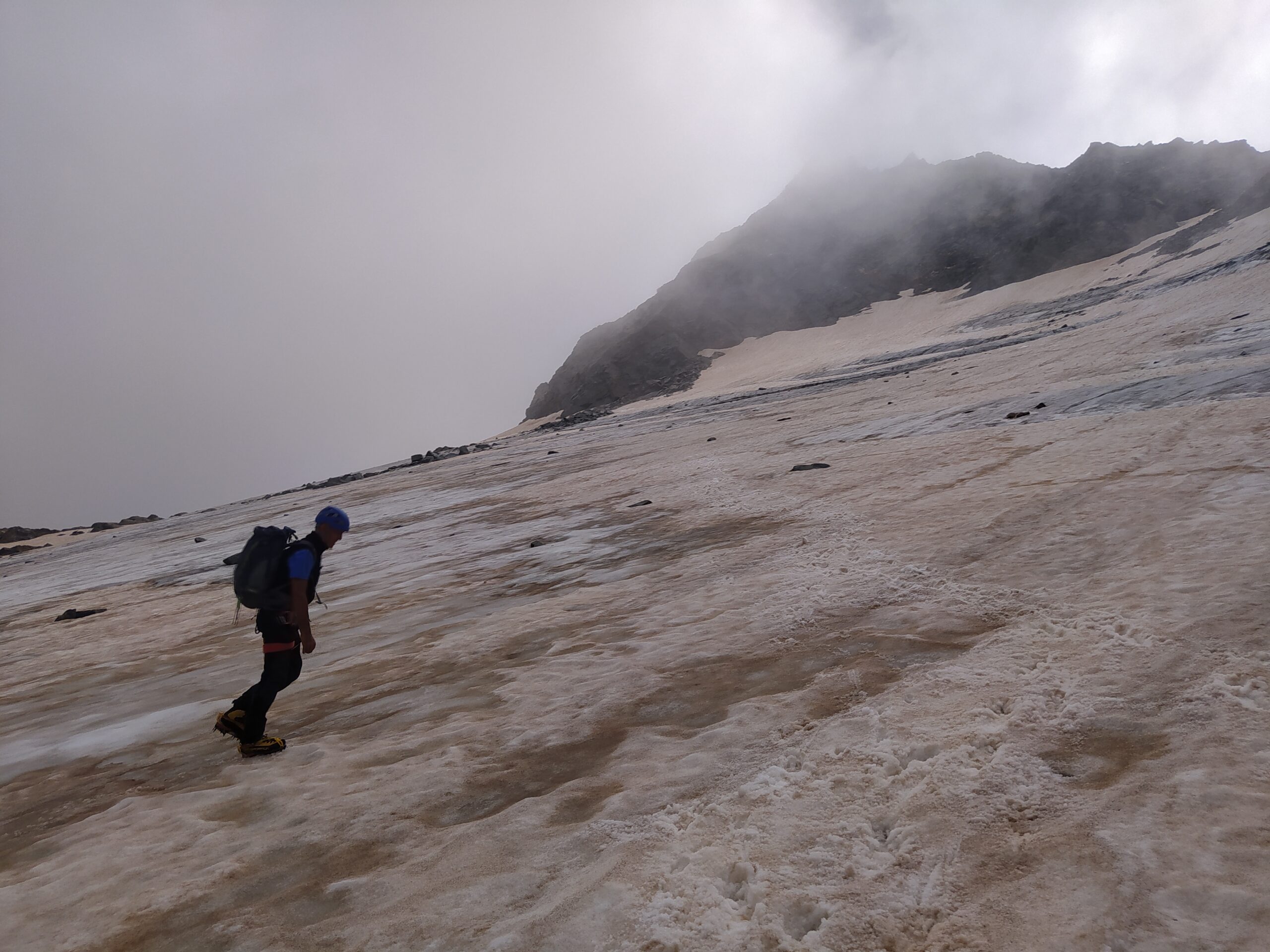 Inizia la ripida discesa verso la vedretta del Pizzo Ferrè. Questo ghiacciaio è bonario con crepacci piccoli e nessun seracco sospeso. Conviene comunque legarsi in cordata per evitare guai. Dopo un lungo tratto poco inclinato il pendio s’impenna e con percorso ripido ci si porta al colletto di quota 3020m. Sulla sinistra salendo si snoda la breve ma ostica cresta rocciosa del Pizzo Ferrè.