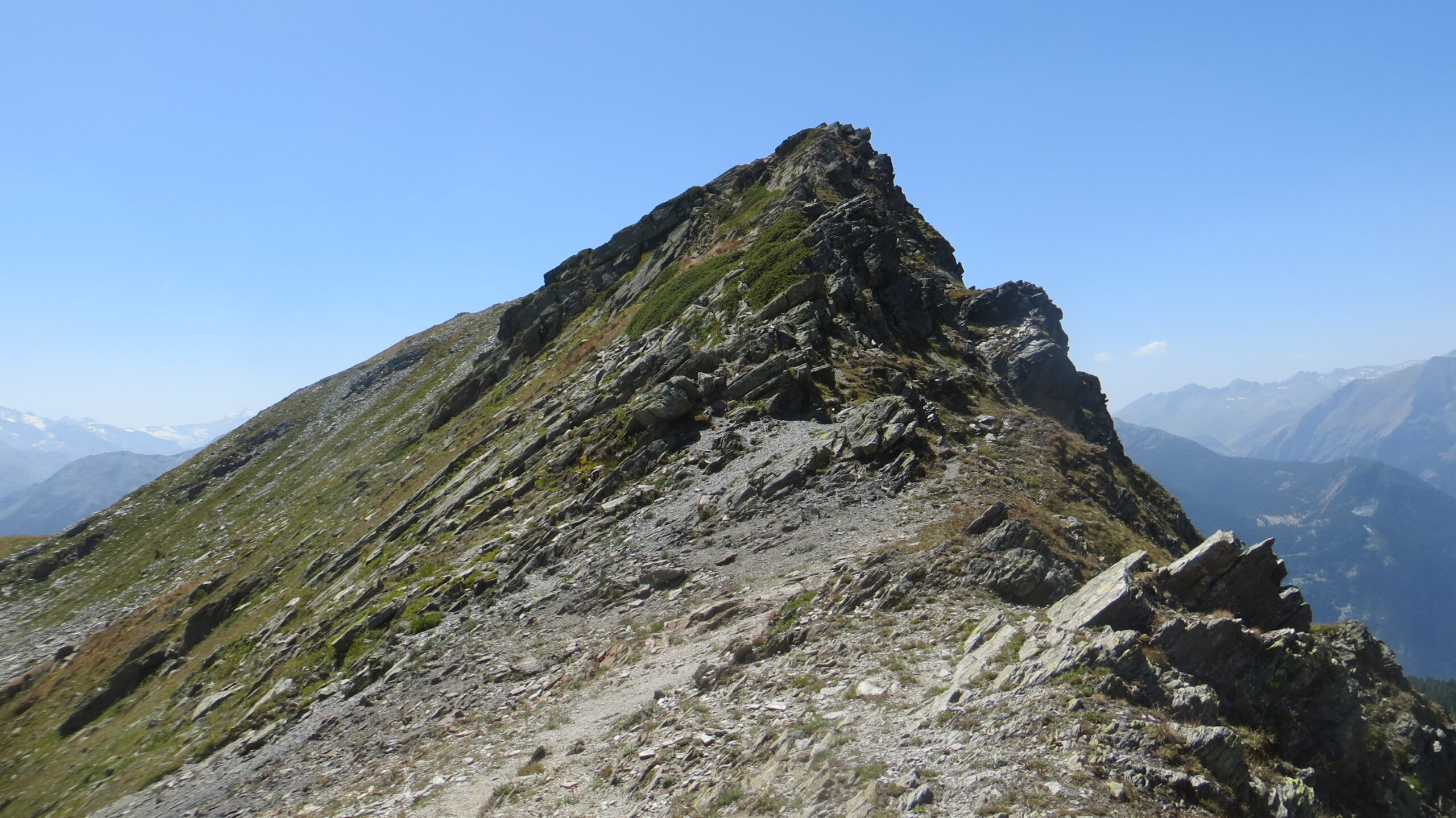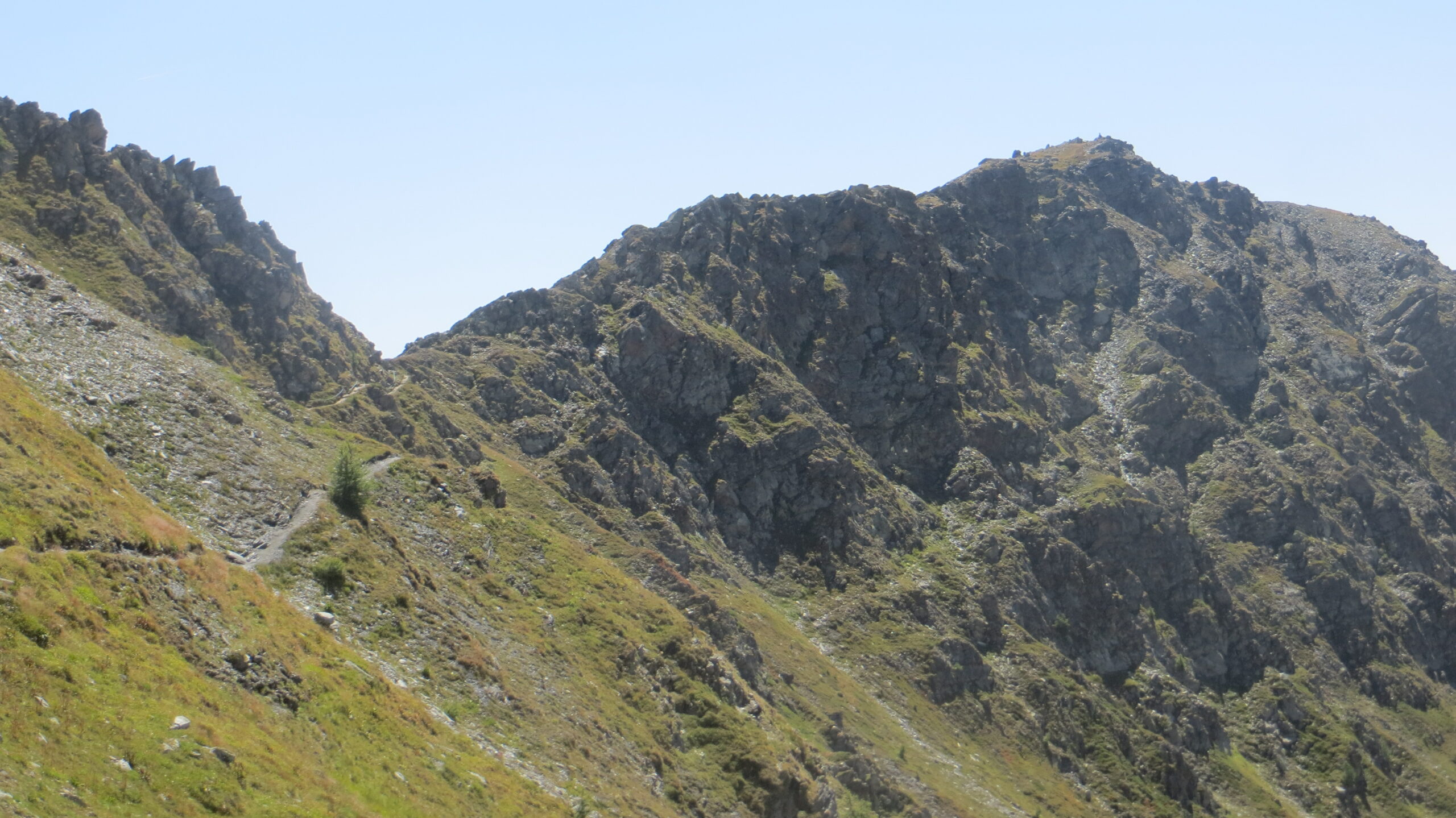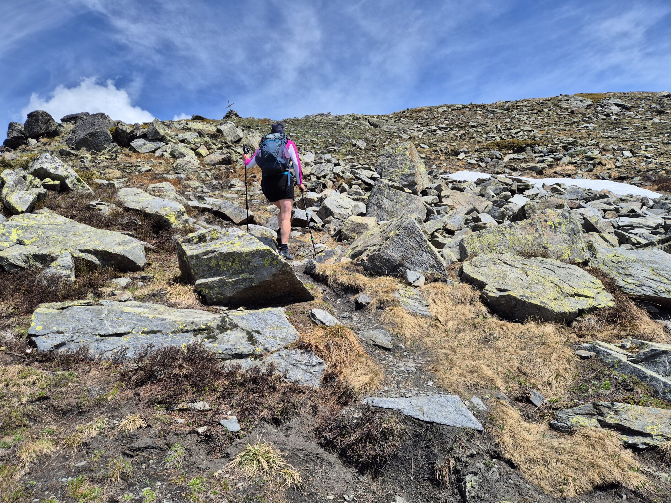 Percorrerlo e prendere la cresta a sx , seguirla portandosi a dx fino in vetta.