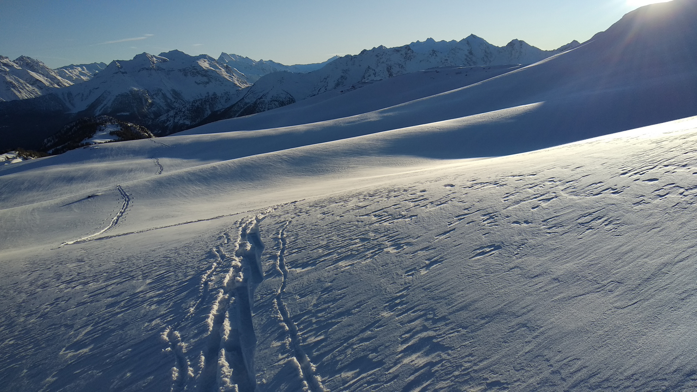 Sono partito dopo pranzo con poche speranze. Ieri ha nevicato un 10/20 cm e oggi soffiava vento forte sulle cime. Pensavo quindi di trovare neve brutta e vento fastidioso…invece…di vento non ne ho trovato e la neve era rimasta molto bella (soprattutto la parte alta). In partenza la neve caduta ieri nasconde le zone prive di fondo ed è meglio seguire la poderale per non toccare pietre. Ad essere sincero, mi ha piacevolmente sorpreso la sensazione di trovarmi in questi ampi pratoni tutti lisci e immacolati.