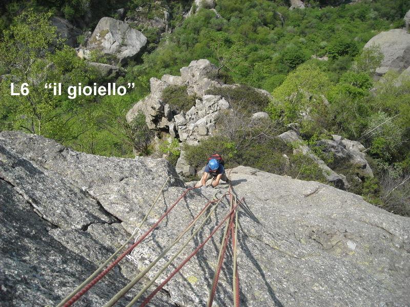 L1 – Dallo spit salire a sn (fessurine, utile un tcu piccolo) puntando agli spit, poi placca fessurata 6a+, poi spit e blocco di 6a/b, poi facile fino alla sosta. 60m.