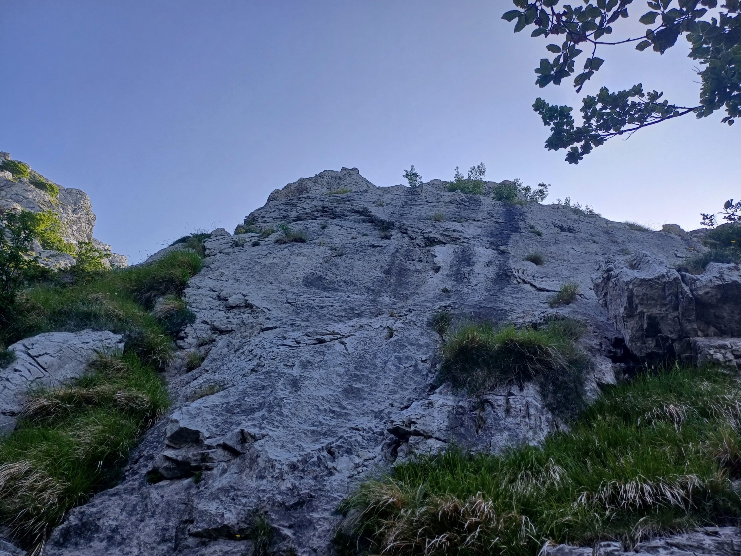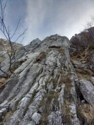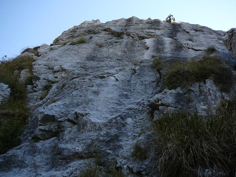 Dalla sosta si sale a uno spit posto 3-4 m sopra e si va ad aggirare sulla dx il saltino soprastante (III+), poi per terreno più facile con erba e sassi (albero) si va ancora a dx a sostare su 2 spit.