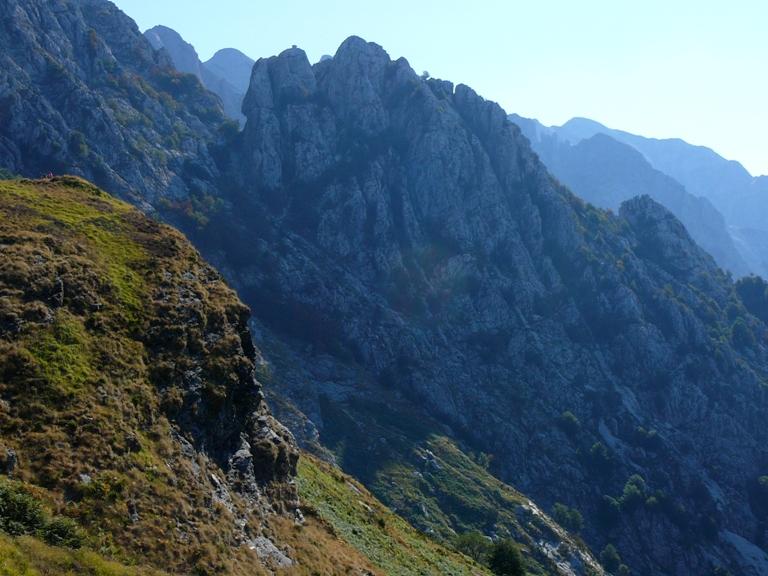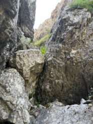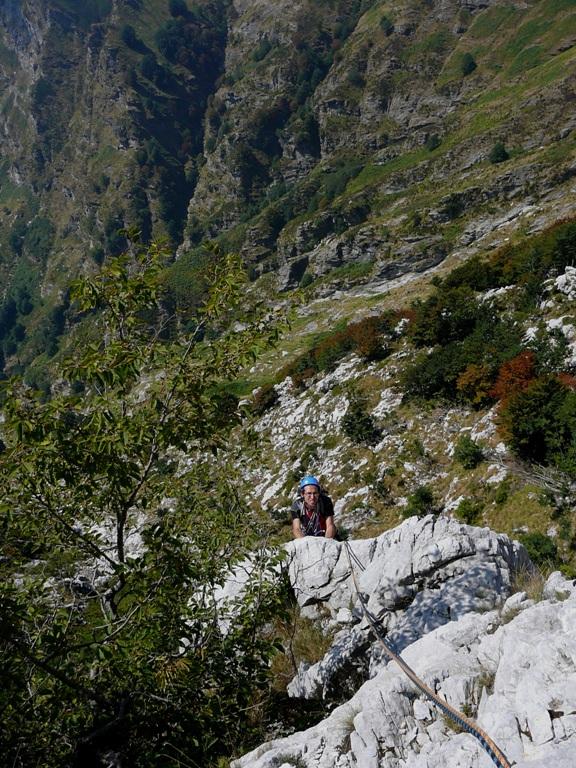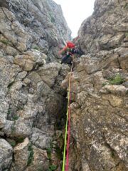 Tiro orizzontale di trasferimento: dalla sosta si aggira a dx il roccione lungo una cengia, e dopo un passo esposto si va a imboccare il grande canale-camino sulla dx (è ancora quello che inizia a dx dell’attacco). Sosta su 2 spit prima dell’ingresso del camino sulle rocce a sx.