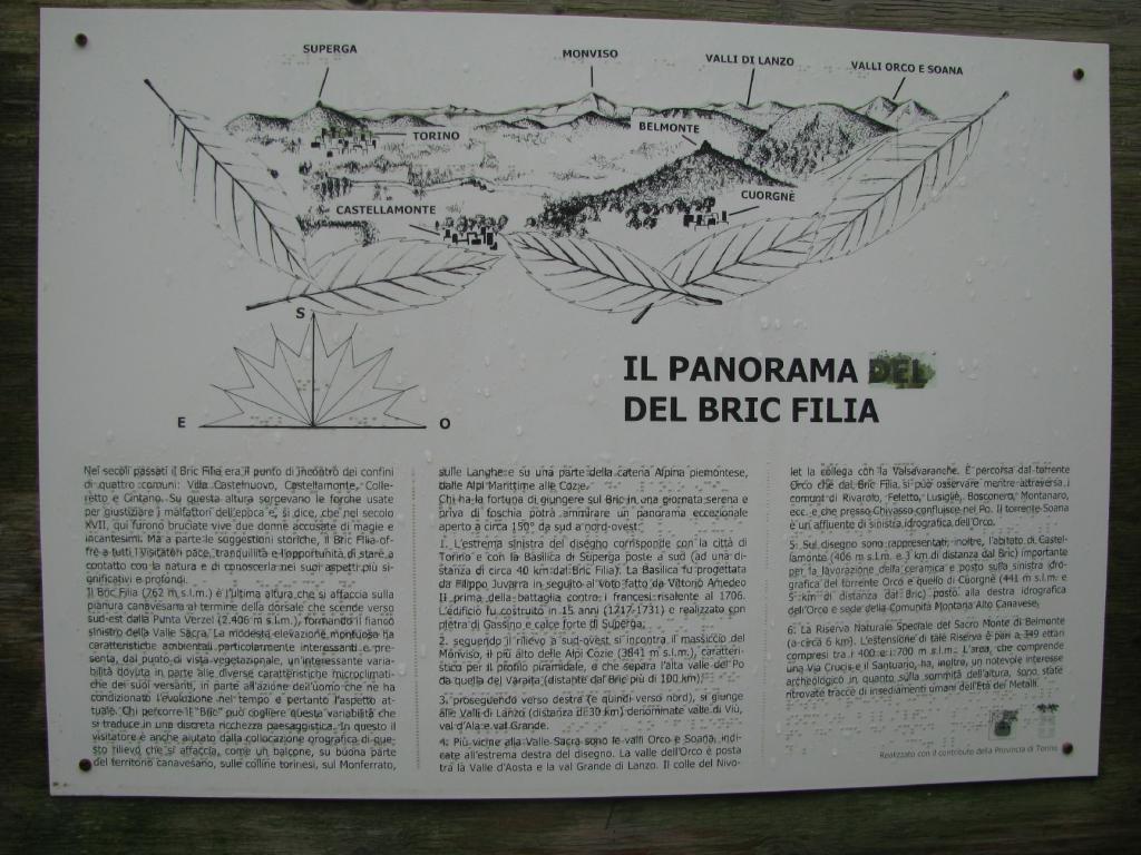 Seguire la strada che porta a Belvedere, Chiria, Canton Querio e S. Anna; seguire in leggera discesa, la strada del Cimitero e passando per Cà ‘d Valer raggiungere la strada provinciale SP59, seguirla per un breve tratto fino al ponte del Rio Calpas, svoltare a destra e risalire la sterrata nel bosco, passare la sbarra di divieto al traffico, dopo alcuni aggiramenti si giunge ad innestarci sulla SP60 alle porte di Villa Castelnuovo, percorrere verso Castellamonte, un brevissimo tratto e seguendo la strada di destra, si raggiunge la bella chiesetta della Madonna della Guardia, poi l’area attrezzata e seguendo il sentiero in salita a sinistra si giunge in breve alla Croce metallica del Bric Filia, dove ci sono altri tavoli e panche per un meritato riposino.
