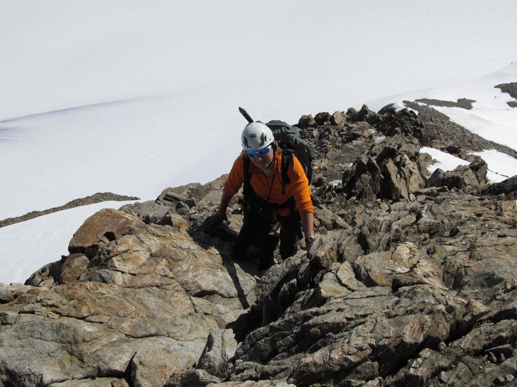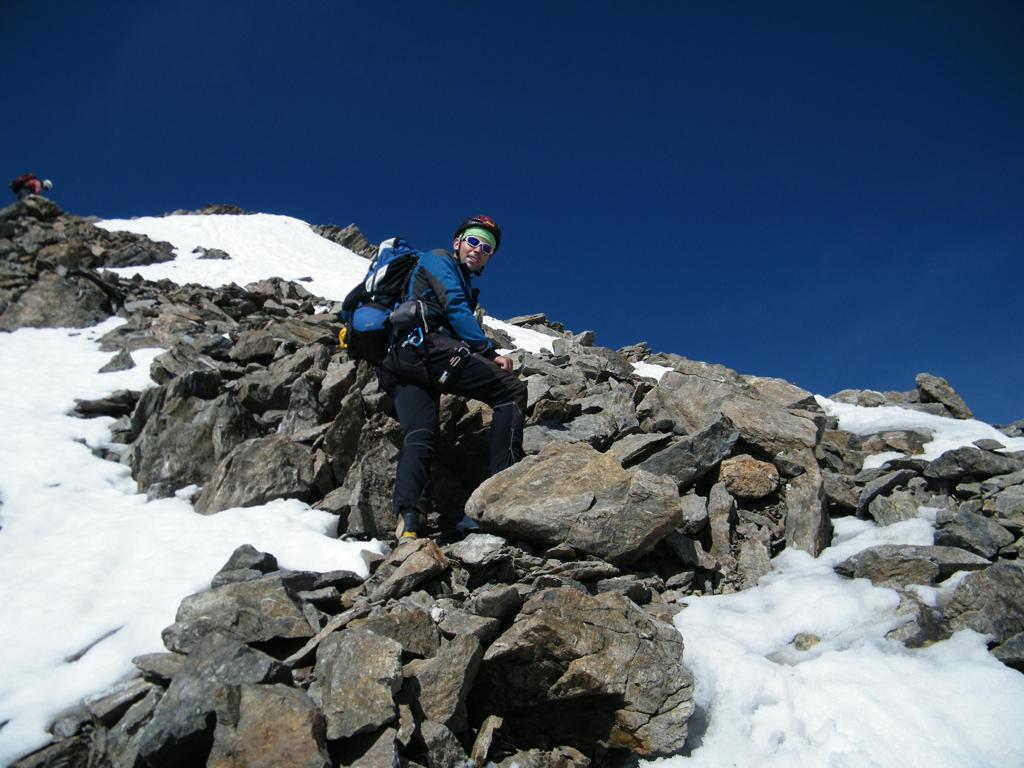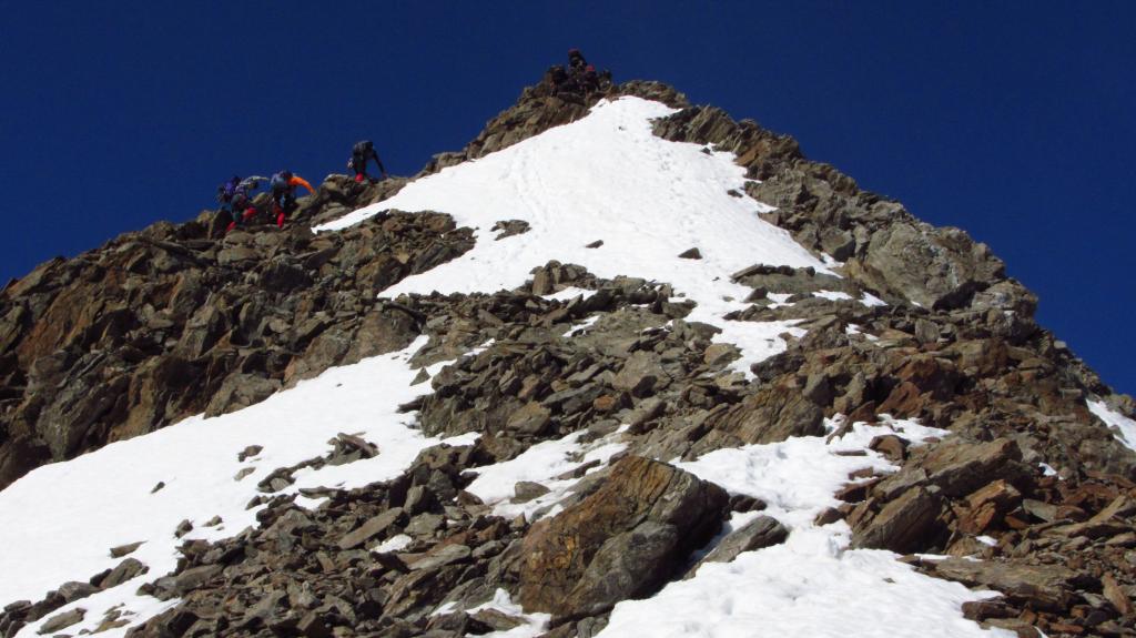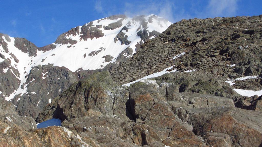 discesa per l’itinerario di salita, oppure piegando per la cresta Est più facile ma più scoscesa. A inizio stagione possono essere sfruttati i nevai residui per evitare alcuni passaggi di roccia in discesa, ma va valutato bene il percorso.