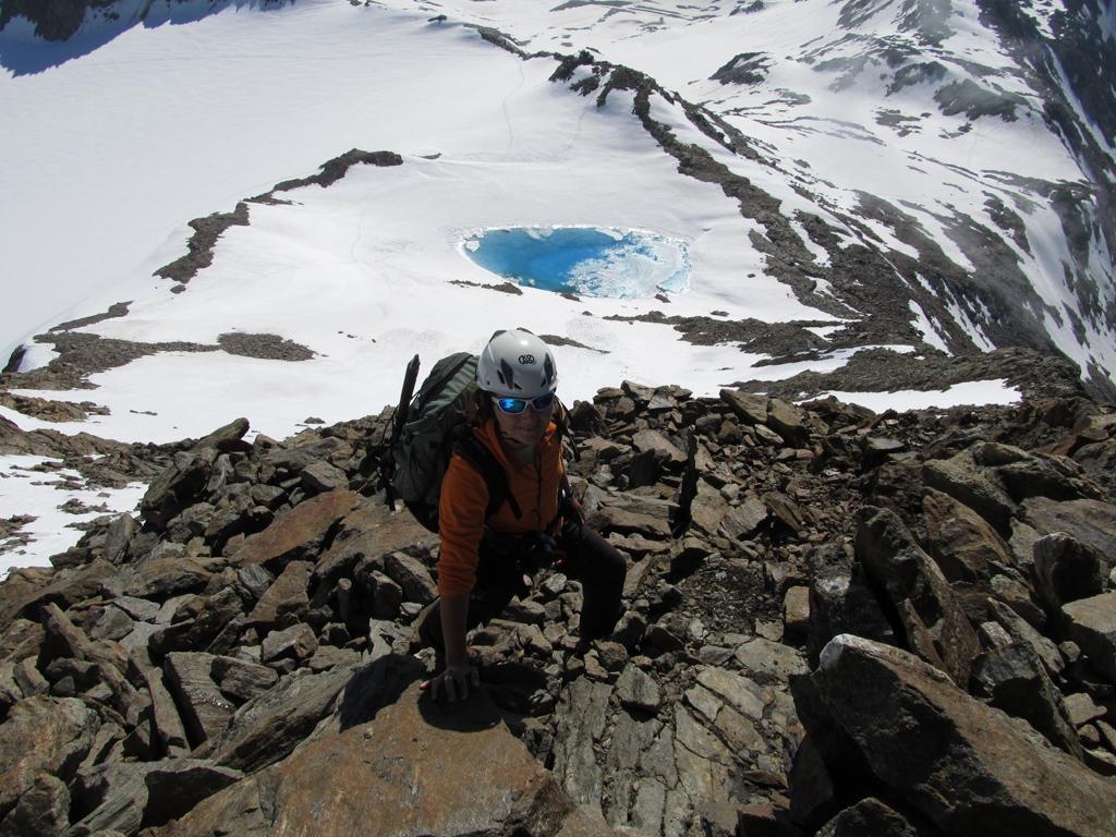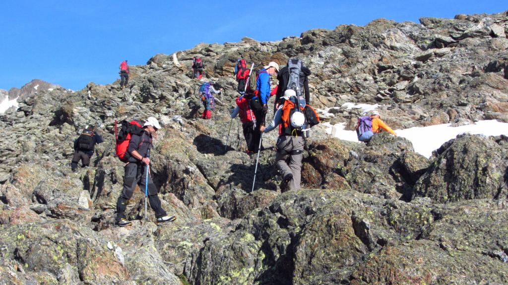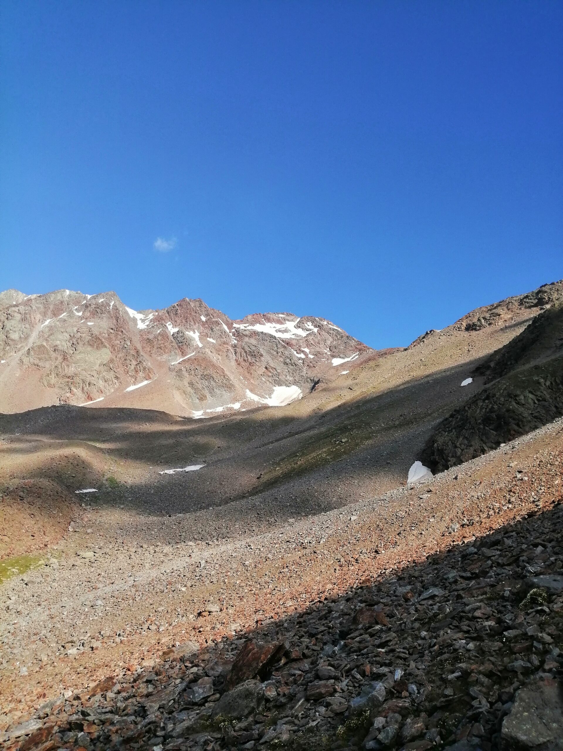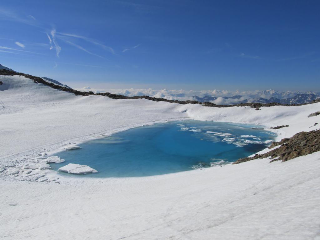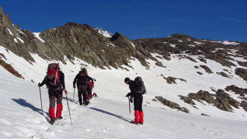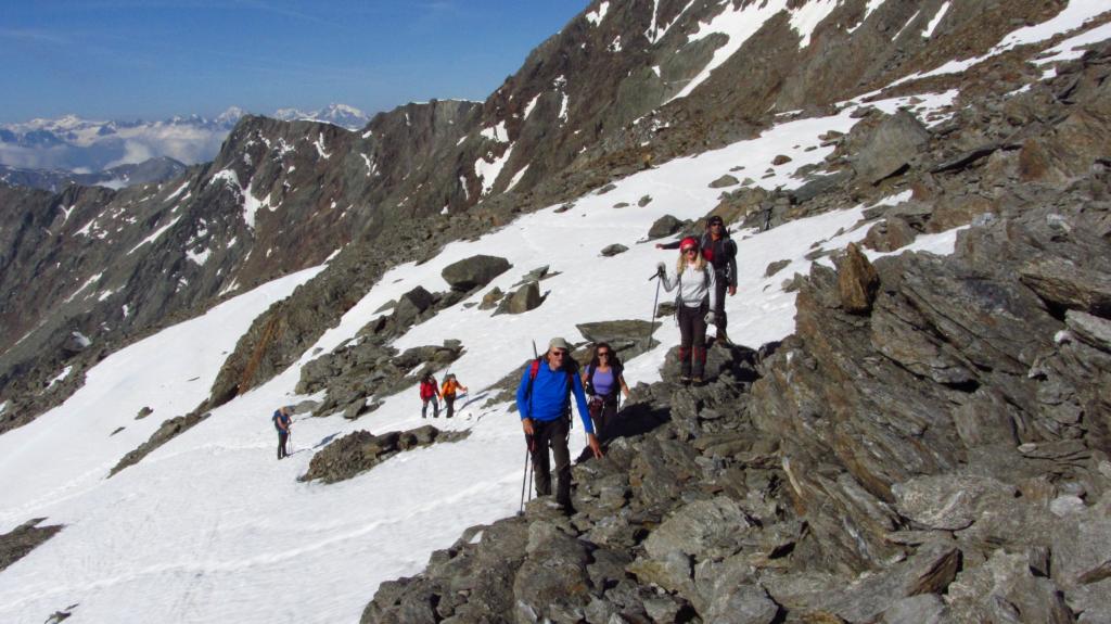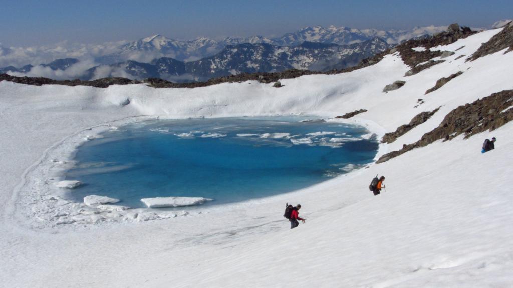 Si traversa praticamente in piano il glacio-nevaio verso sinistra, giungendo rapidamente ad un grosso pianoro dove sorge anche un bel laghetto glaciale. Lo si lascia a sinistra e ci si dirige verso la parte detritica iniziale della cresta NE che scende dalla Punta di Finale.