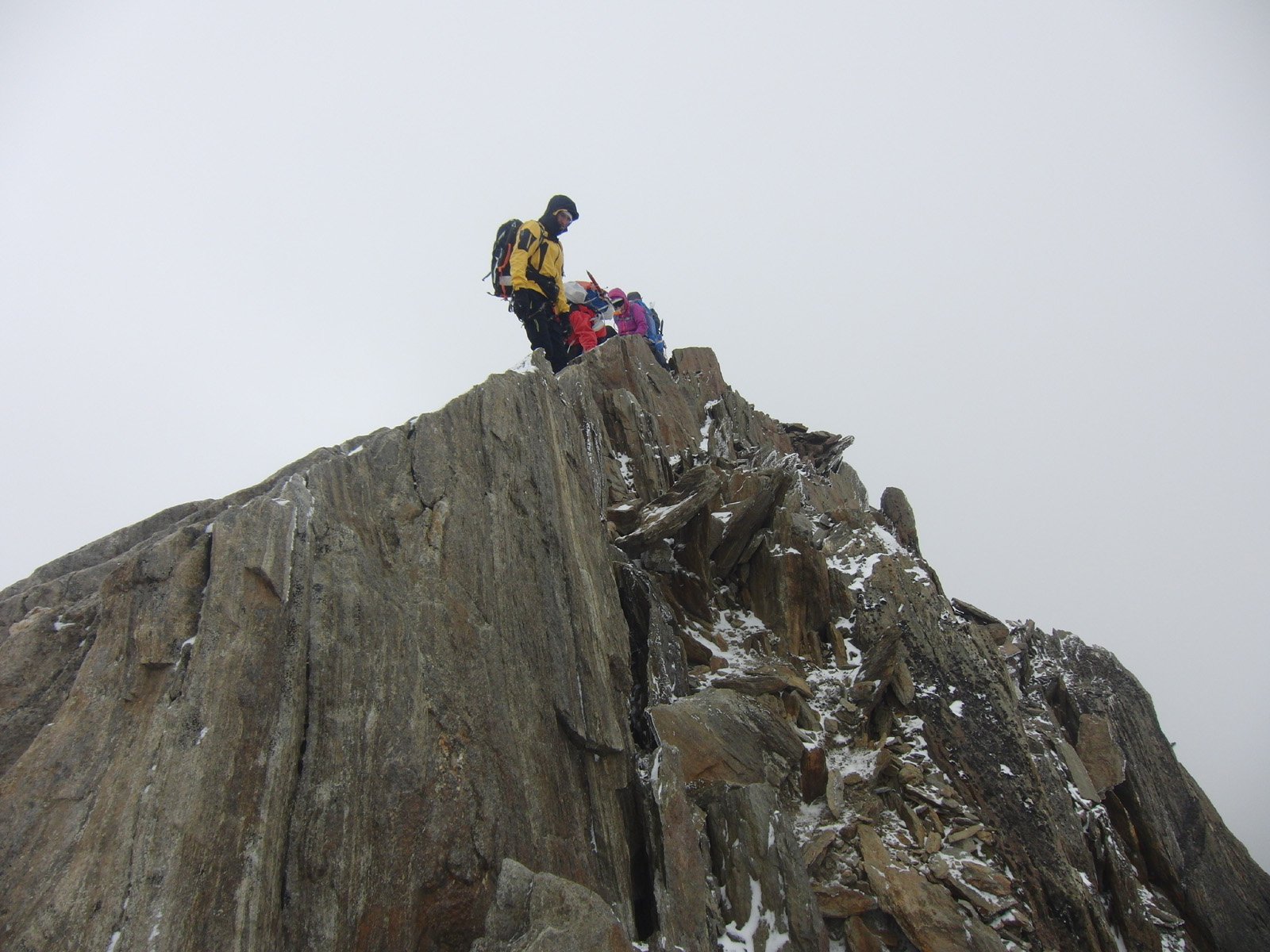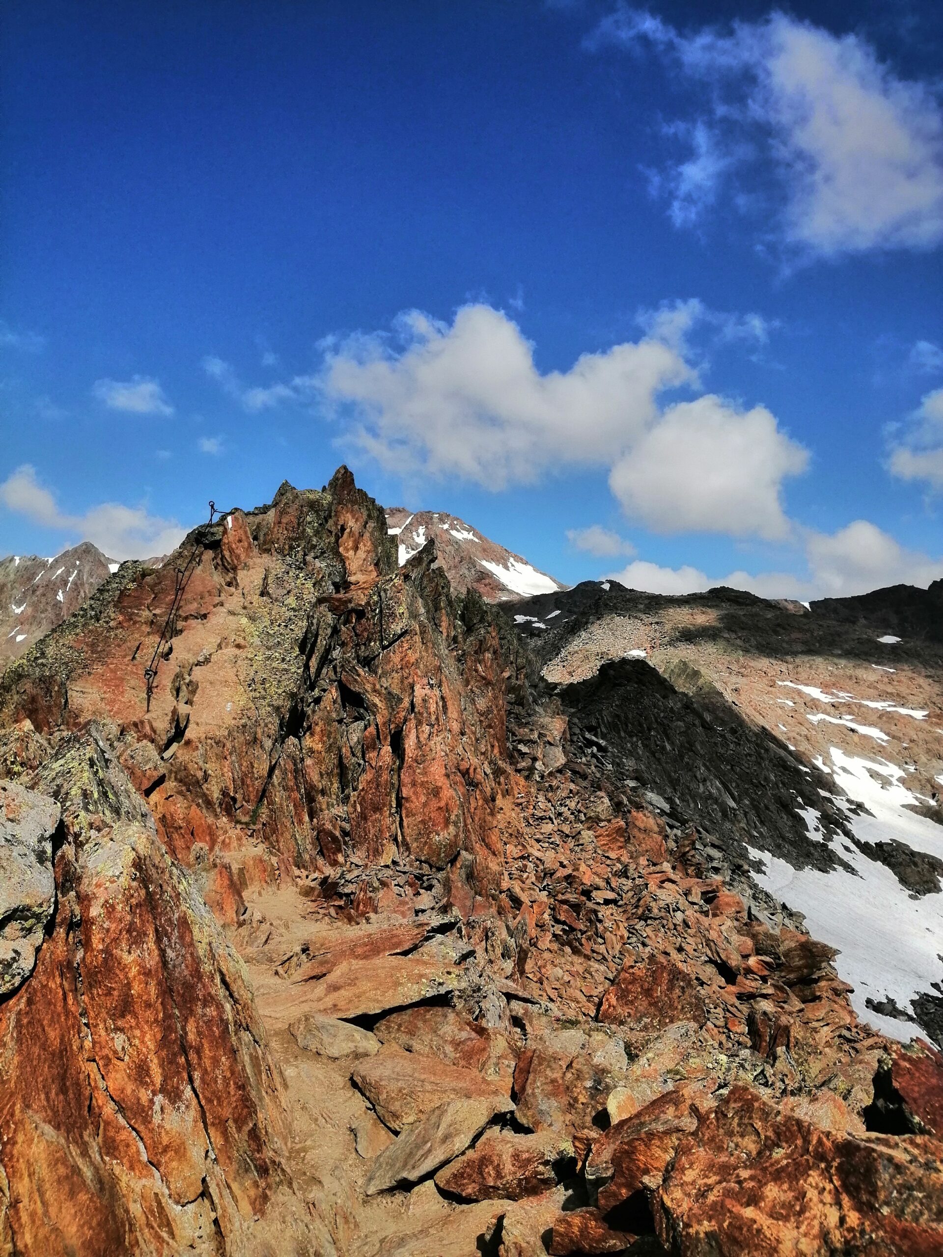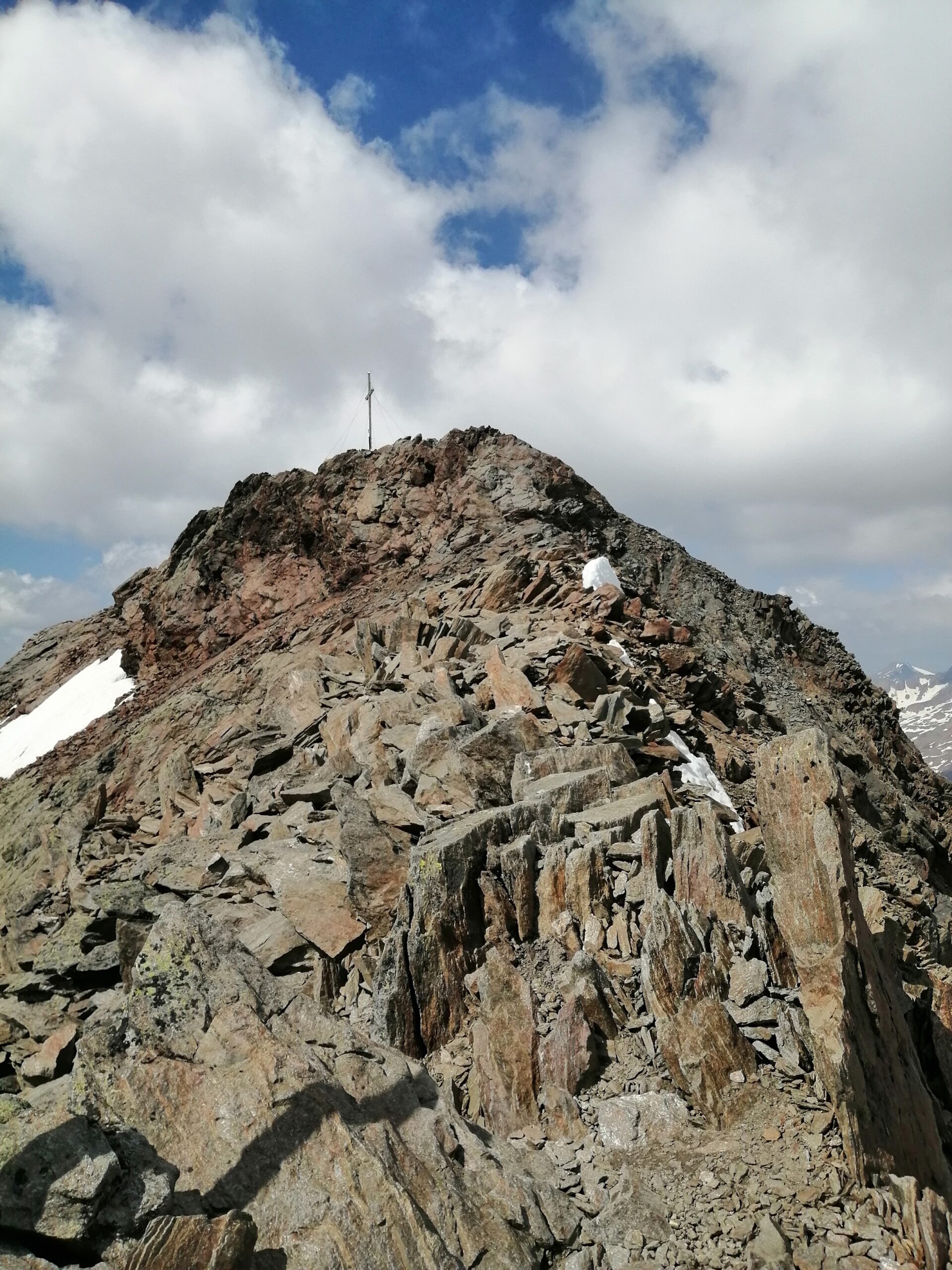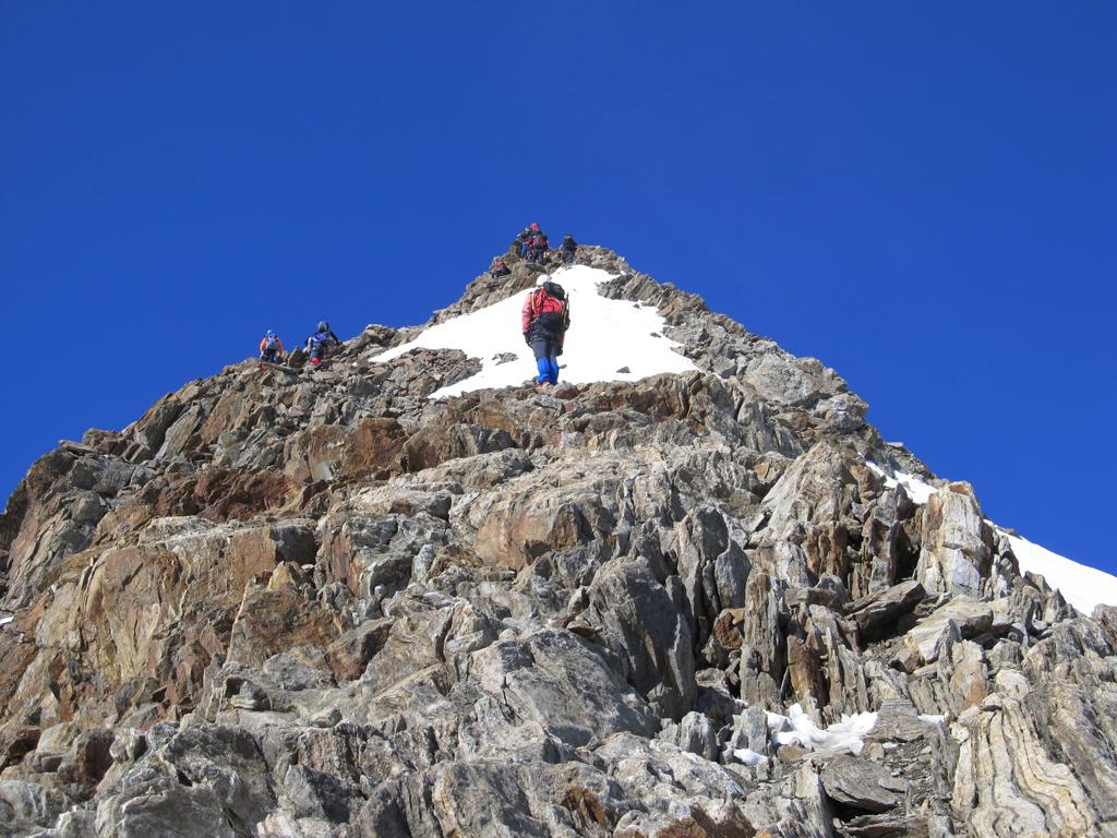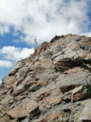 La pendenza cambia rapidamente, si inizia a salire più ripidamente su massi e detriti, inizialmente su traccia di sentiero piuttosto marcata, poi man mano la parte rocciosa aumenta, e si devono affrontare i primi passaggi di facile arrampicata. Si entra in un canalino un po’ franoso, per poi proseguire tra le placche e le roccette (passaggi di I e II). Proseguendo talvolta sul filo di cresta, talvolta sul più docile versante sinistro (attenzione alle pietre instabili). Si affronta un passaggio obbligato di II leggermente esposto, per poi continuare tra grossi massi raggiungendo l’anticima. Si continua in piano o sul filo di cresta, o leggermente sotto seguendo tracce e ometti, fino all’intaglio sotto la vera cima. Altri facili passaggi di I su una paretina portano alla grossa croce di vetta.