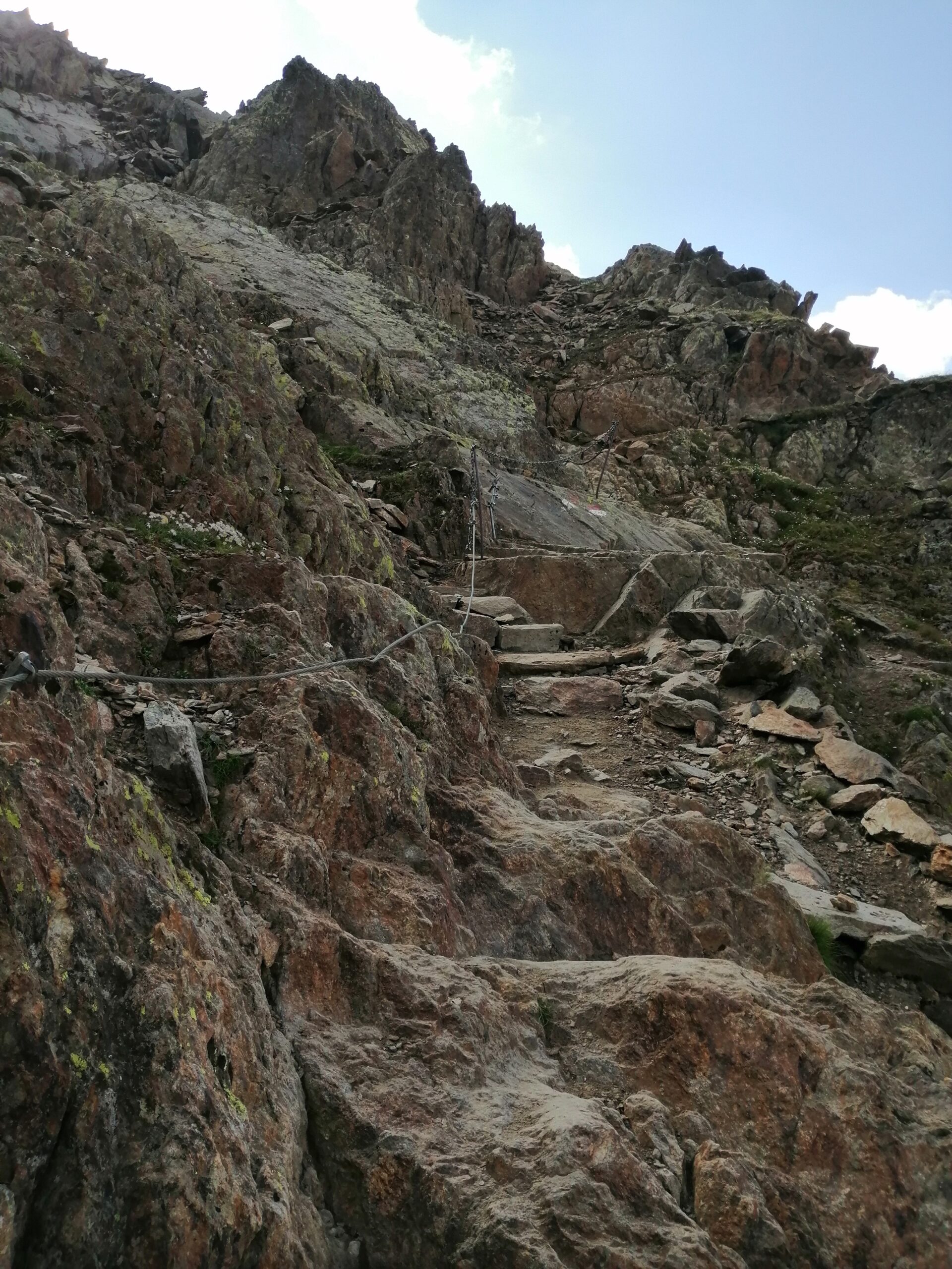 Si attraversa il ripiano al centro, sempre seguendo i segni bianco/rossi molto evidenti, raggiungendo una pietraia, posta sotto le pareti rocciose sulle quali sorge il rifugio Similaun (che non si vede). Si notano sulla destra i tralicci della teleferica del rifugio, bisognerà puntare verso quello più alto. Il sentiero prosegue comodo a zig zag in una vasta pietraia, le serpentine prendono quota finchè inizia una serie di comode cengie nella roccia (attenzione con neve o ghiaccio), finchè dopo una strettoia si compie una curva, e finalmente appare il Rifugio Similaun al Giogo Basso.