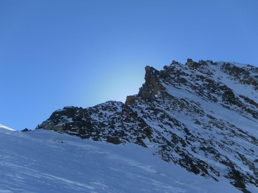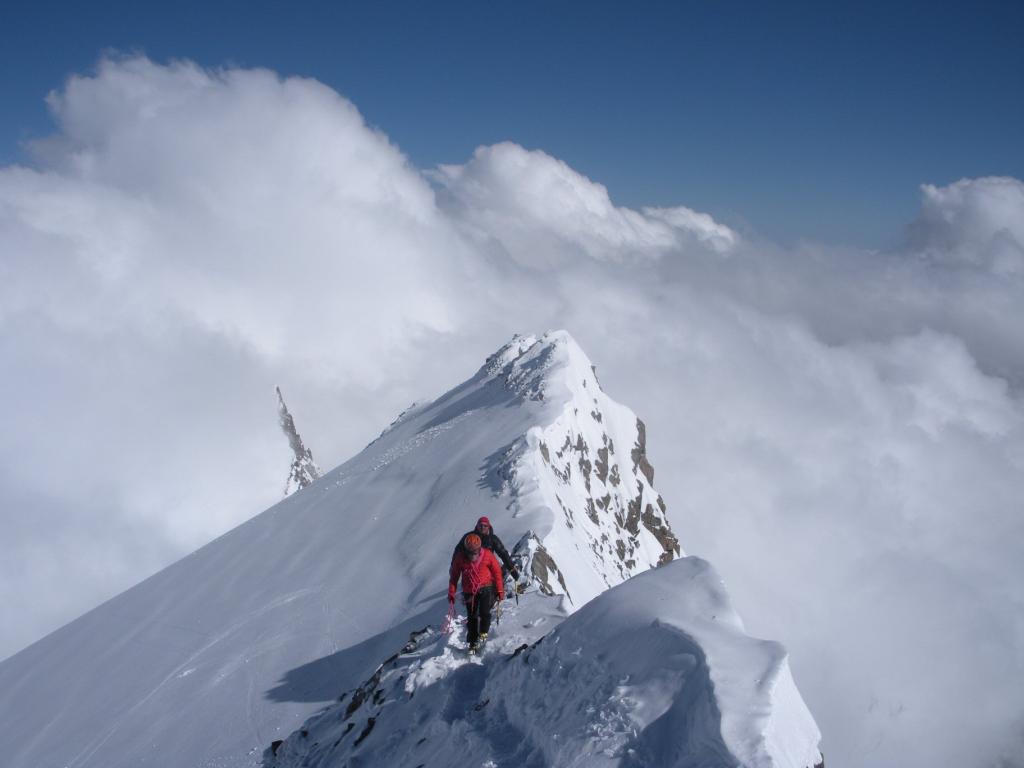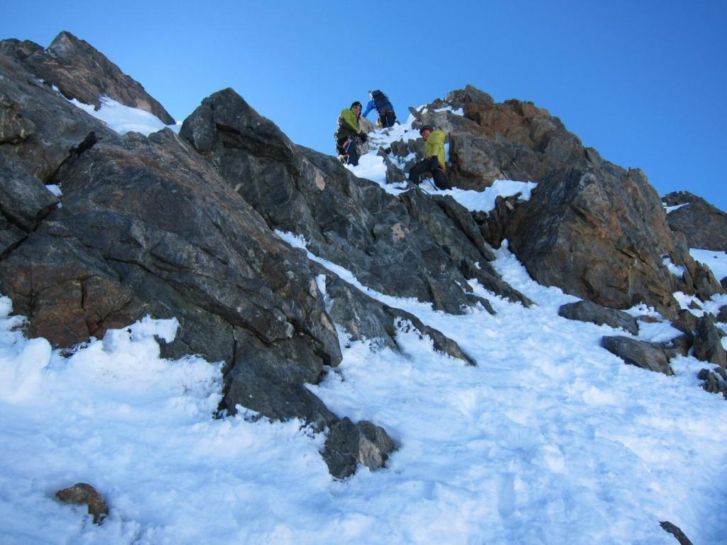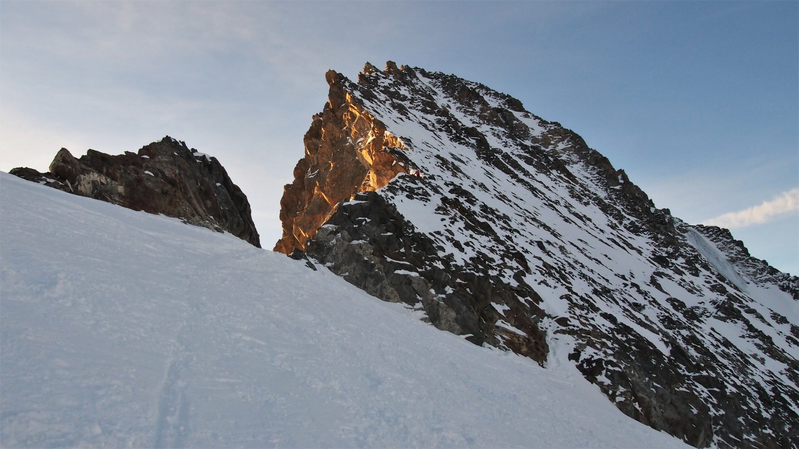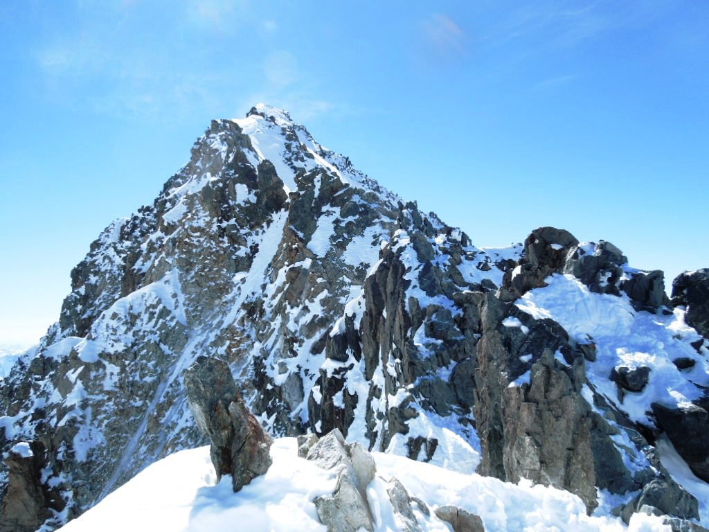 Proseguire a piedi lungo l’affilata cresta Nordo Ovest su facili roccette e neve raggiungendo così la croce di vetta.