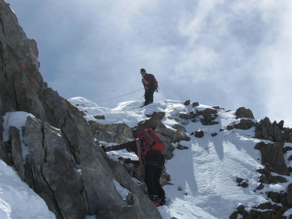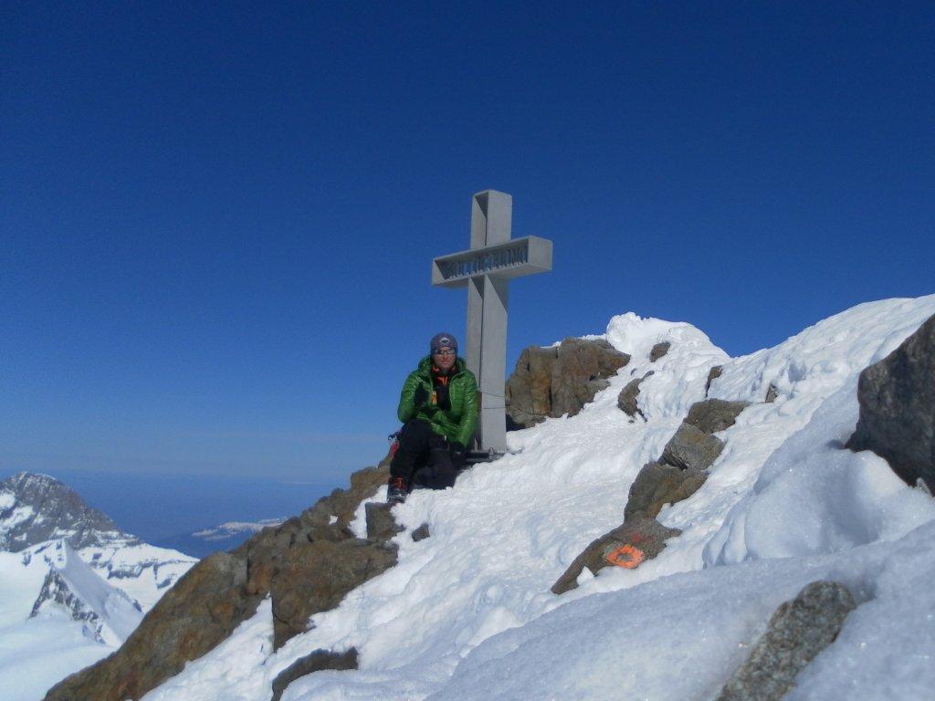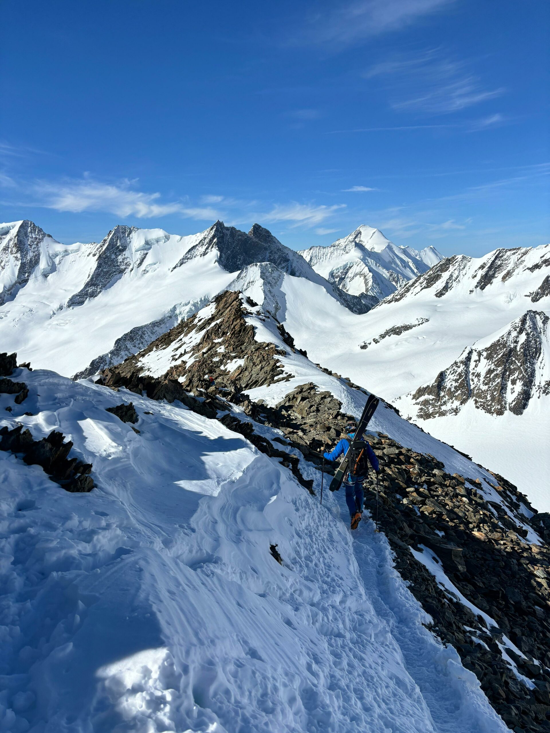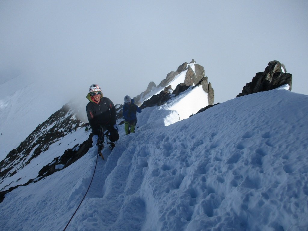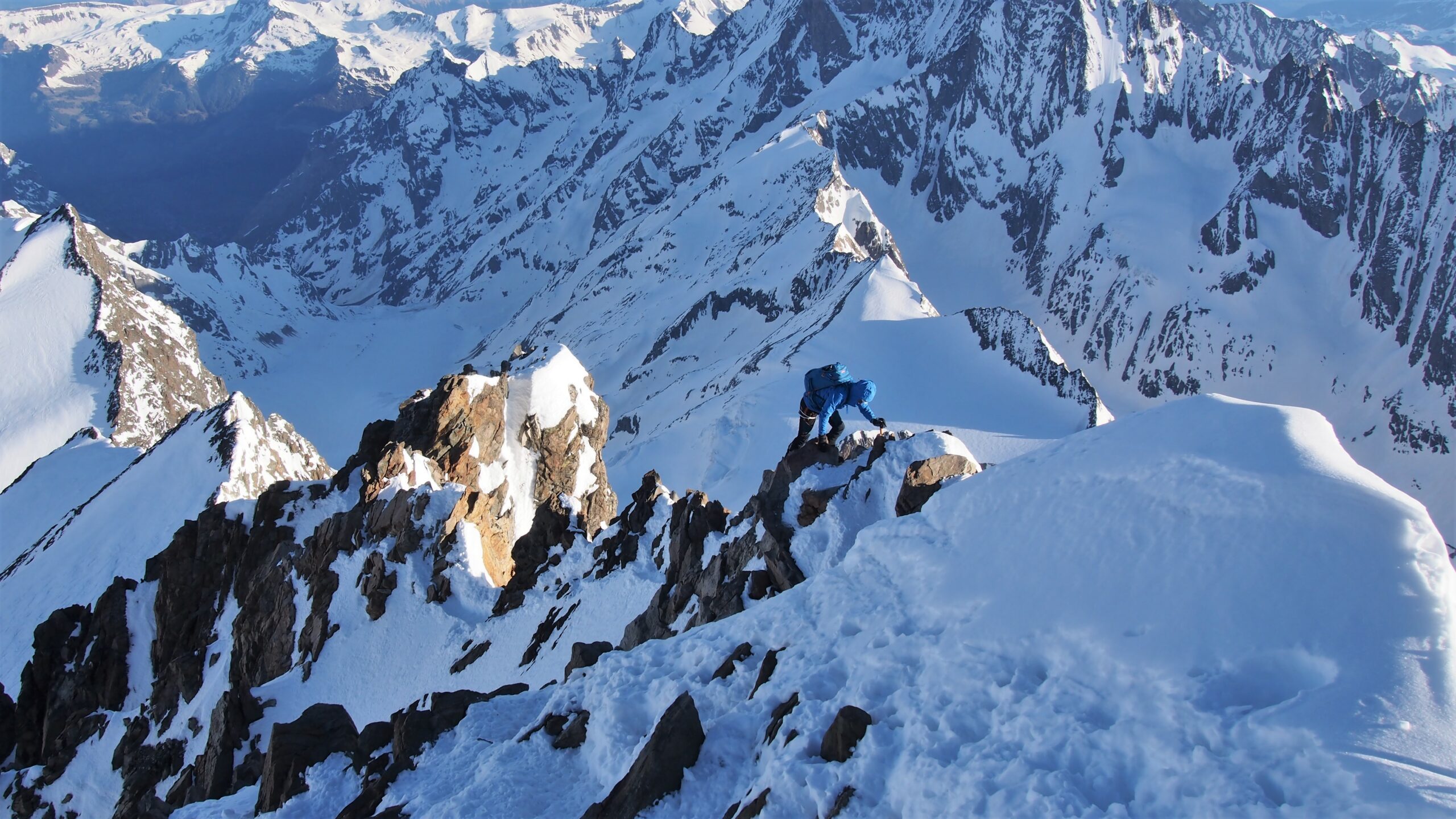 Proseguire a piedi lungo l’affilata cresta Nordo Ovest su facili roccette e neve raggiungendo così la croce di vetta.