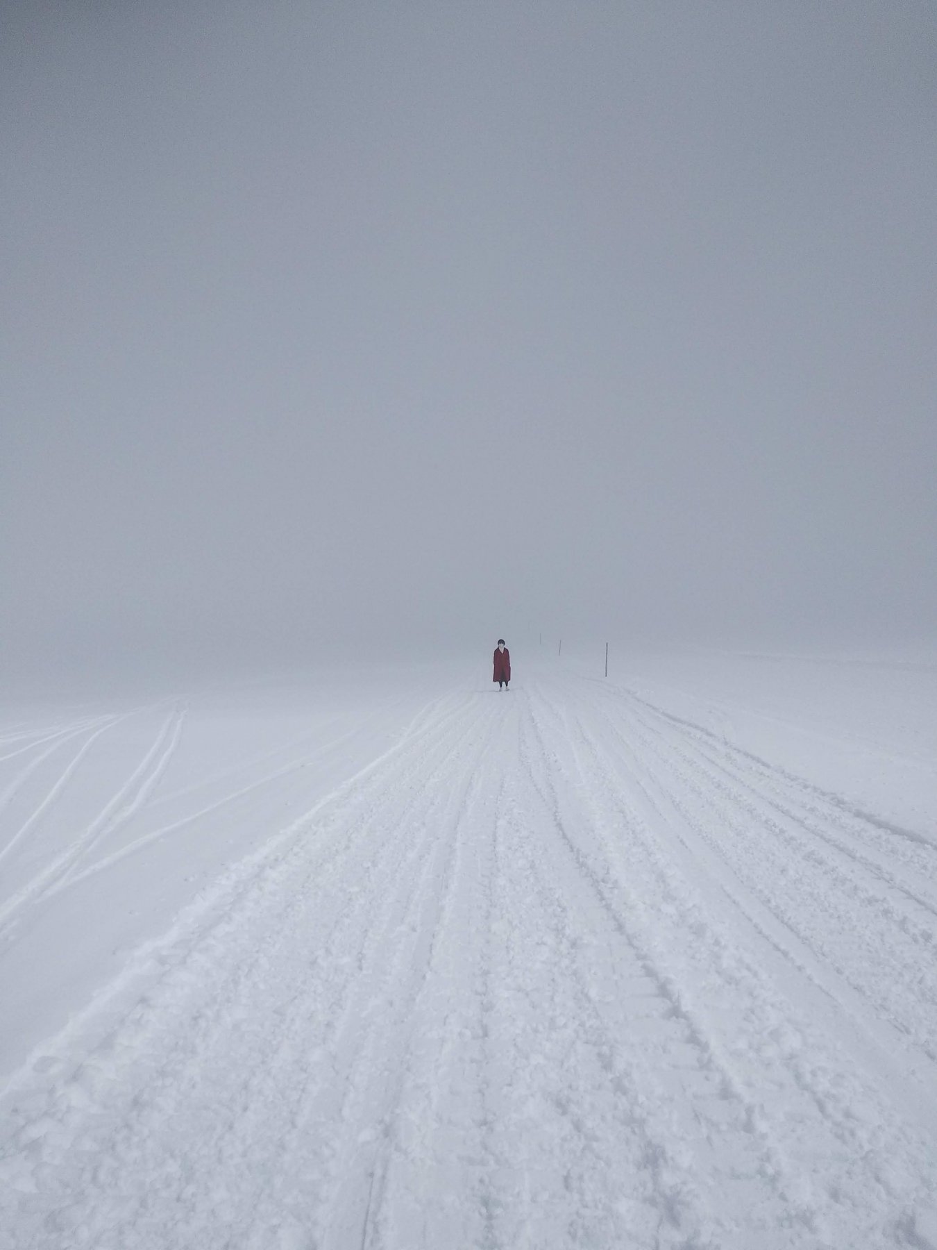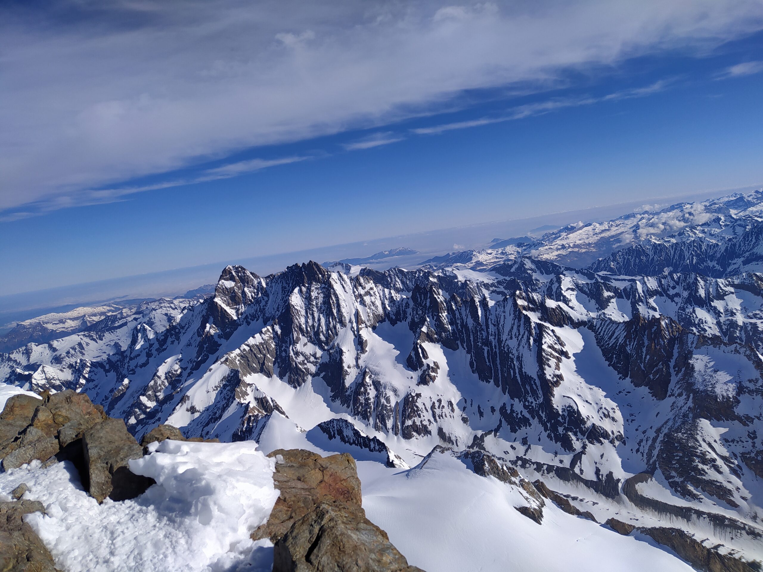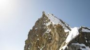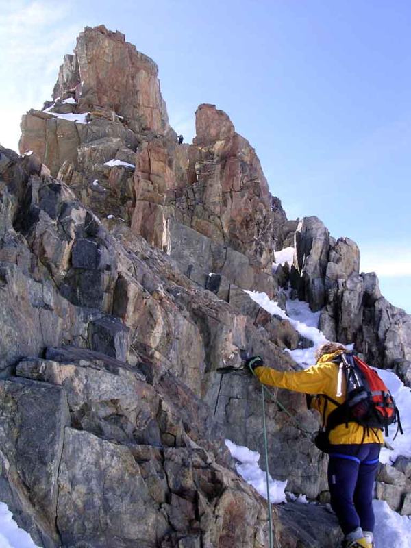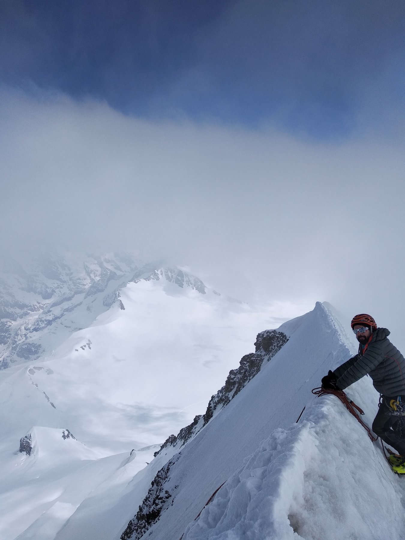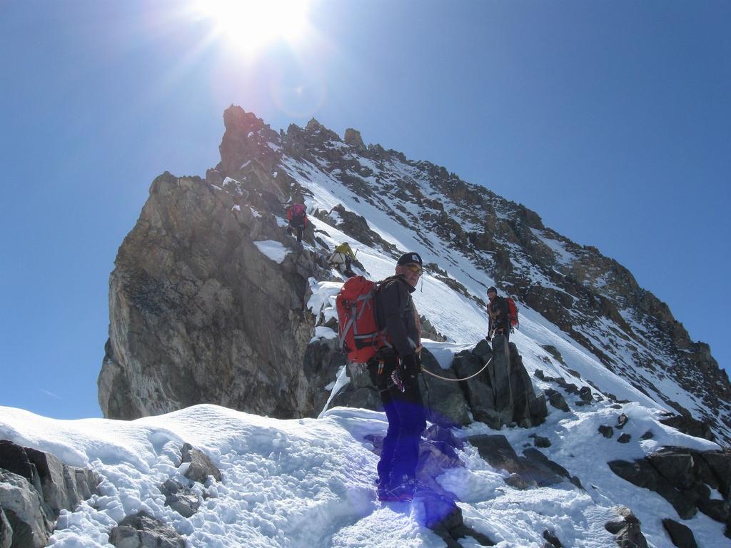Proseguire a piedi lungo l’affilata cresta Nordo Ovest su facili roccette e neve raggiungendo così la croce di vetta.
