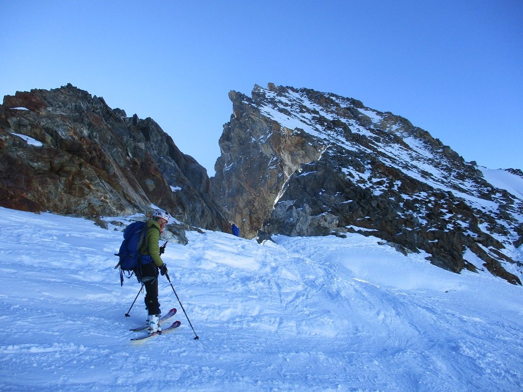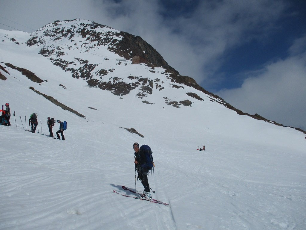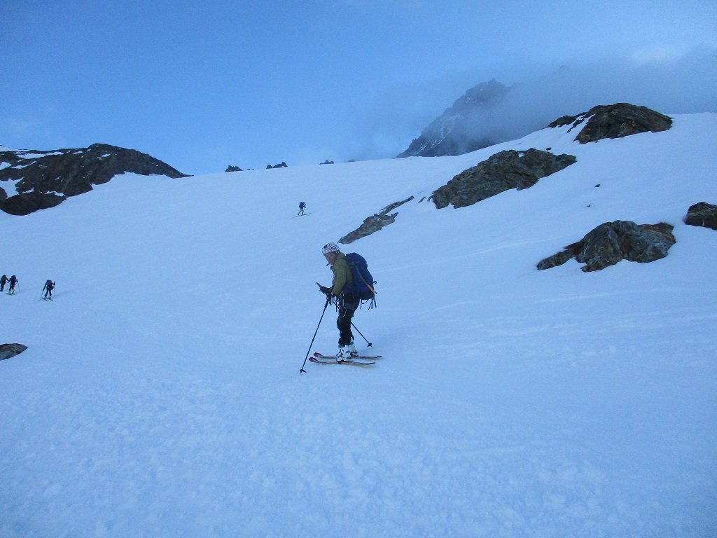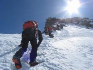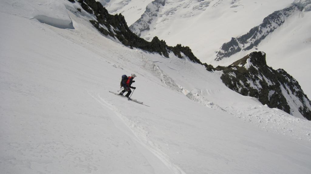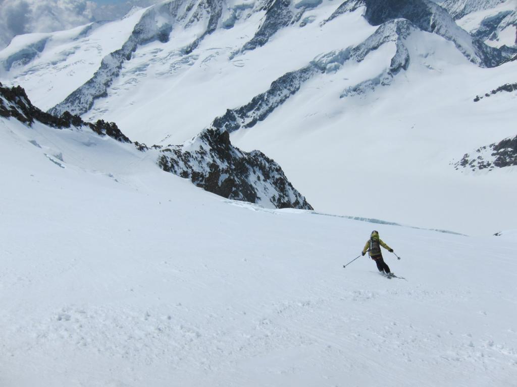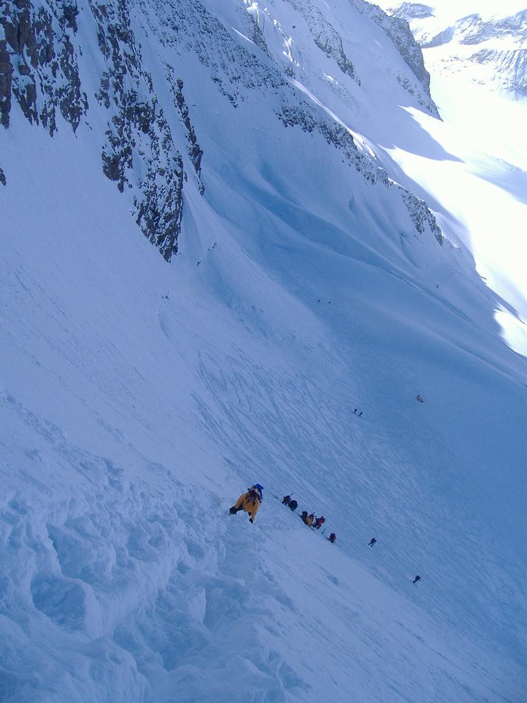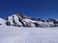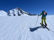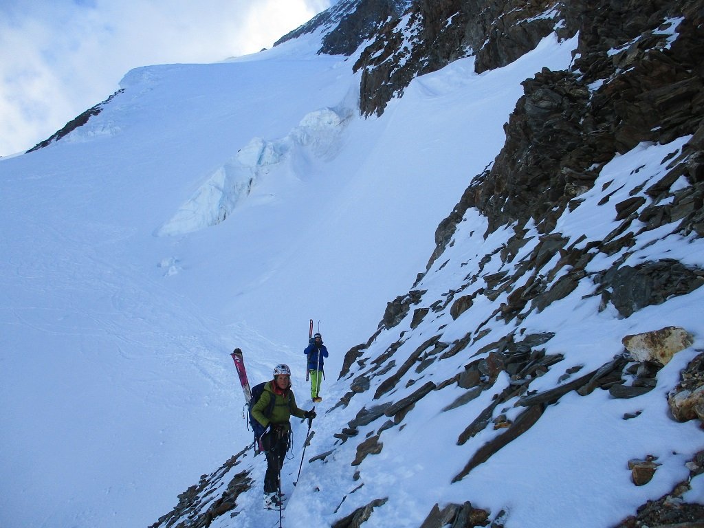 Attraversare orizzontalmente verso NE e risalire la ripida rampa glaciale fino all’ Hugi Sattel dove si lasciano gli sci ( 4088 mt ).