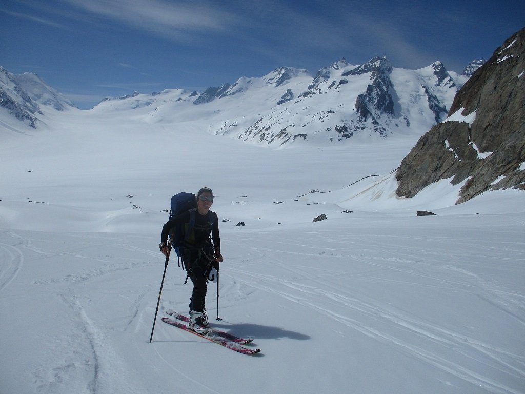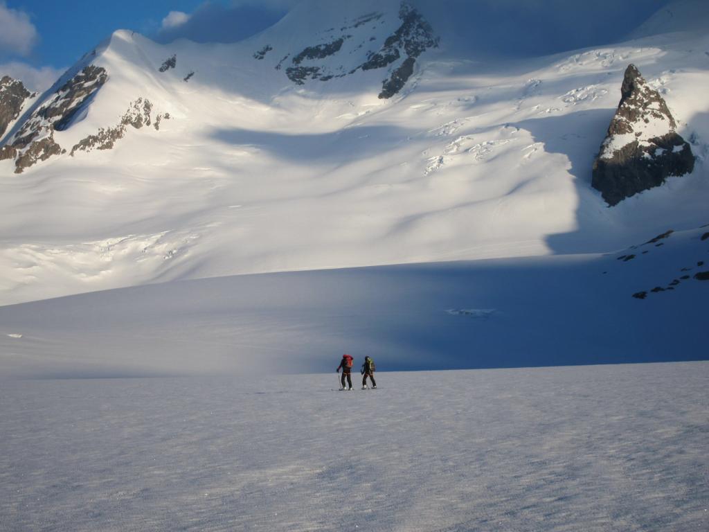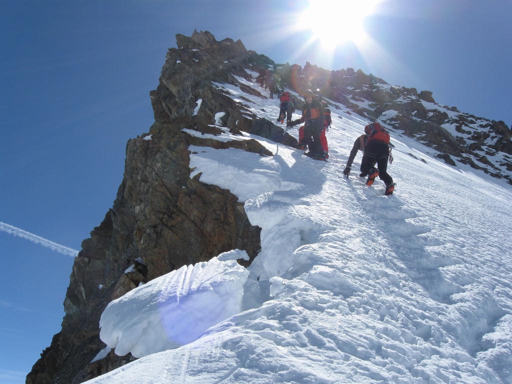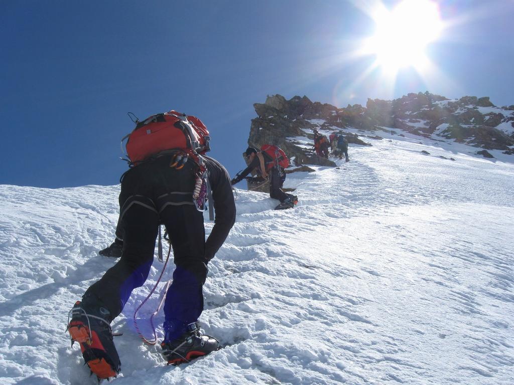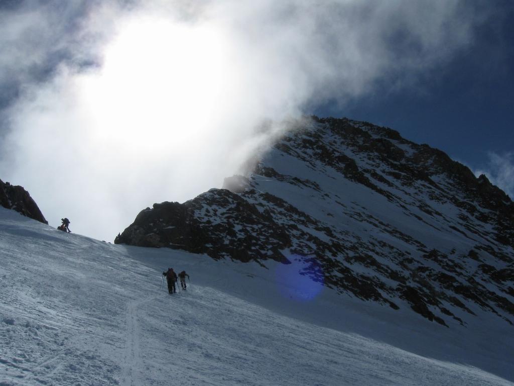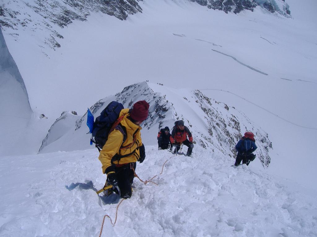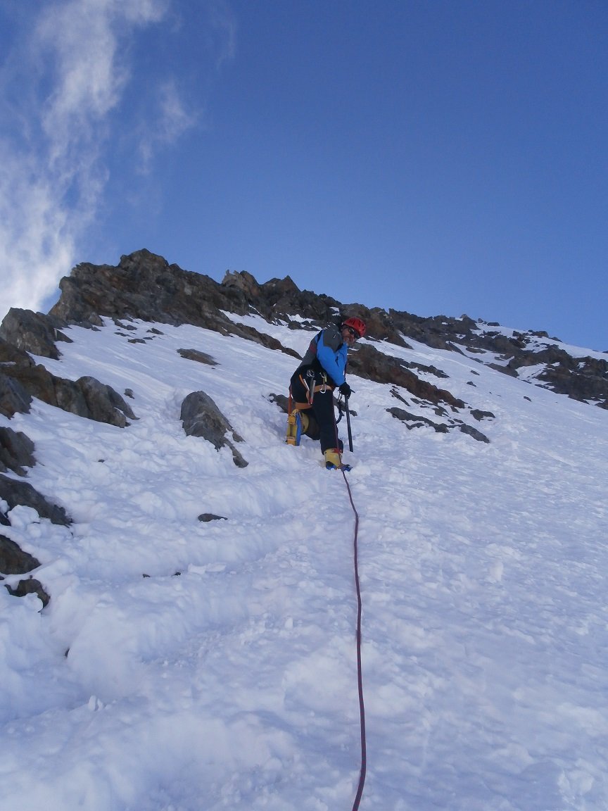 Attraversare orizzontalmente verso NE e risalire la ripida rampa glaciale fino all’ Hugi Sattel dove si lasciano gli sci ( 4088 mt ).