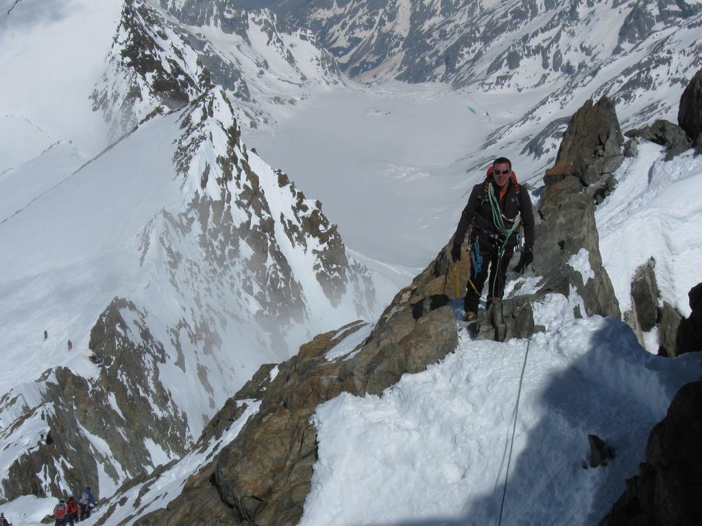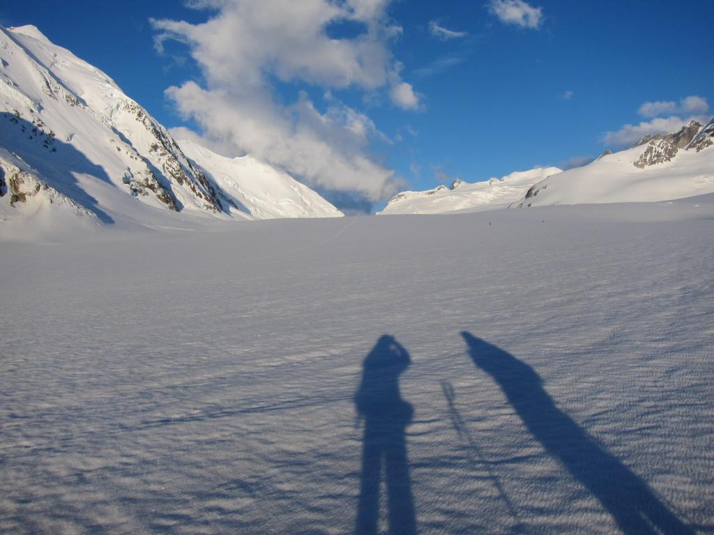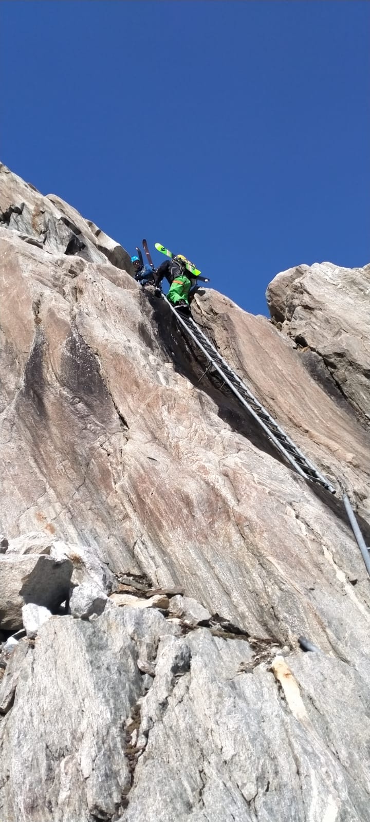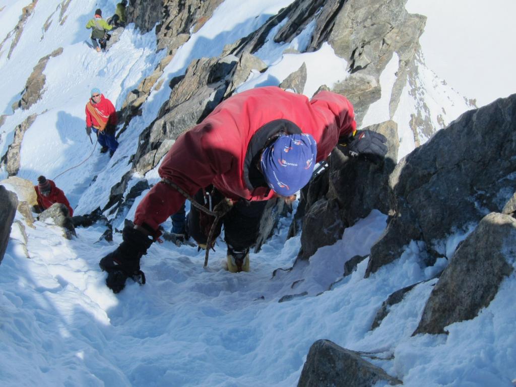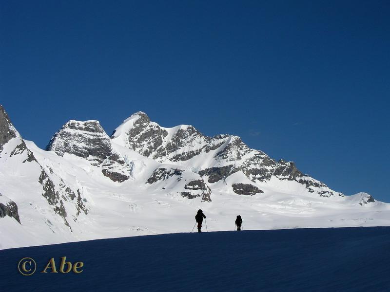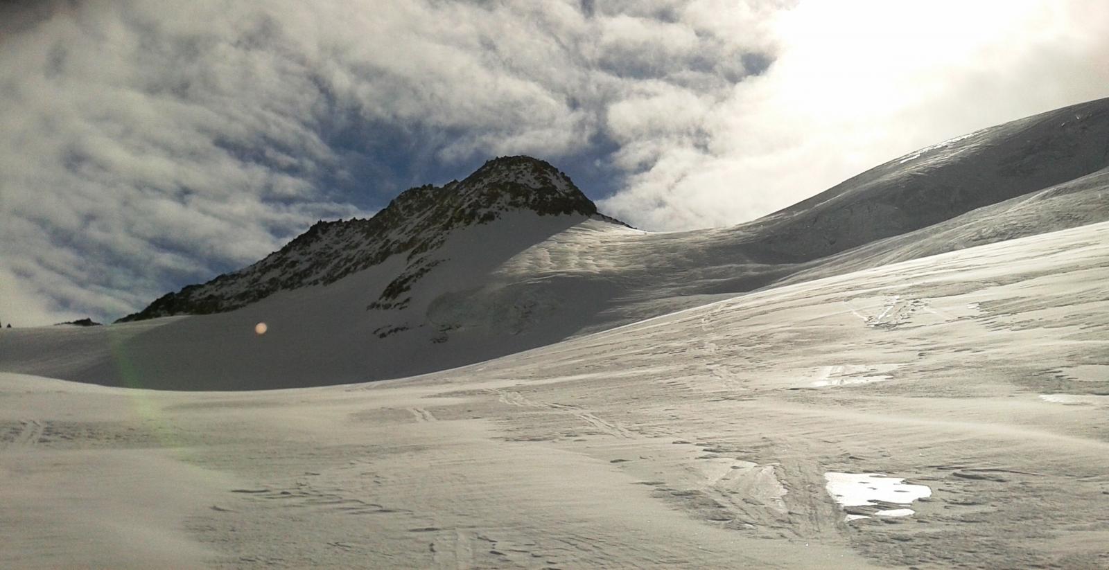 Attraversare orizzontalmente verso NE e risalire la ripida rampa glaciale fino all’ Hugi Sattel dove si lasciano gli sci ( 4088 mt ).