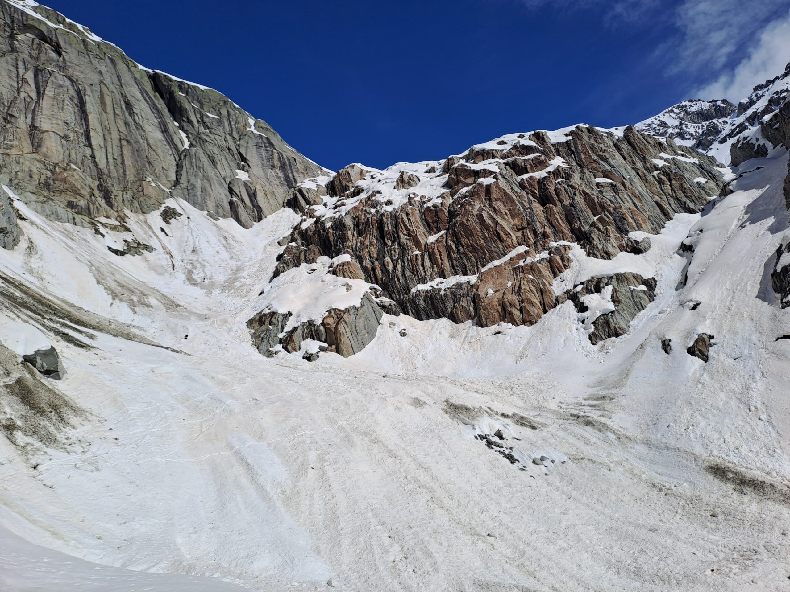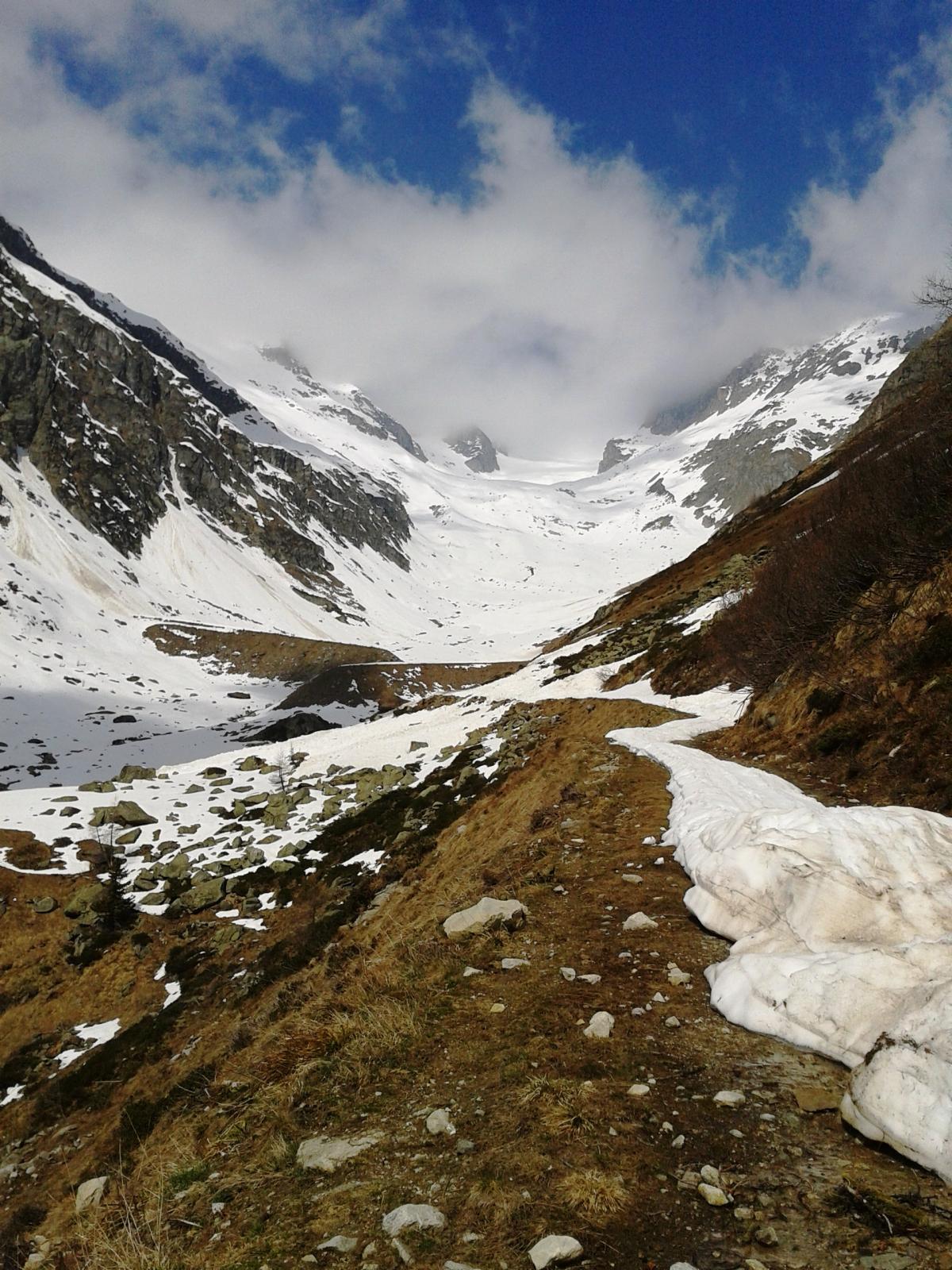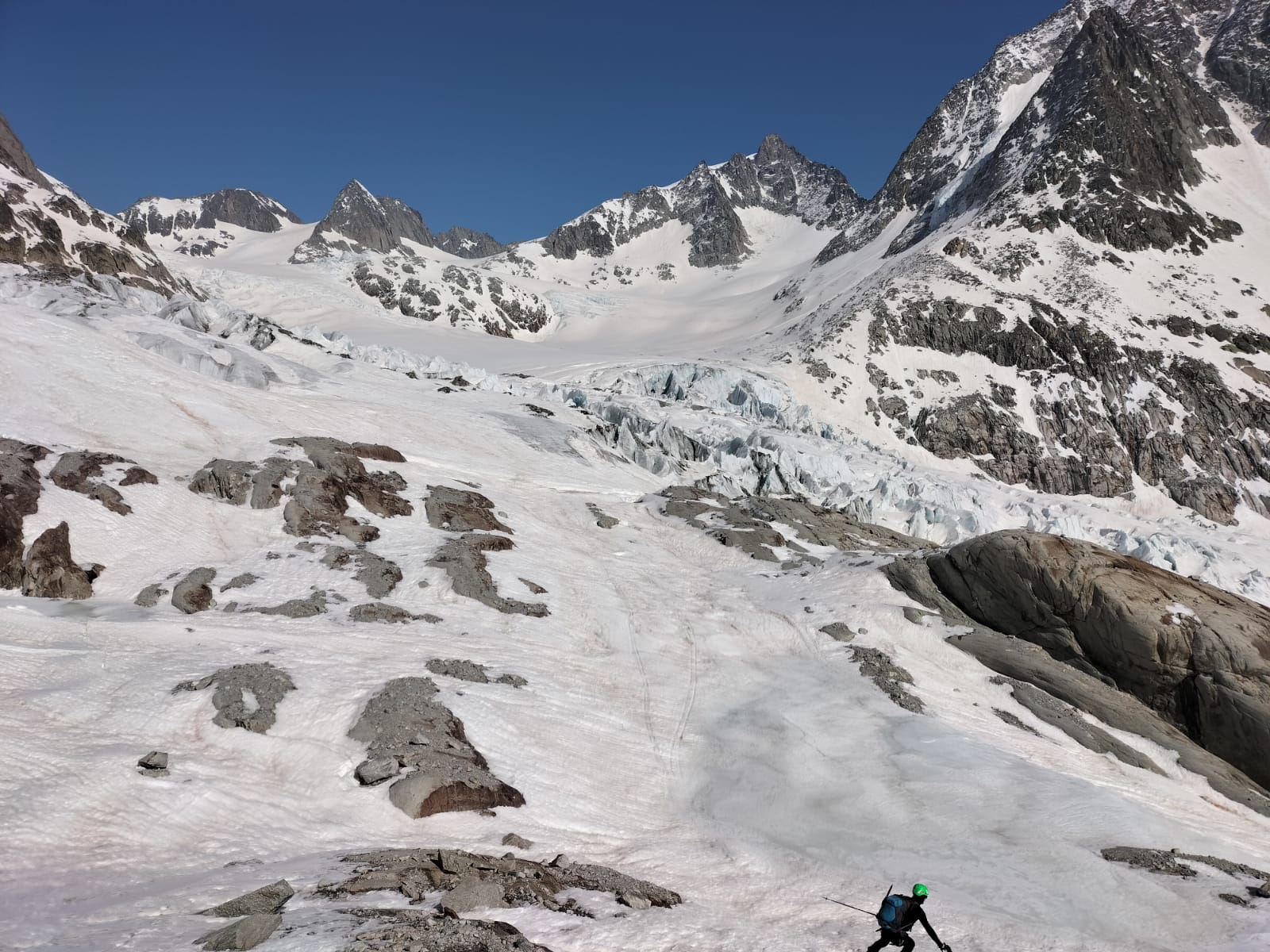 Dalla capanna risalire il ripido pendio che conduce al ghiacciaio vero e proprio.