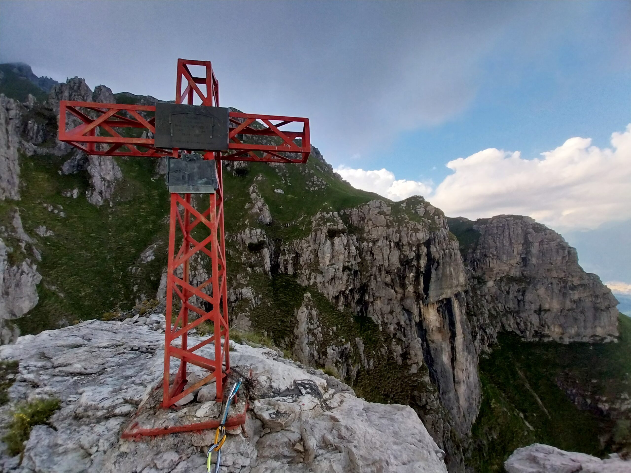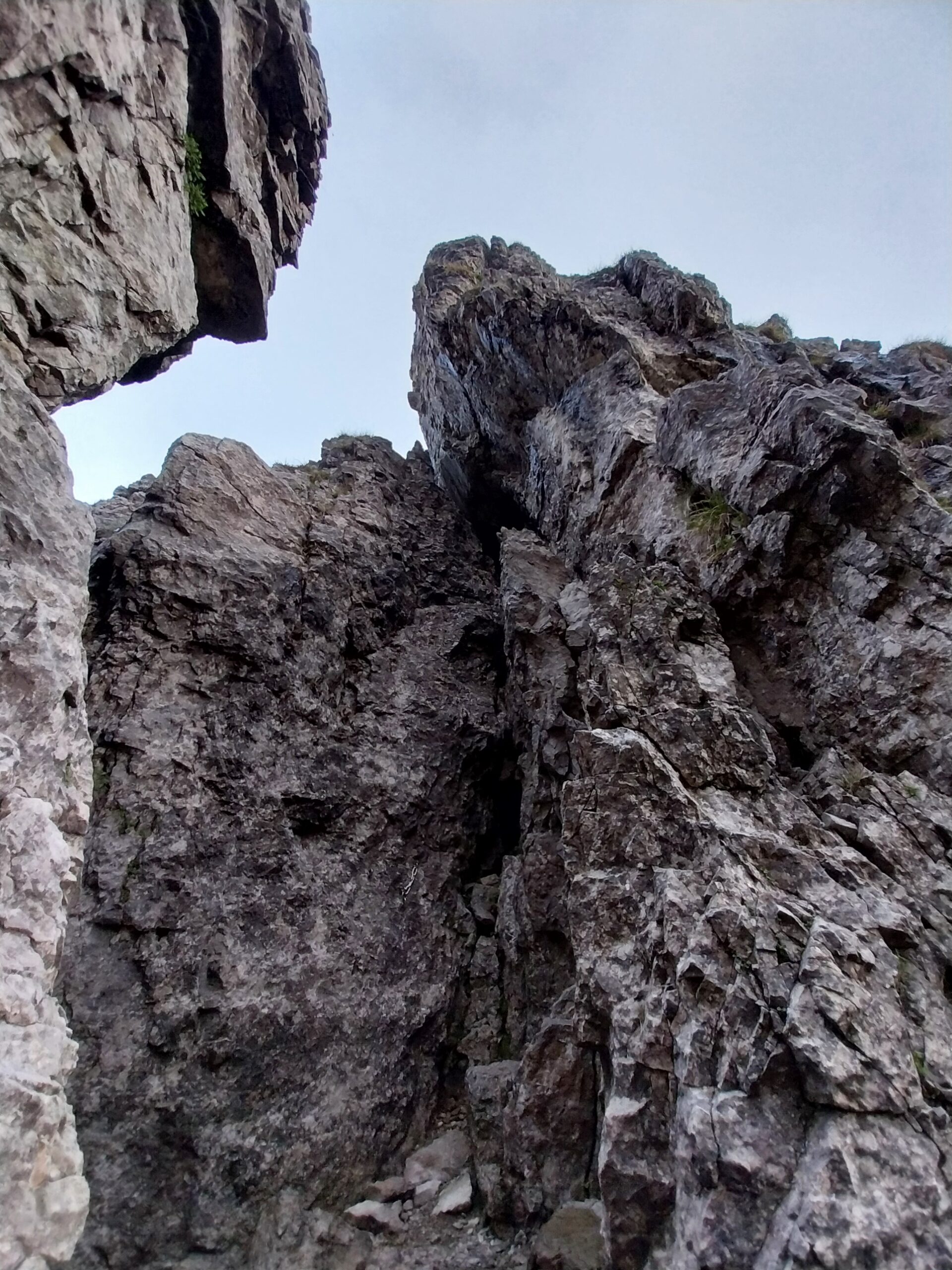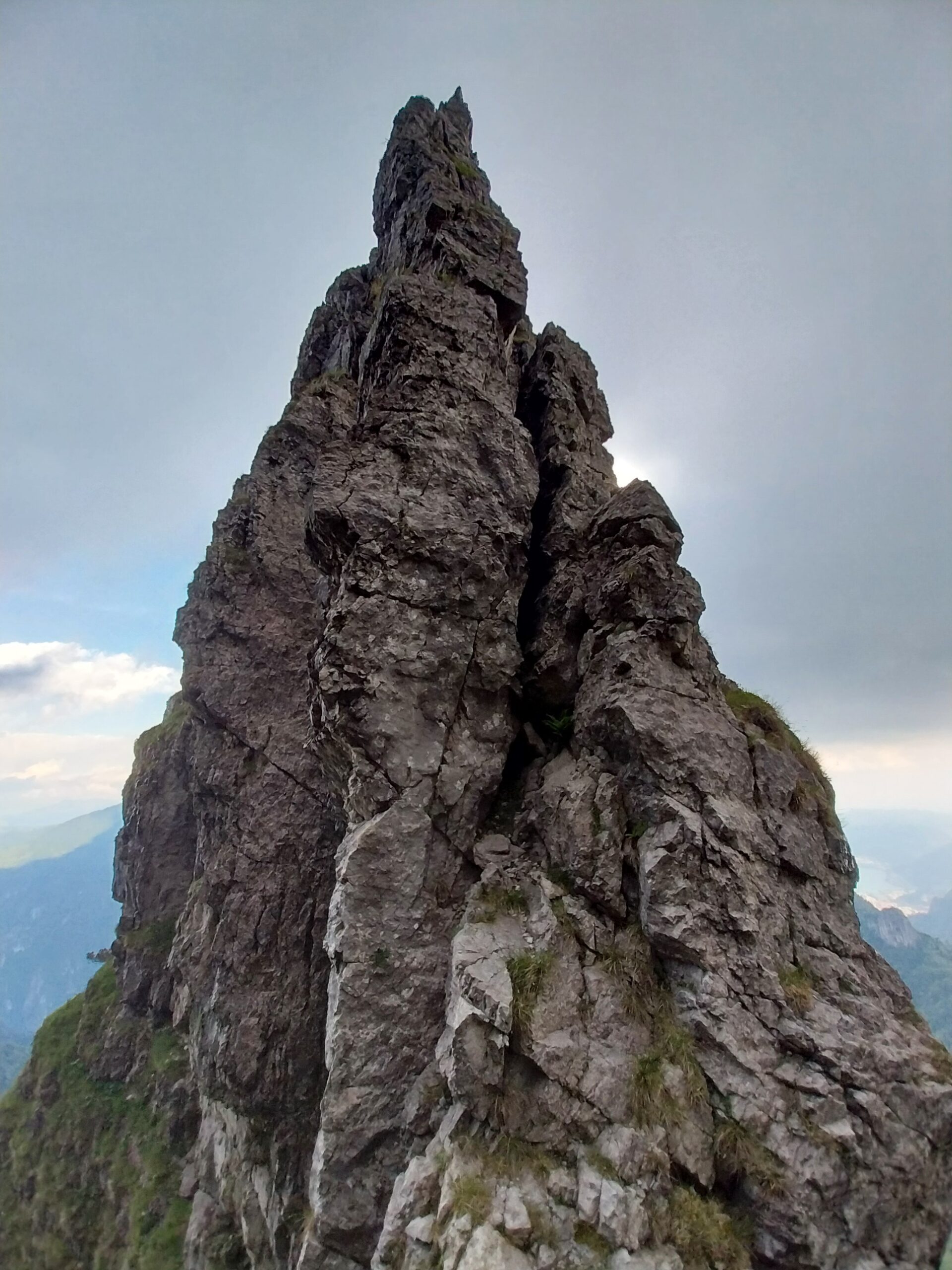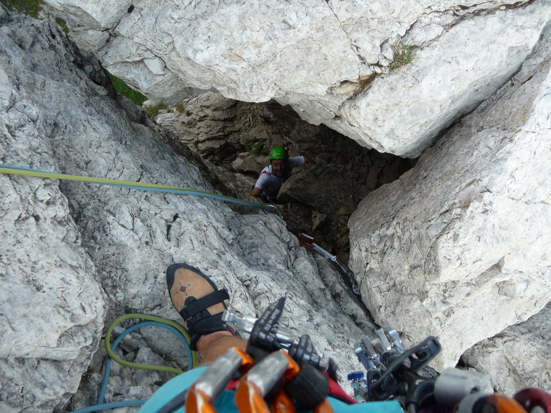 - L3, III+:Sempre a sinistra si prosegue dentro il canale, fino ad un nuovo tratto di cengia. Seguirla fino ad un camino che si sale direttamente (roccia viscida), sbucando in vetta da una stretta apertura fra le rocce (consigliato non salire con lo zaino!).Discesa