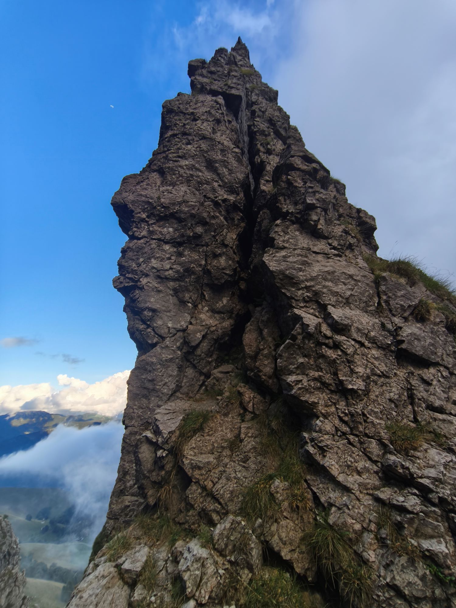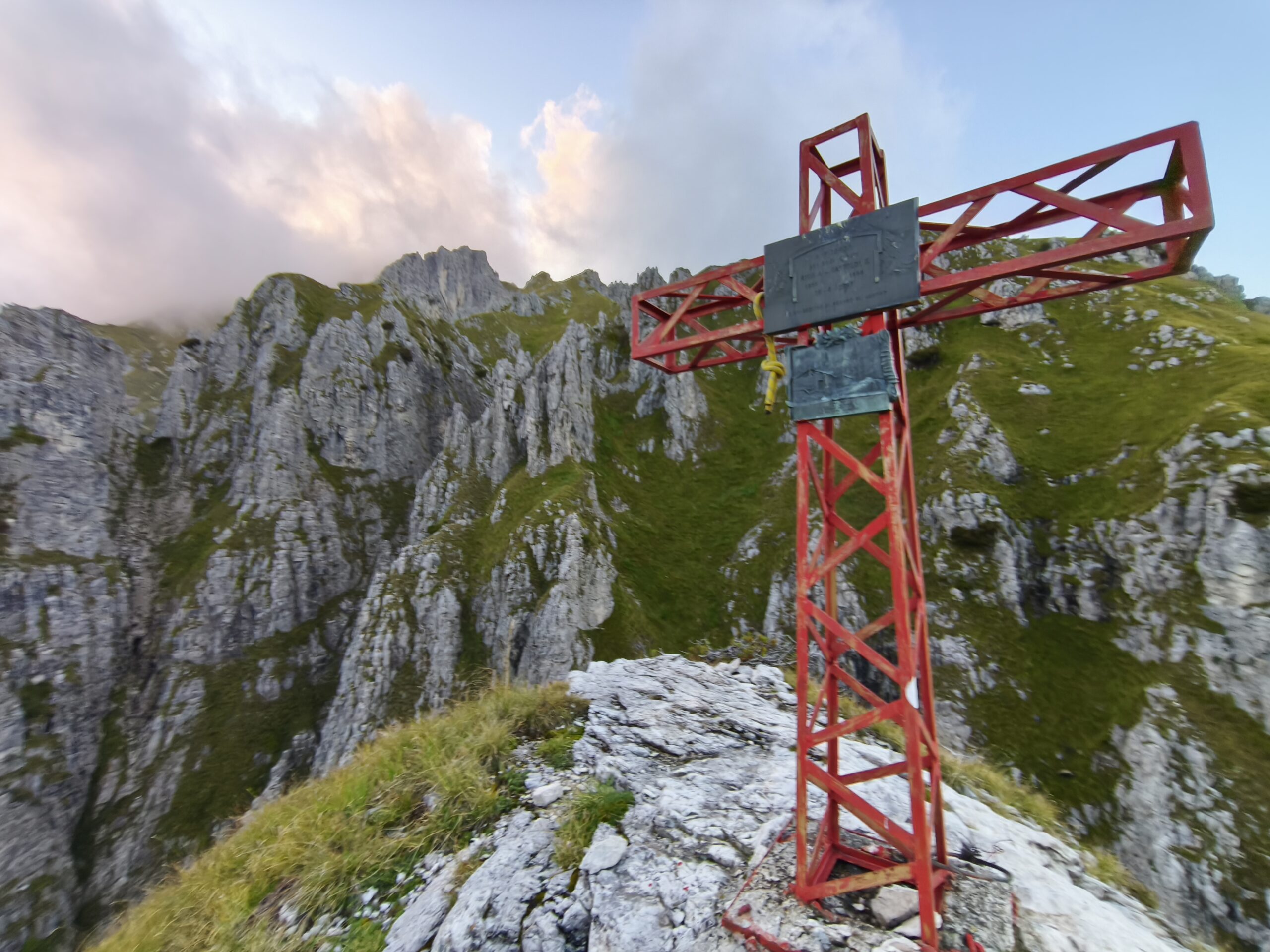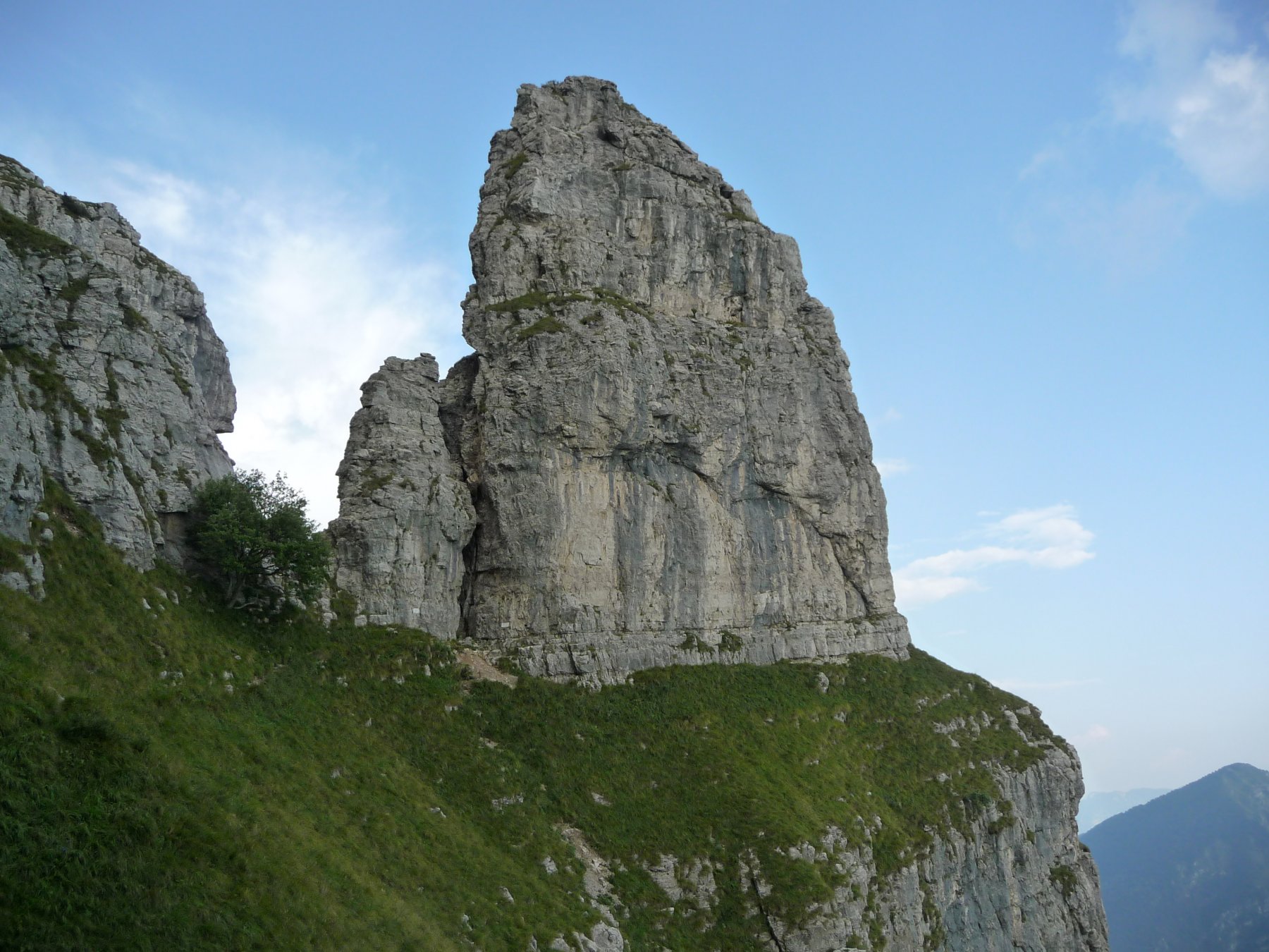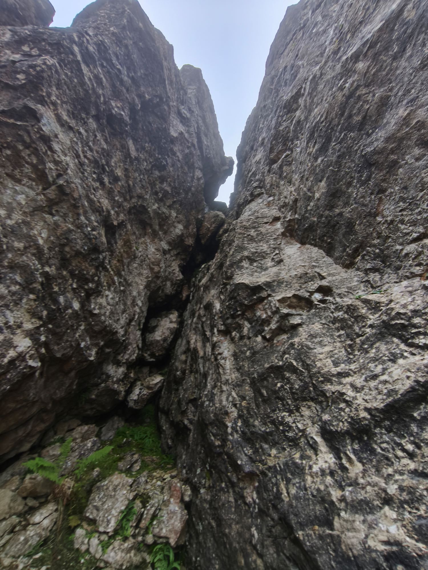 - L3, III+:Sempre a sinistra si prosegue dentro il canale, fino ad un nuovo tratto di cengia. Seguirla fino ad un camino che si sale direttamente (roccia viscida), sbucando in vetta da una stretta apertura fra le rocce (consigliato non salire con lo zaino!).Discesa