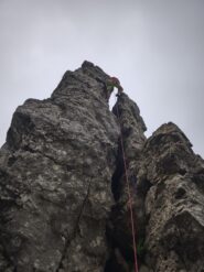Via bella, non difficile, visto la gradazione, ma non banale, in un paio di punti di non facile individuazione. Spesso in canali/camini, con tratti molto esposti ed in alcuni punti roccia viscida.