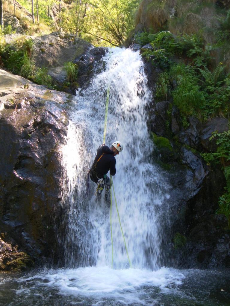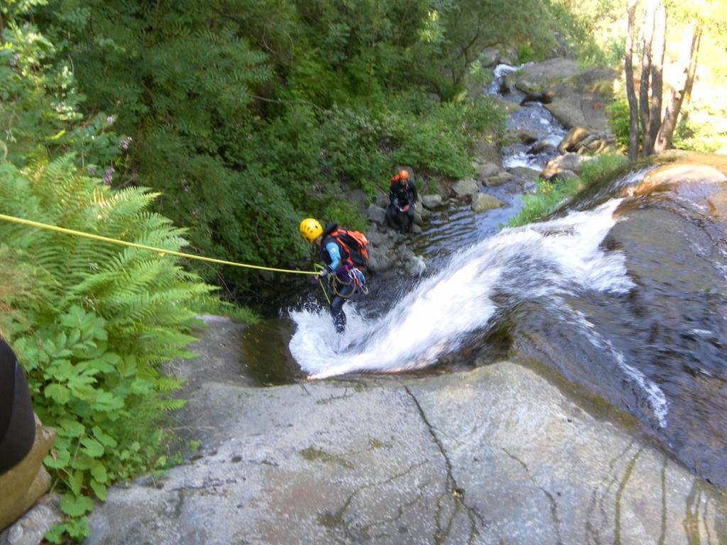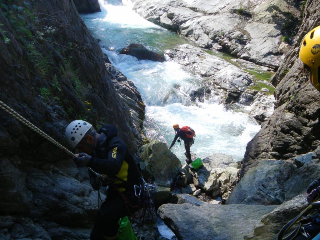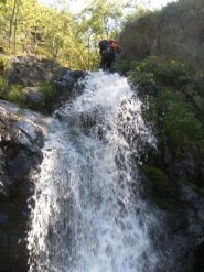 Si prosegue a piedi fino ad un tornante con segni rossi e bianchi sentiero che in 10 minuti conduce alla torrente e alla prima calata su armo naturale.