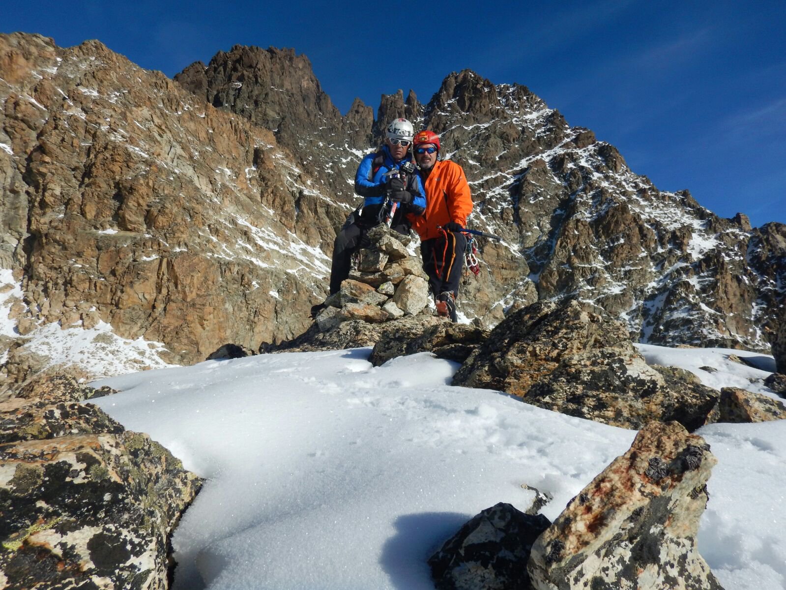Siamo saliti dal canale innevato e poi facilmente in vetta,poi siamo andati al colletto Corsica per divertente canalino ….la neve con esposizione Est e’ trasformata e tiene ,l’altra sfonda di brutto…