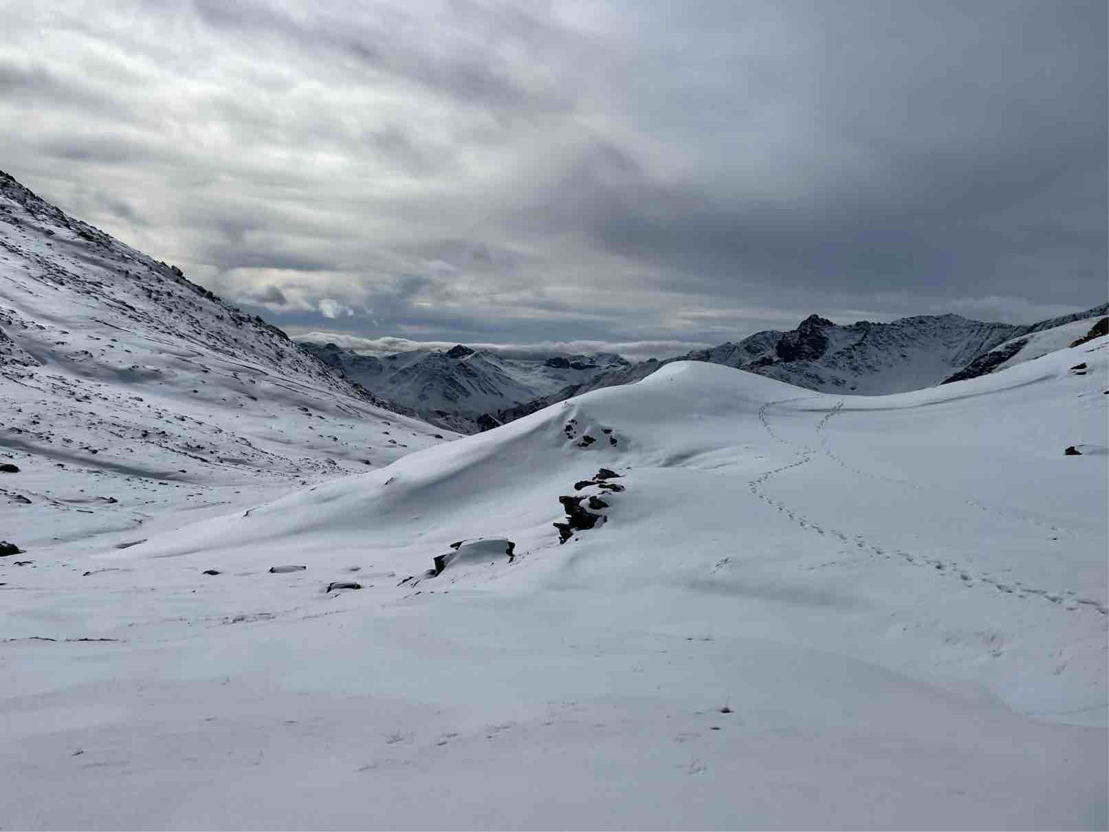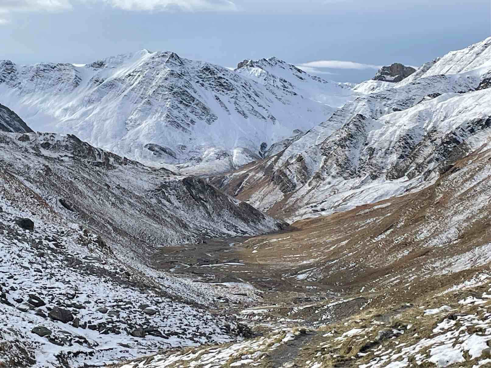 Seguire il fondo del vallone che con direzione nord e poi est raggiunge il passo di Fiutrusa con evidente itinerario per facili pendii (il sentiero compie un semicerchio più largo sulla sinistra, volendo si può passare alla destra senza sentiero ma con percorso più diretto).