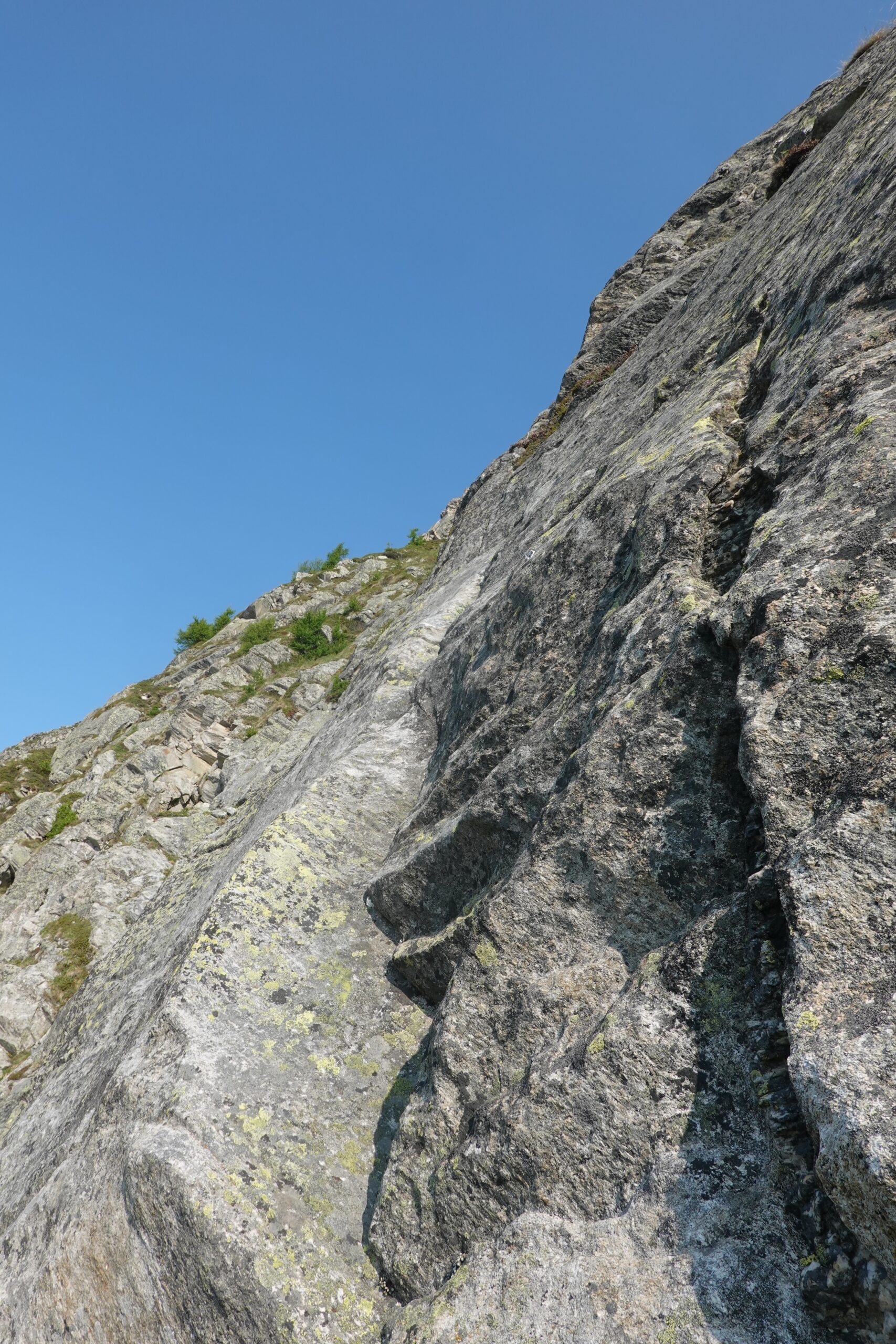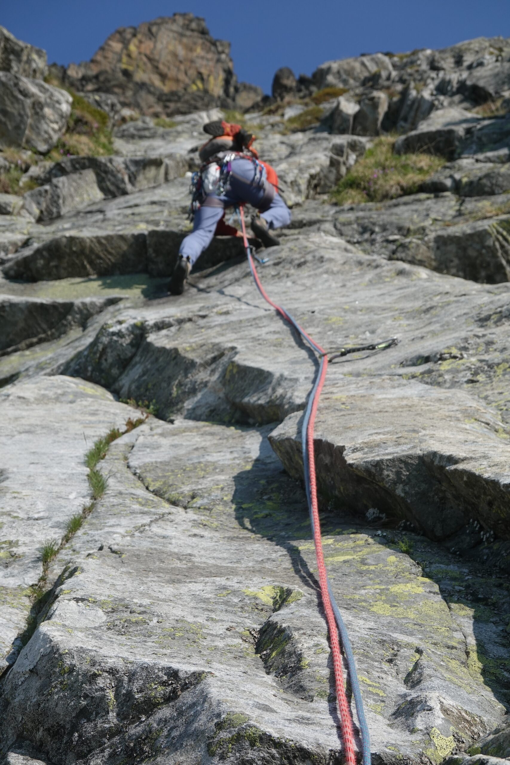 Inizia qui la prima parte della salita con 14 tiri di corda da 35 mt (eventualmente giuntabili per accelerare); in questo tratto sono presenti alcune cenge erbose che non infastidiscono la salita, pur rendendola un pò discontinua.