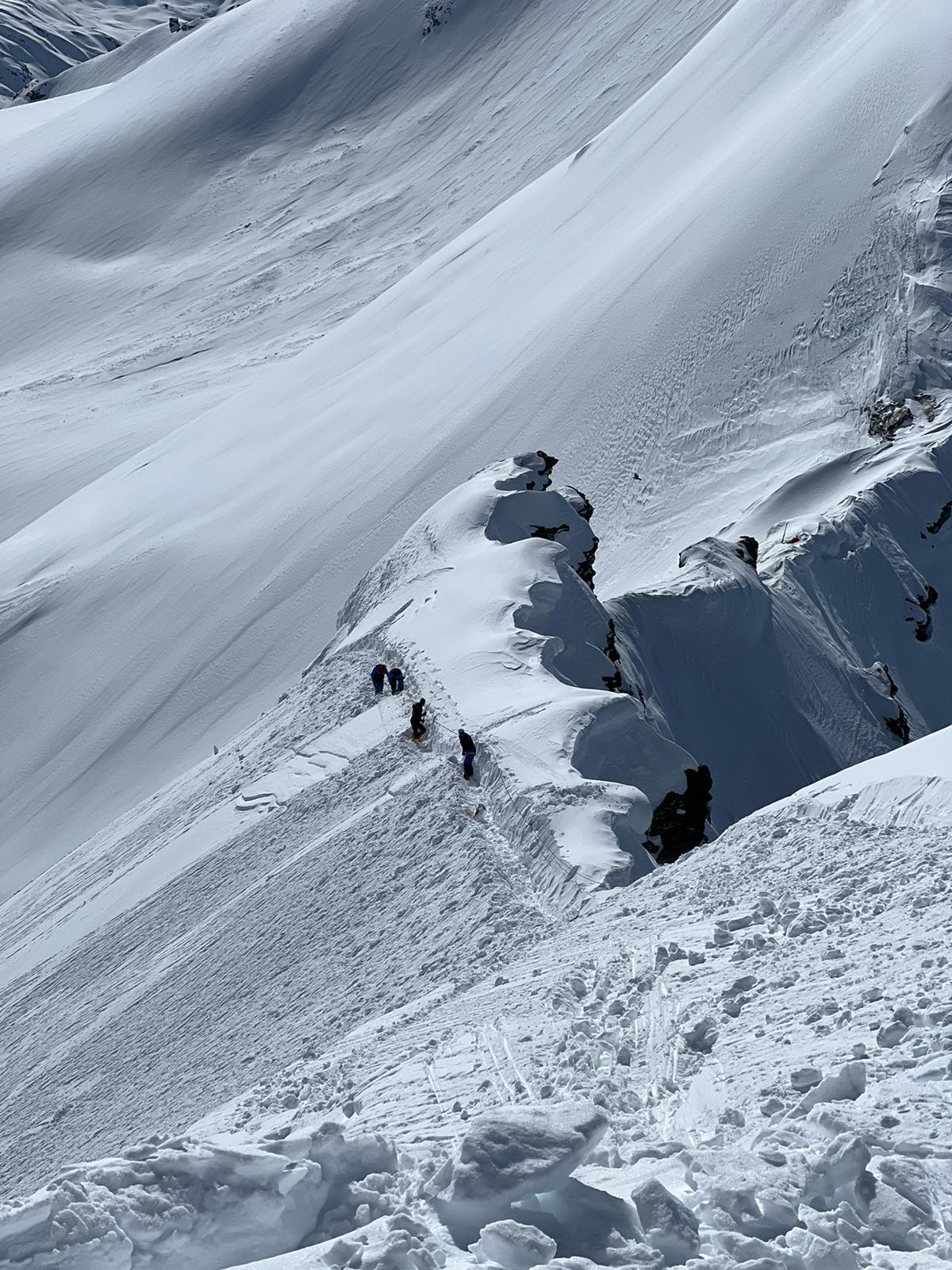 Dal parcheggio inoltrarsi in direzione (Sud-Ovest) degli alpeggi di Orfeuille seguendo a piacimento la poderale o i prati. Questa parte del percorso è in comune con il più frequentato itinerario dello Chateau Blanc. Il tratto iniziale è soggetto a numerose valanghe di grandi dimensioni. Giunti all’alpeggio a circa 2000 m ci si trova davanti un pendio ripido che da accesso ad un grosso ripiano. Superato il pendio ripido e il ripiano, tenere di preferenza la valletta alla propria dx che sale alla base del ghiacciaio. Sbucando ai 2.900 metri di quota (circa), traversare in direzione del colle di Planaval cercando il più possibile di non perdere quota. Un ultimo strappo ripido difende l’accesso al colle. Una volta guadagnato il colle, salire la cresta che porta ai 3315 m di quota della cima. Dall’omino di vetta si prosegue sulla cresta che diventa sempre più esposta. Inizialmente si scende aggirando lato Valgrisenche un roccione fino ad un intaglio. Da qui si ritorna a salire (o sul filo di cresta, o stando leggermente sul lato di La Thuile) per raggiungere l’anticima sud. Dall’anticima si scende brevemente lungo la cresta prima di raggiungere un ripido pendio che permette di scendere al sottostante ghiacciaio. Giunti sul ghiacciaio, si rimontano le pelli e, con direzione sud, si prosegue fino al colle di Chateau Blanc. Questo colle permette di scendere nuovamente a Planaval con numerose varianti solitamente già tracciate da chi pratica l’heliski.