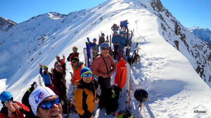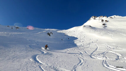 Seconda uscita per 22 G.a.s.a.t.i. (Cai Chivasso), con giornata serenissima e fredda. La neve sarebbe ancora bella e farinosa, ma purtroppo è segnata dalle migliaia di passaggi; a fatica si trova ancora qualche fazzoletto. Dall’ Alpe Flassin in giù è una pista ormai davvero larga e bellissima da sciare, così come tutta la strada, che è ottimamente innevata non prendendo in questa stagione neanche un minuto di sole!