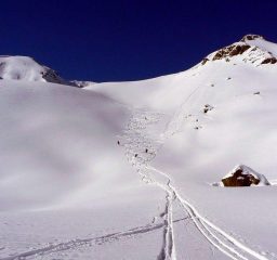 Finalmente le solette non corrono più pericoli, la neve è presente già alla partenza, 25 cm circa, poi aumenta fino a 60 cm circa di fresca. Il vento ha soffiato molto, ma il vallone è sufficientemente protetto da poter sciare quasi sempre su farinosa e/o ventata morbida, che tende a frenare un po’ lo scorrimento in discesa, obbligando ad andare dritti sulle pendenze lievi.