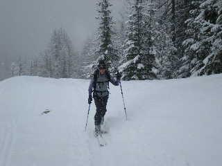 Dal piazzale 15′ di sci in spalla con pioggia fitta e poi fiocconi di neve bella dal cielo, neve bella sotto gli sci, bella compagnia…Insomma, purtroppo senza visibilità ma sempre in sicurezza e con un’ incredibile e inaspettata neve primaverile, con un ambiente ovattato quasi natalizio, a metà aprile…Bella la mia montagna.