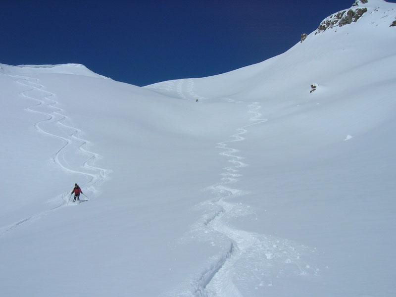 partenza con forte vento calato e poi sparito già dal bosco.Qualche folata ma poi niente fino in cima o meglio colle.Condizioni di neve sicure a patto di non scendere per le massime pendenze.Sceso dal colle per un canalino non troppo ripido su farina leggermente pesante fino al dossone poi via via sempre più umida e pesante da spostare (circa 40-50cm di fresca) fino all’alpeggio scendendo tutto a sinistra.Come resistere alla tentazione di risalire??pronti via di secondo giro fino al colle e giù con aratura sistematica..dall’alpe stando sul dosso ancora farina sciabile poi piegando a sinistra un tratto di bel crostone non portante e dopo crosta al limite del portante (sciare leggeri leggeri..)con un velo di polvere sopra fino al bosco.altra crosta e la parte finale un simil-firn fino a metà pratone e dopo pura sopravvivenza non si riusciva nemmeno a scendere a spazzaneve dal “crustun”.quarta stella presa per il bis della bellissima parte alta altrimenti ne valeva solo 3.