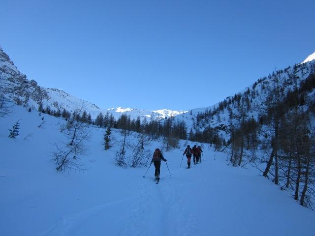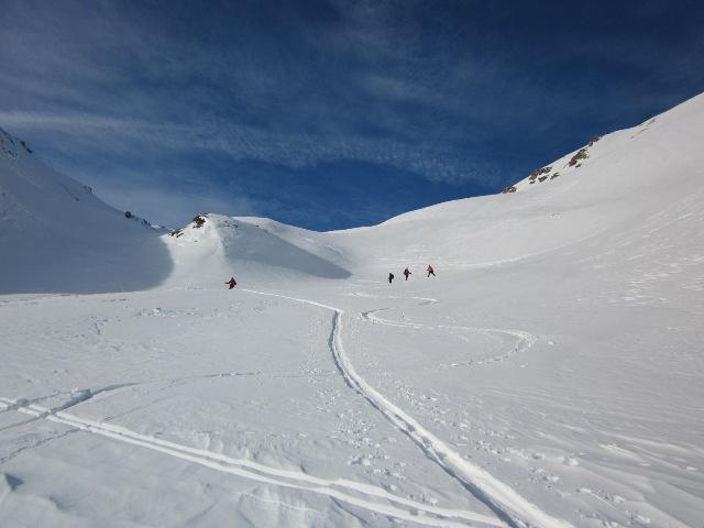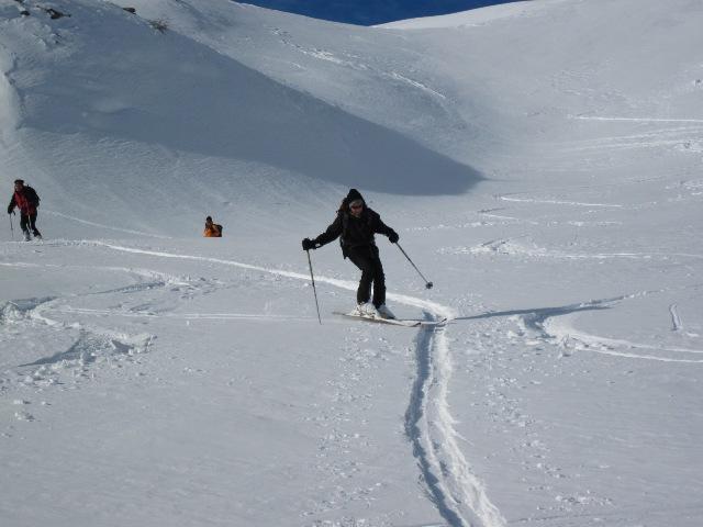 Discesa iniziata intorno alle 13.15. Nella parte alta si trova un po’ di tutto, dalla farina (un po’ pesante ma bella!!!), alla crosta portante, alla crosta non portante. Noi siamo scesi sulla sinistra, nel vallone che porta alla Testa Cordella; stando nelle zone più riparate dal sole e dal vento si riesce comunque a sciare decentemente, anche se bisogna fare molta attenzione perché la neve cambia all’improvviso e ci si ritrova all’improvviso a passare dalla farina alla crosta!!! Quando si entra nel bosco la situazione migliora e si trova dell’ottima farina con ampi spazi ancora vergini e solo negli ultimi 200-300 metri in basso c’è di nuovo un po’ di crosta; qui conviene stare dove il sole l’ha scaldata e ammorbidita un po’.