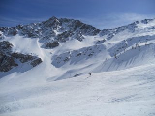 Partenza dal parcheggio ore 08,30 : otto gradi e vento fastidioso, fino alla fine del bosco e poco sopra ( 2200 mt ) neve dura ventata; da questa quota fino all’alpegggio qualche cm di neve caduta a meta’ settimana; dall’alpeggio il sole scalda la salita, quindi la neve. Giungiamo al colle dove un forte vento ci accompagna fino a poco sopra dove togliamo gli sci. In due saliamo con i ramponi fino all’anticima.Discesa su neve quasi sempre primaverile.