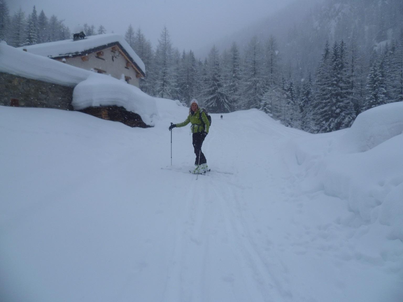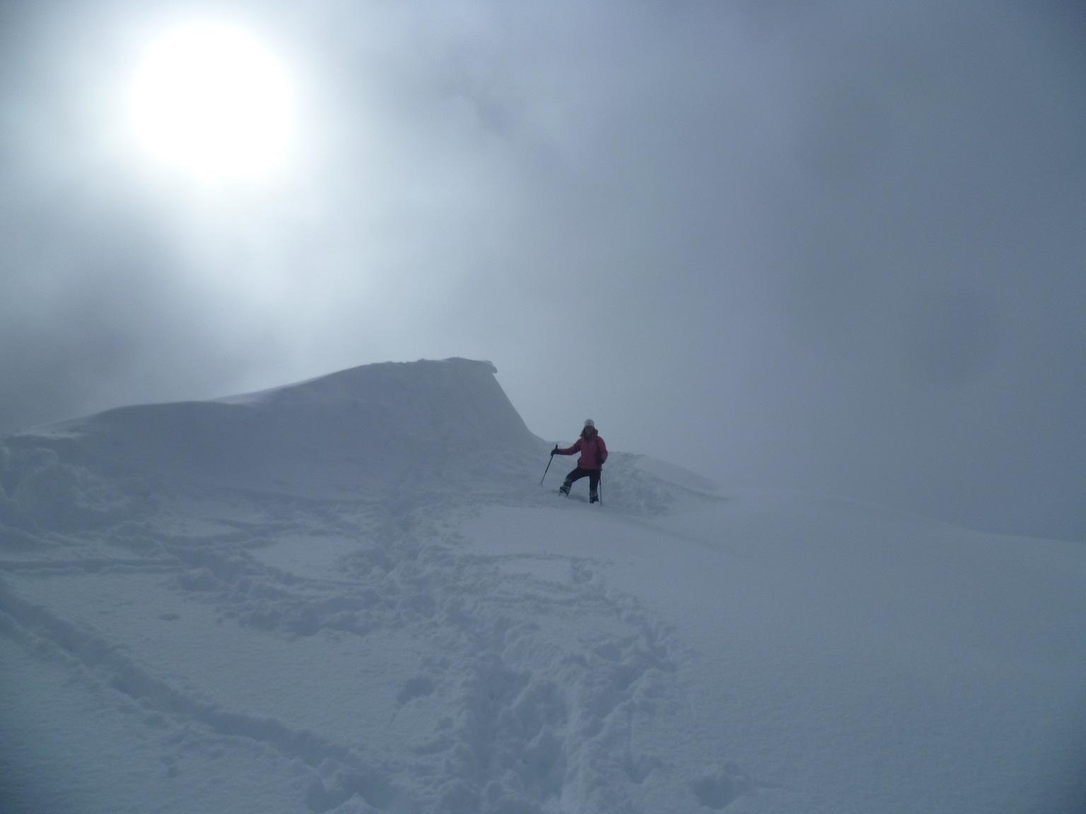 La giornata grigia non invoglia, ma si parte lo stesso. Salita sotto una leggera nevicata fino alle baite, poi squarci di azzurro alternati a passaggi nuvolosi che limitano la visibilità a poche decine di metri. Una decina di cm di fresca al foyer e una buona trentina sui pendii della vetta. Bellissima e divertente discesa nella polvere da cima a fondo, peccato solo per la visibilità a tratti veramente scarsa.