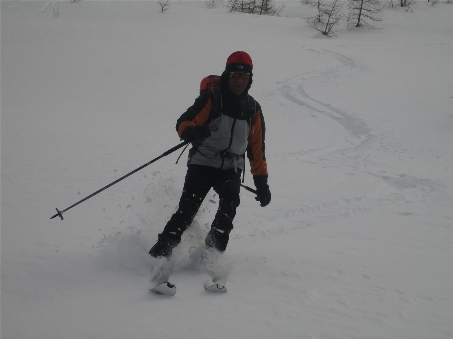 Discesa per i primi 200 m. dsl su neve leggermente ventata, gessata e con crosta in formazione su pendii dolci che obbligavano ad andare diritto ed a spingere su brevi tratti.