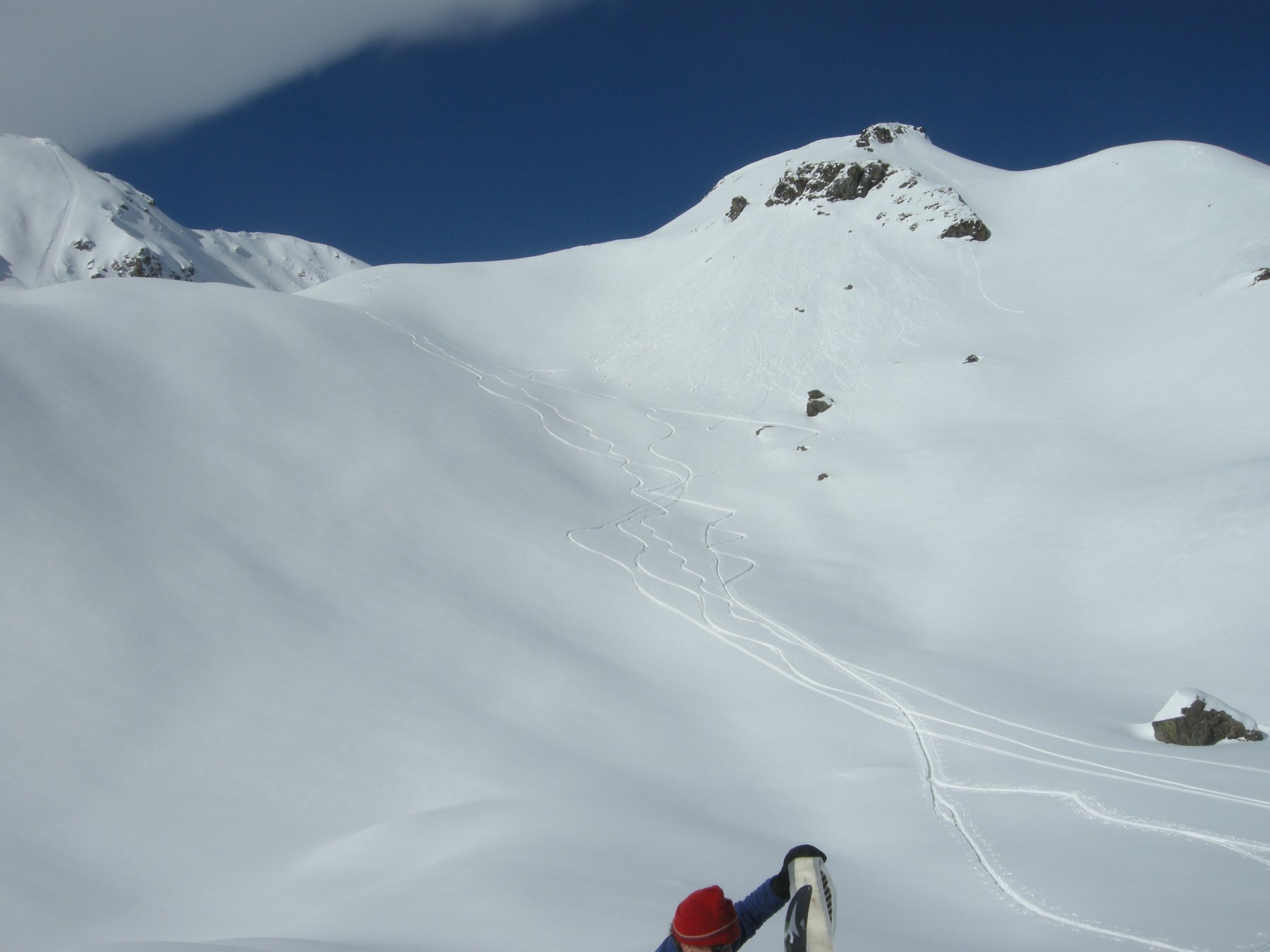 la nevicata recente si apprezza dalla baita in su dove era tutto vergine ma comunque non facile da sciare su 30/35 centimetri pesantucci, i pendii sottovento sono belli carichi e non ci siamo sentiti di salite sotto il traverso del colle.