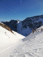 Nella parte piu esposta della salita abbiamo trovato crosta da vento ma buttandoci dentro il canalone la neve è diventata farinosa e divertente.