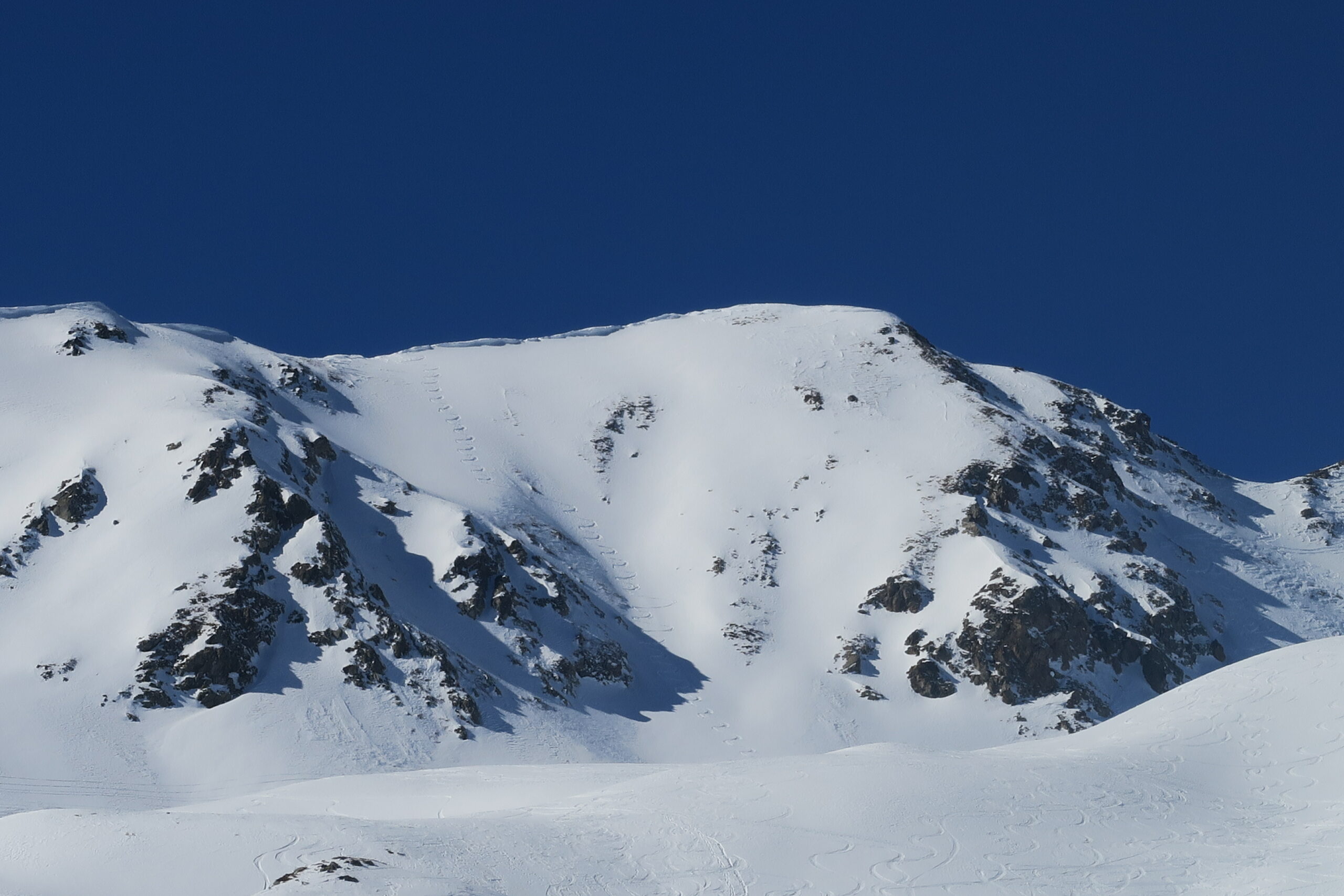 Bellissima discesa sul pendio intonso ed anche in basso fino alla poderale poi comoda e veloce discesa fino al Foyer du Fond che si raggiunge sci ai piedi cercando i passaggi ancora coperti di neve e negli ultimi metri su parecchio ghiaccio