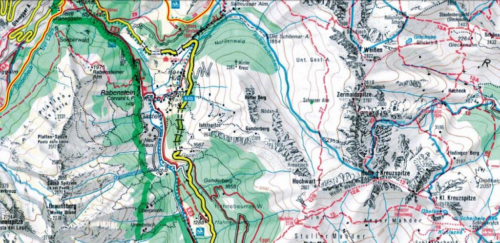 Procediamo lungo il sentiero forestale per ca. 1,5 km e, dopo un tornante a destra, svoltiamo a sinistra per imboccarne un altro. Dopo un ulteriore tornante a destra lasciamo il sentiero forestale e attraversiamo un fitto bosco con un breve tratto ripido, fino a incontrare un altro sentiero forestale, a destra del cosiddetto fienile Waldhüttl (1.744 m).