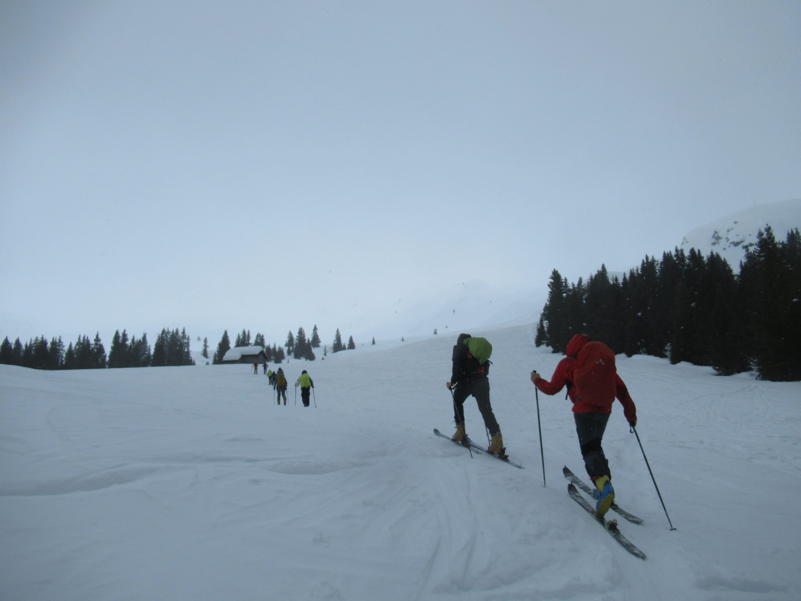 Discesa lungo il percorso dell’ascensione. (NB: Presso il tornante a sinistra (nella direzione della discesa) a 1.620 m non dovremmo scendere diritti (bosco giovane)