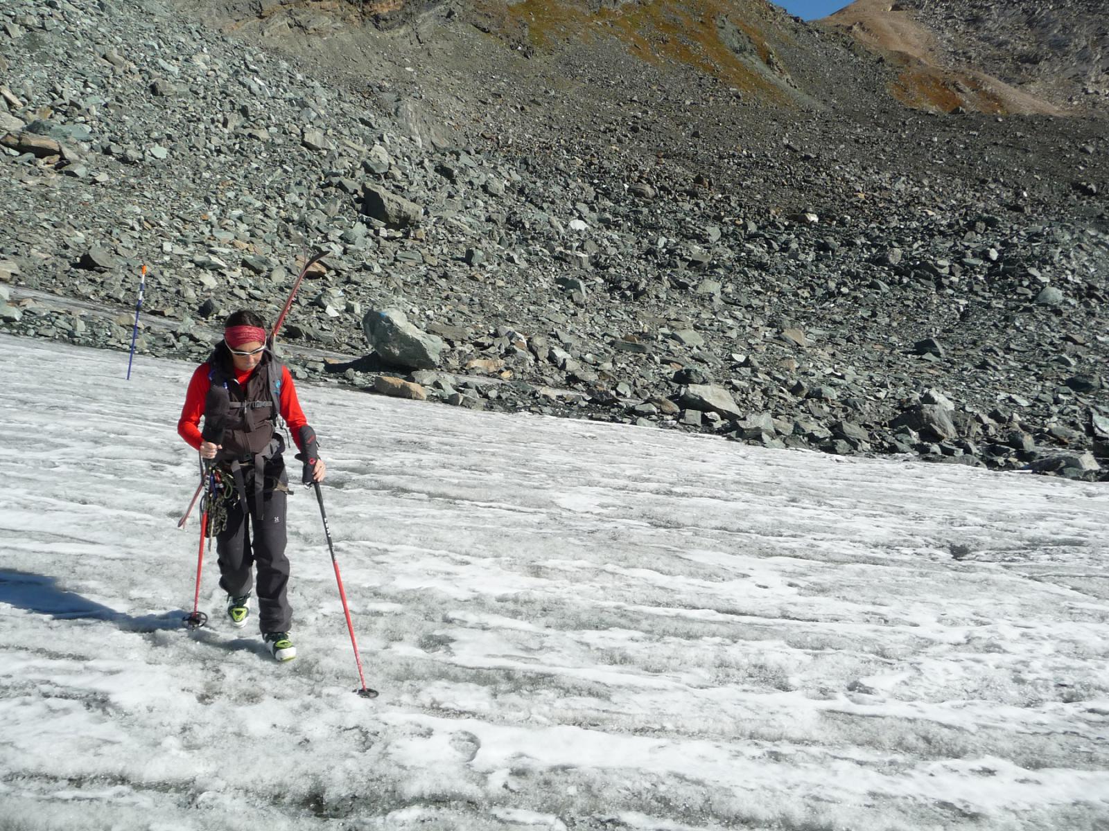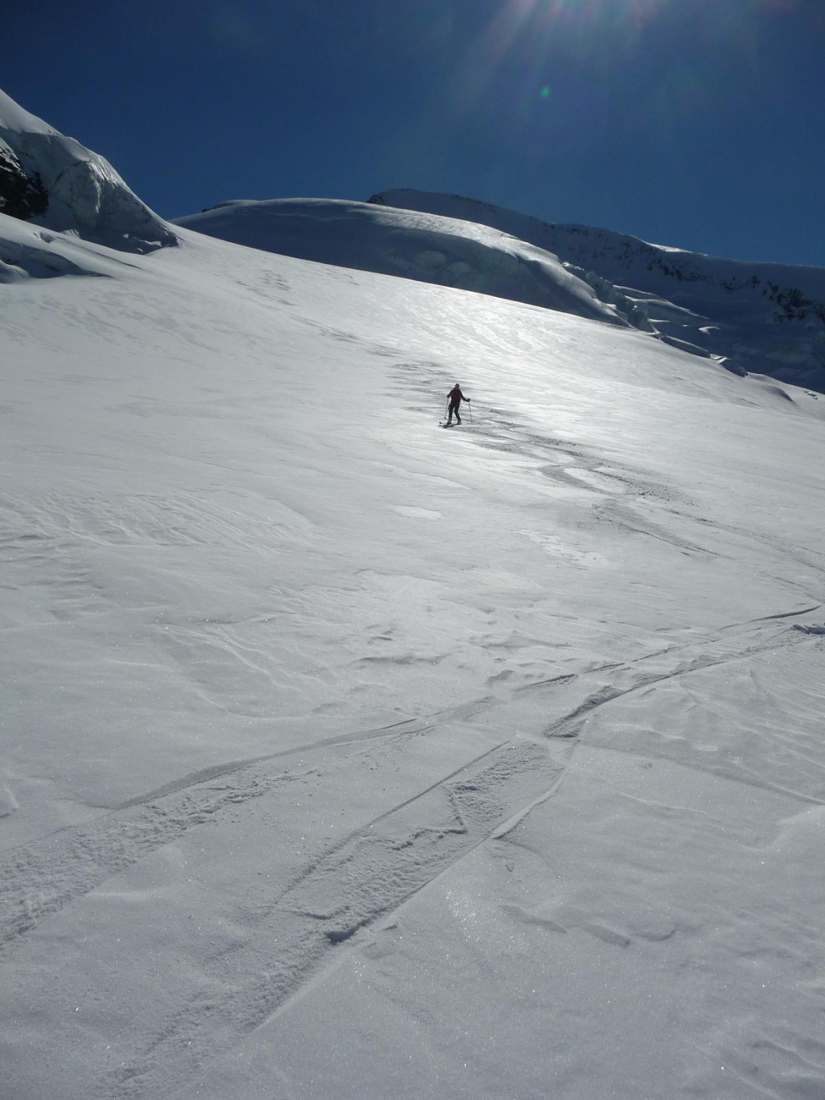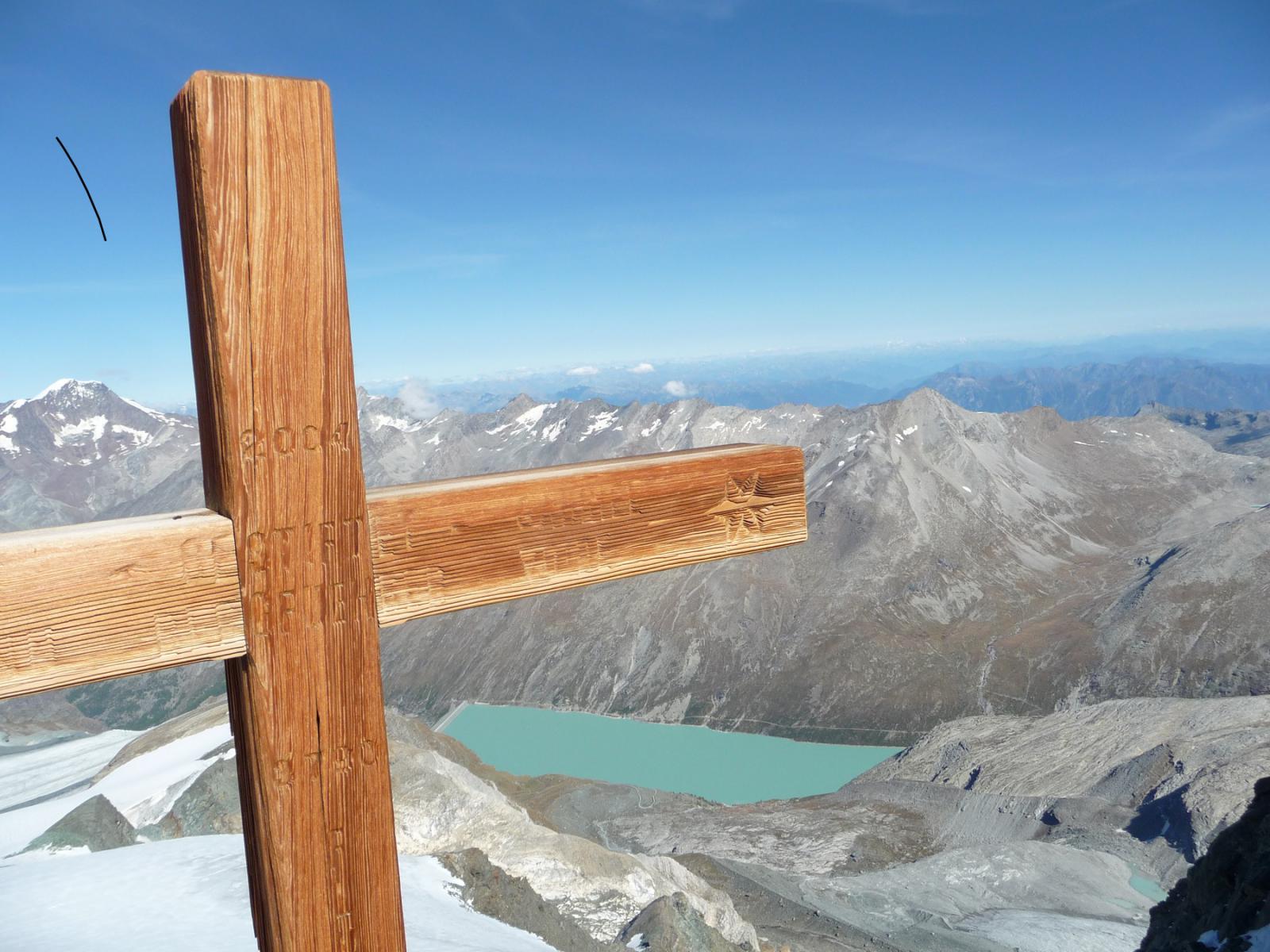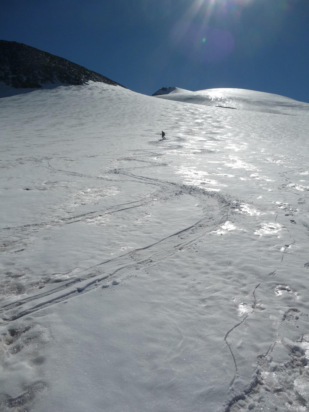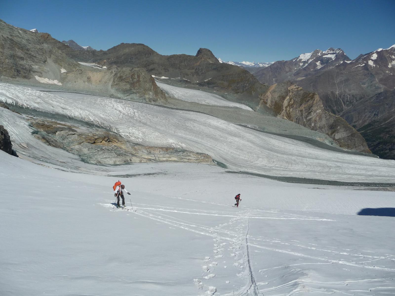 dalla Britannia seguire l’itinerario per lo Stralhornfino a quota 3200m per dirigersi quì verso S. salire alla vetta per percorso evidente. Dalla vetta con un’ampia curva verso destra dirigersi verso lo spartiacque a quota 3306m. e scendere nel ripido vallone di Hangendegletscher. Si raggiunge così l’antica morena del ghiacciaio e con evidente percorso si raggiunge la strada delle gallerie che costeggia il lago.