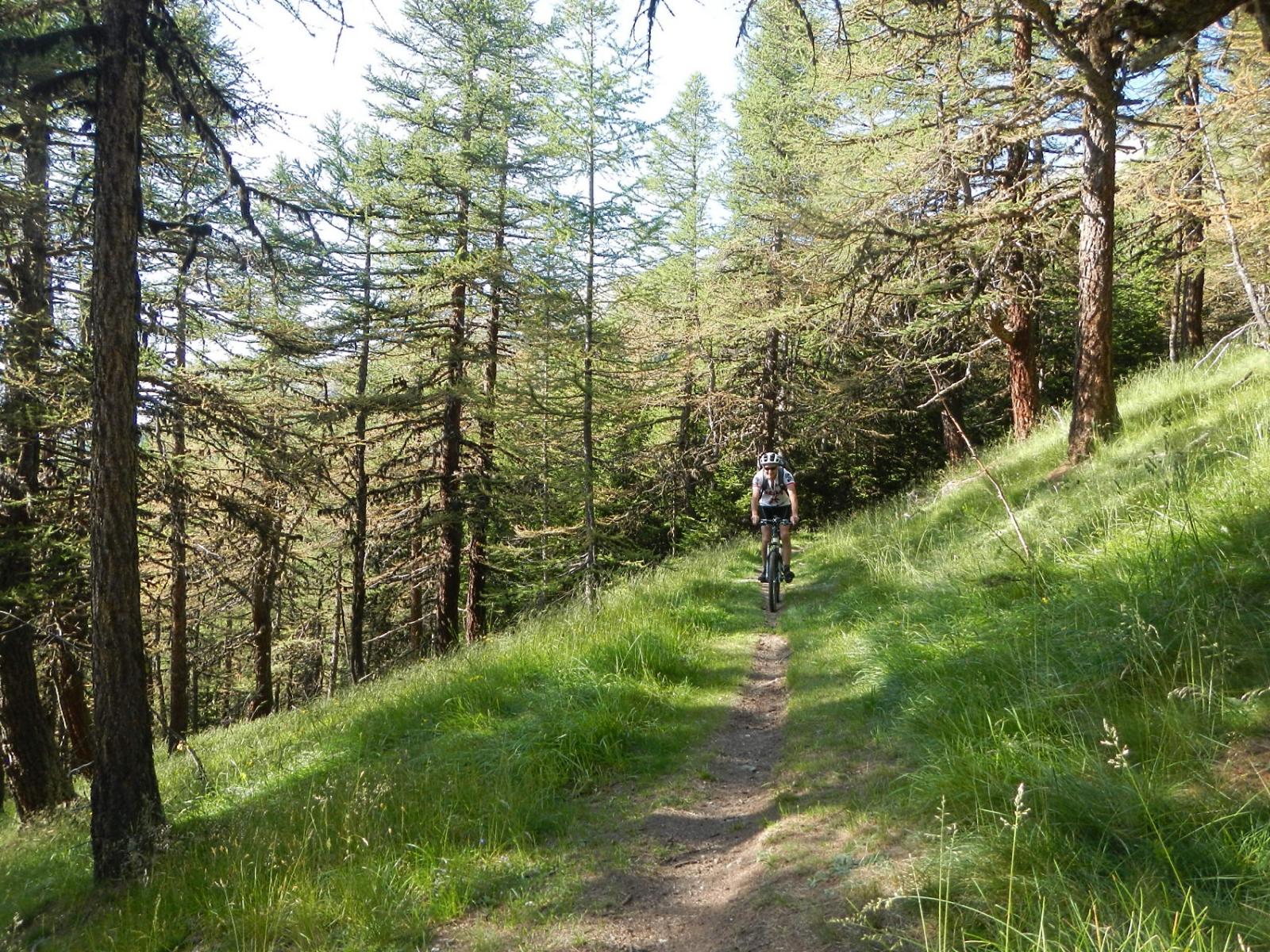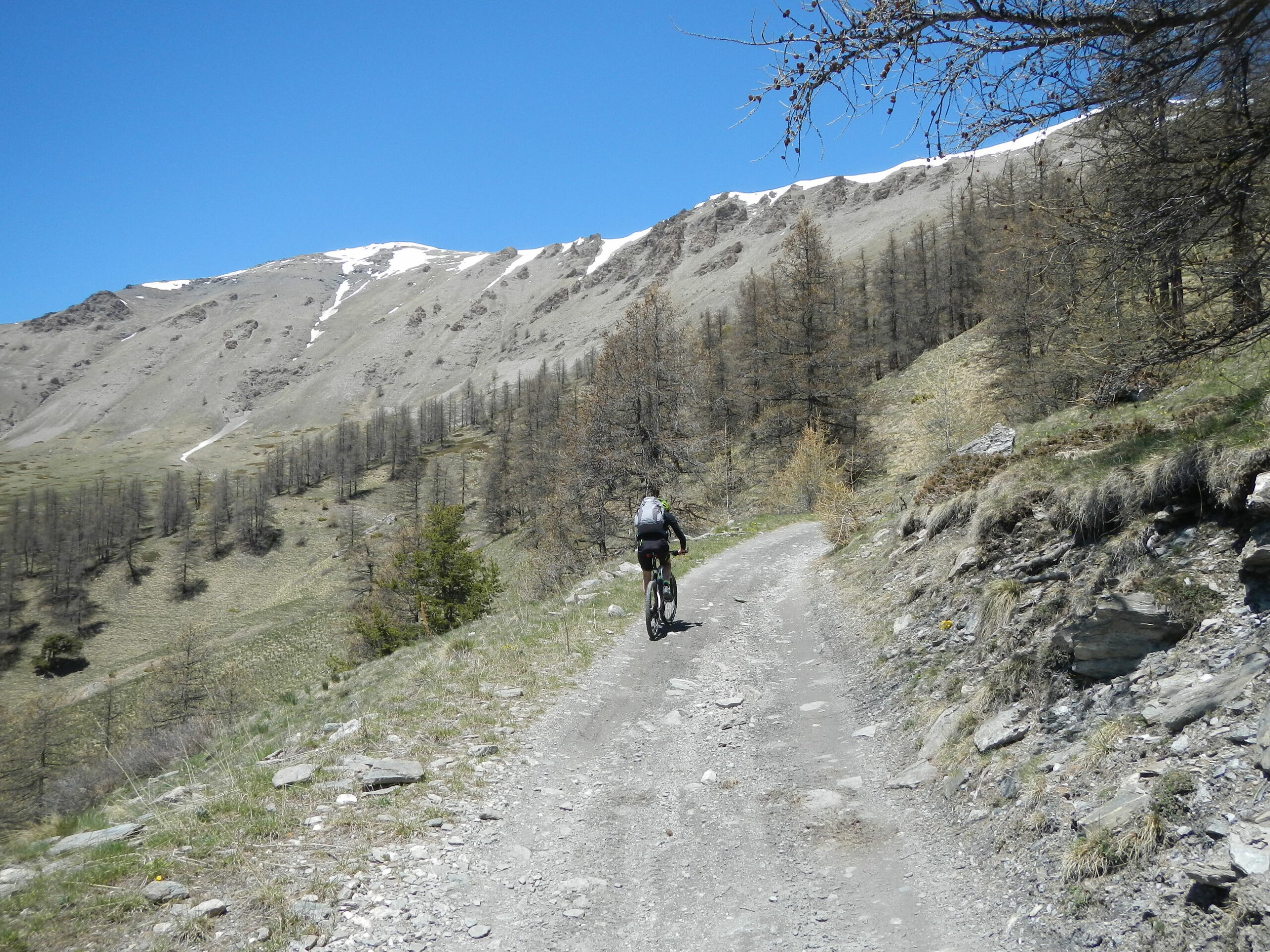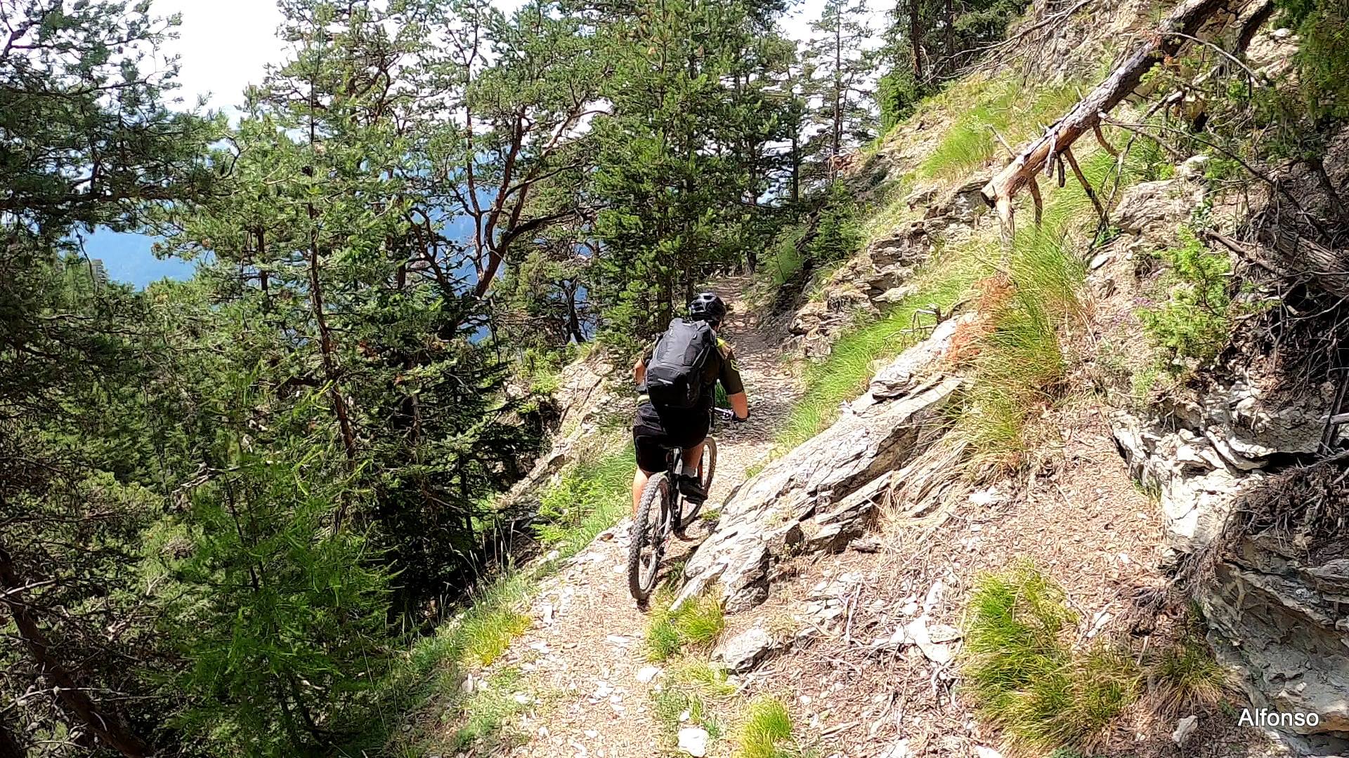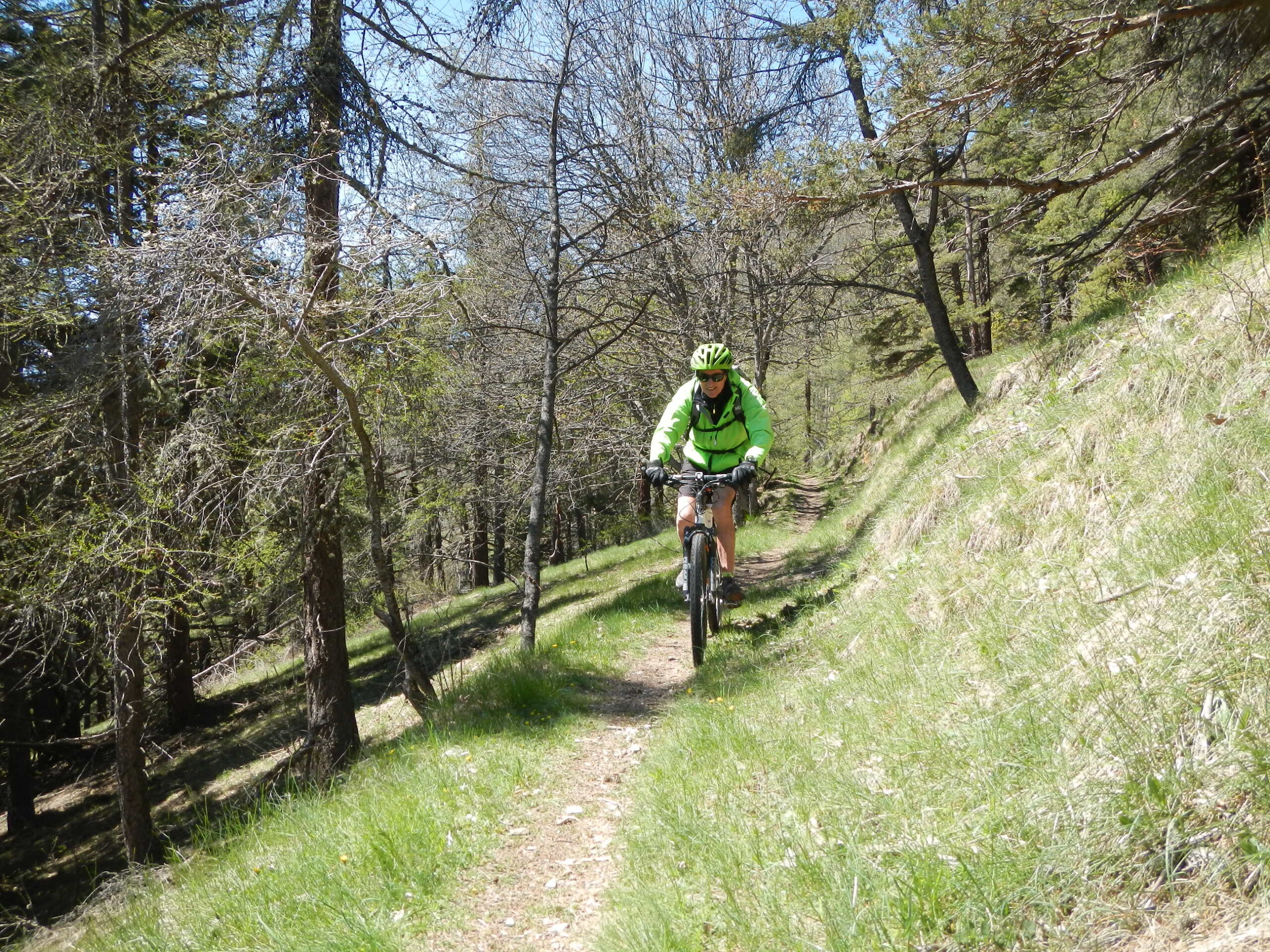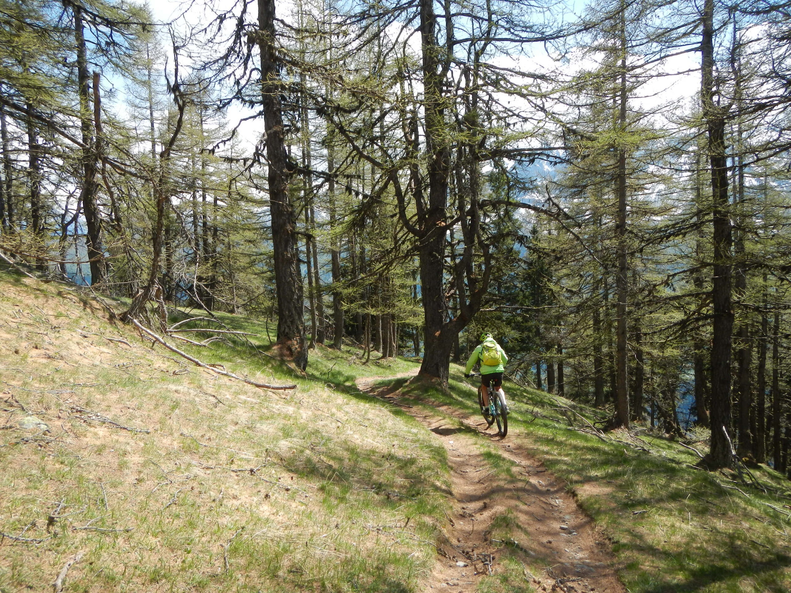 Proprio di fianco all’ingresso del forte prendere sulla sinistra il sentiero indicazioni Millaures / Suppas, sempre molto evidente e ben segnalato (sono presenti anche cartelli indicatori MTB della Federazione Francese). La discesa si svolge quasi interamente in uno splendido bosco di conifere, il sentiero è bellissimo e interamente ciclabile, presentando solo pochissimi e brevi passaggi più impegnativi per fondo e pendenza.