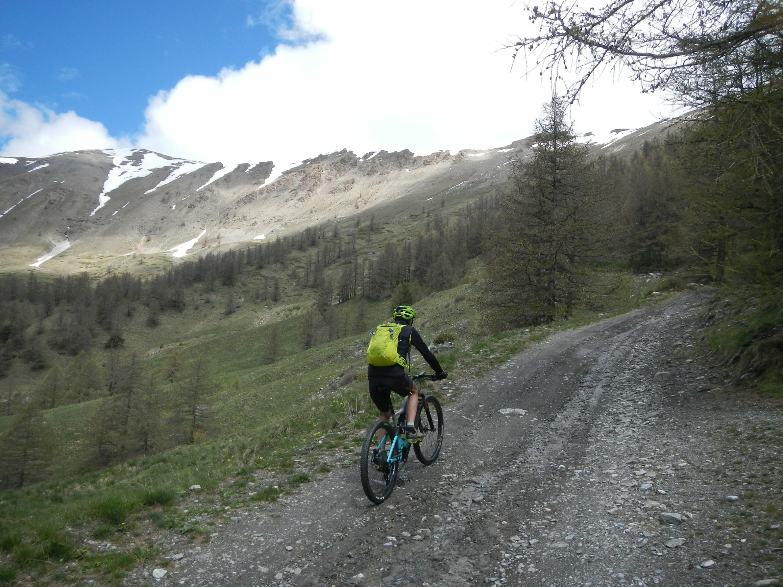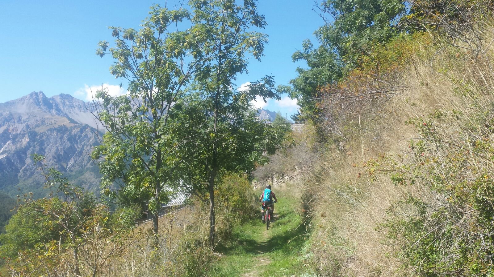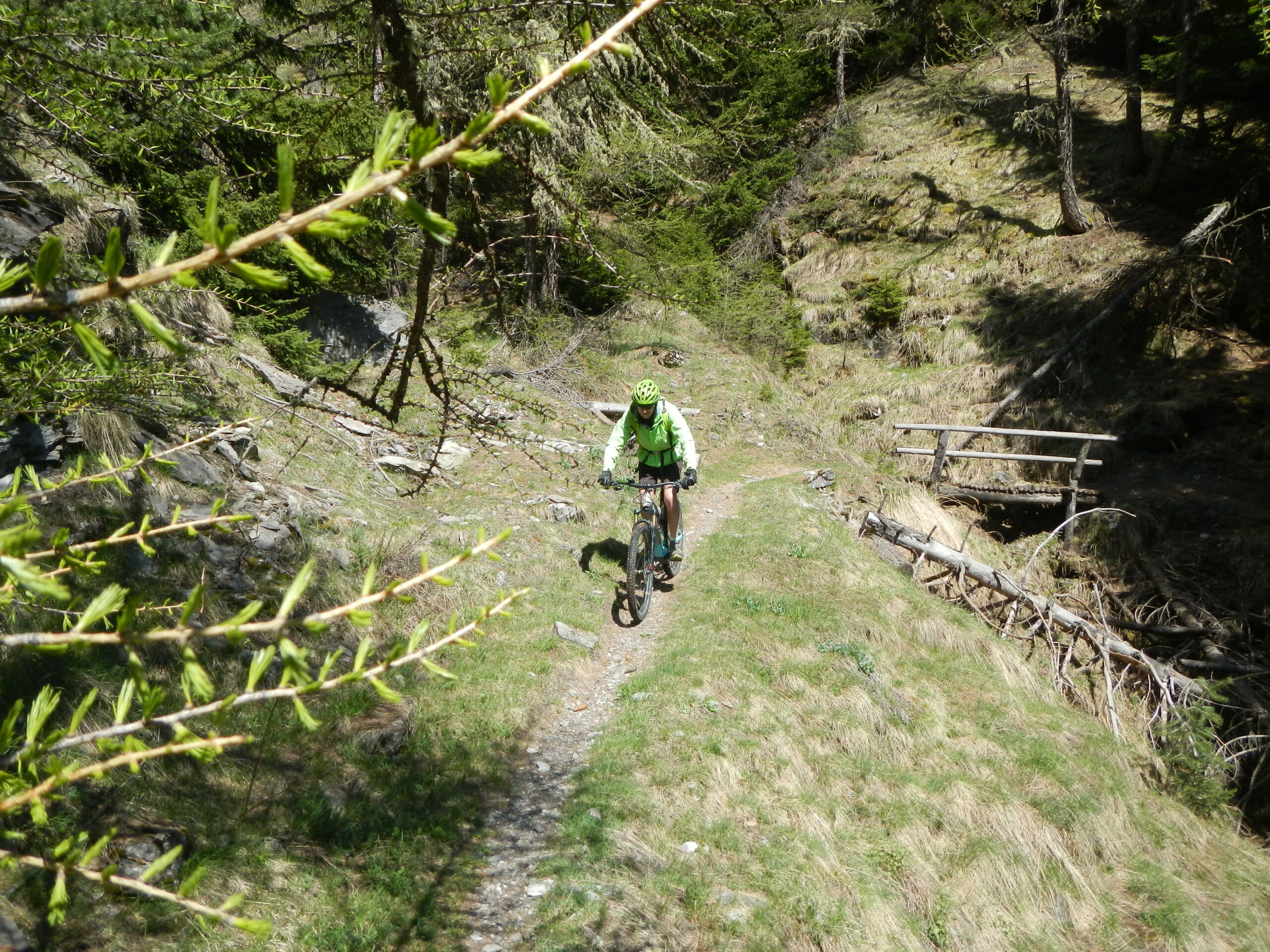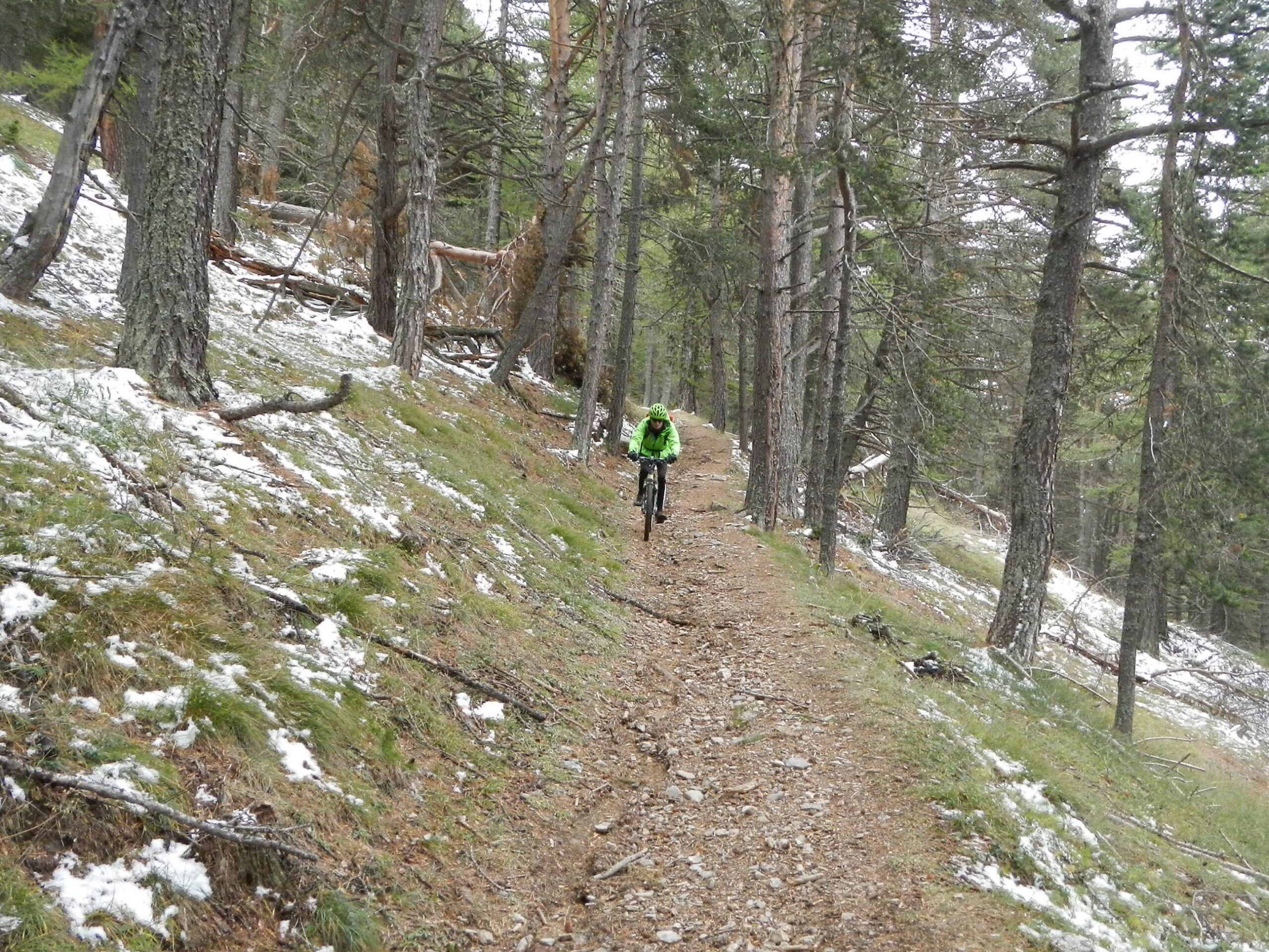 Proprio di fianco all’ingresso del forte prendere sulla sinistra il sentiero indicazioni Millaures / Suppas, sempre molto evidente e ben segnalato (sono presenti anche cartelli indicatori MTB della Federazione Francese). La discesa si svolge quasi interamente in uno splendido bosco di conifere, il sentiero è bellissimo e interamente ciclabile, presentando solo pochissimi e brevi passaggi più impegnativi per fondo e pendenza.